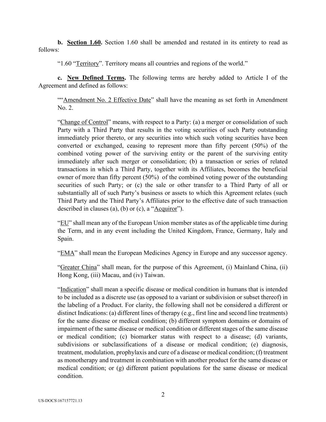 2 US-DOCS\167157721.13 b. Section 1.60. Section 1.60 shall be amended and restated in its entirety to read as follows: “1.60 “Territory”. Territory means all countries and regions of the world.” c. New Defined Terms. The following terms are hereby added to Article I of the Agreement and defined as follows: ““Amendment No. 2 Effective Date” shall have the meaning as set forth in Amendment No. 2. “Change of Control” means, with respect to a Party: (a) a merger or consolidation of such Party with a Third Party that results in the voting securities of such Party outstanding immediately prior thereto, or any securities into which such voting securities have been converted or exchanged, ceasing to represent more than fifty percent (50%) of the combined voting power of the surviving entity or the parent of the surviving entity immediately after such merger or consolidation; (b) a transaction or series of related transactions in which a Third Party, together with its Affiliates, becomes the beneficial owner of more than fifty percent (50%) of the combined voting power of the outstanding securities of such Party; or (c) the sale or other transfer to a Third Party of all or substantially all of such Party’s business or assets to which this Agreement relates (such Third Party and the Third Party’s Affiliates prior to the effective date of such transaction described in clauses (a), (b) or (c), a “Acquiror”). “EU” shall mean any of the European Union member states as of the applicable time during the Term, and in any event including the United Kingdom, France, Germany, Italy and Spain. “EMA” shall mean the European Medicines Agency in Europe and any successor agency. “Greater China” shall mean, for the purpose of this Agreement, (i) Mainland China, (ii) Hong Kong, (iii) Macau, and (iv) Taiwan. “Indication” shall mean a specific disease or medical condition in humans that is intended to be included as a discrete use (as opposed to a variant or subdivision or subset thereof) in the labeling of a Product. For clarity, the following shall not be considered a different or distinct Indications: (a) different lines of therapy (e.g., first line and second line treatments) for the same disease or medical condition; (b) different symptom domains or domains of impairment of the same disease or medical condition or different stages of the same disease or medical condition; (c) biomarker status with respect to a disease; (d) variants, subdivisions or subclassifications of a disease or medical condition; (e) diagnosis, treatment, modulation, prophylaxis and cure of a disease or medical condition; (f) treatment as monotherapy and treatment in combination with another product for the same disease or medical condition; or (g) different patient populations for the same disease or medical condition.