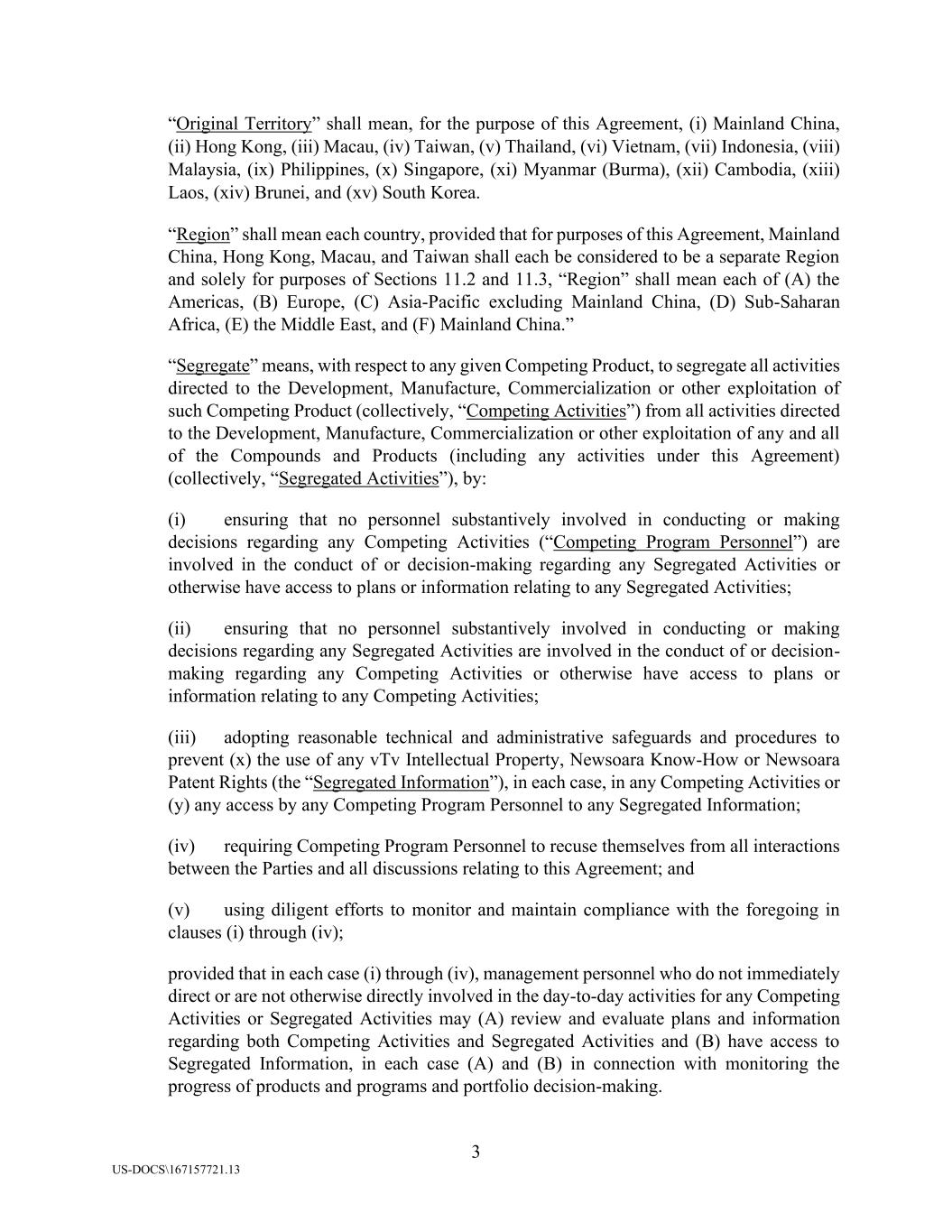 3 US-DOCS\167157721.13 “Original Territory” shall mean, for the purpose of this Agreement, (i) Mainland China, (ii) Hong Kong, (iii) Macau, (iv) Taiwan, (v) Thailand, (vi) Vietnam, (vii) Indonesia, (viii) Malaysia, (ix) Philippines, (x) Singapore, (xi) Myanmar (Burma), (xii) Cambodia, (xiii) Laos, (xiv) Brunei, and (xv) South Korea. “Region” shall mean each country, provided that for purposes of this Agreement, Mainland China, Hong Kong, Macau, and Taiwan shall each be considered to be a separate Region and solely for purposes of Sections 11.2 and 11.3, “Region” shall mean each of (A) the Americas, (B) Europe, (C) Asia-Pacific excluding Mainland China, (D) Sub-Saharan Africa, (E) the Middle East, and (F) Mainland China.” “Segregate” means, with respect to any given Competing Product, to segregate all activities directed to the Development, Manufacture, Commercialization or other exploitation of such Competing Product (collectively, “Competing Activities”) from all activities directed to the Development, Manufacture, Commercialization or other exploitation of any and all of the Compounds and Products (including any activities under this Agreement) (collectively, “Segregated Activities”), by: (i) ensuring that no personnel substantively involved in conducting or making decisions regarding any Competing Activities (“Competing Program Personnel”) are involved in the conduct of or decision-making regarding any Segregated Activities or otherwise have access to plans or information relating to any Segregated Activities; (ii) ensuring that no personnel substantively involved in conducting or making decisions regarding any Segregated Activities are involved in the conduct of or decision- making regarding any Competing Activities or otherwise have access to plans or information relating to any Competing Activities; (iii) adopting reasonable technical and administrative safeguards and procedures to prevent (x) the use of any vTv Intellectual Property, Newsoara Know-How or Newsoara Patent Rights (the “Segregated Information”), in each case, in any Competing Activities or (y) any access by any Competing Program Personnel to any Segregated Information; (iv) requiring Competing Program Personnel to recuse themselves from all interactions between the Parties and all discussions relating to this Agreement; and (v) using diligent efforts to monitor and maintain compliance with the foregoing in clauses (i) through (iv); provided that in each case (i) through (iv), management personnel who do not immediately direct or are not otherwise directly involved in the day-to-day activities for any Competing Activities or Segregated Activities may (A) review and evaluate plans and information regarding both Competing Activities and Segregated Activities and (B) have access to Segregated Information, in each case (A) and (B) in connection with monitoring the progress of products and programs and portfolio decision-making.