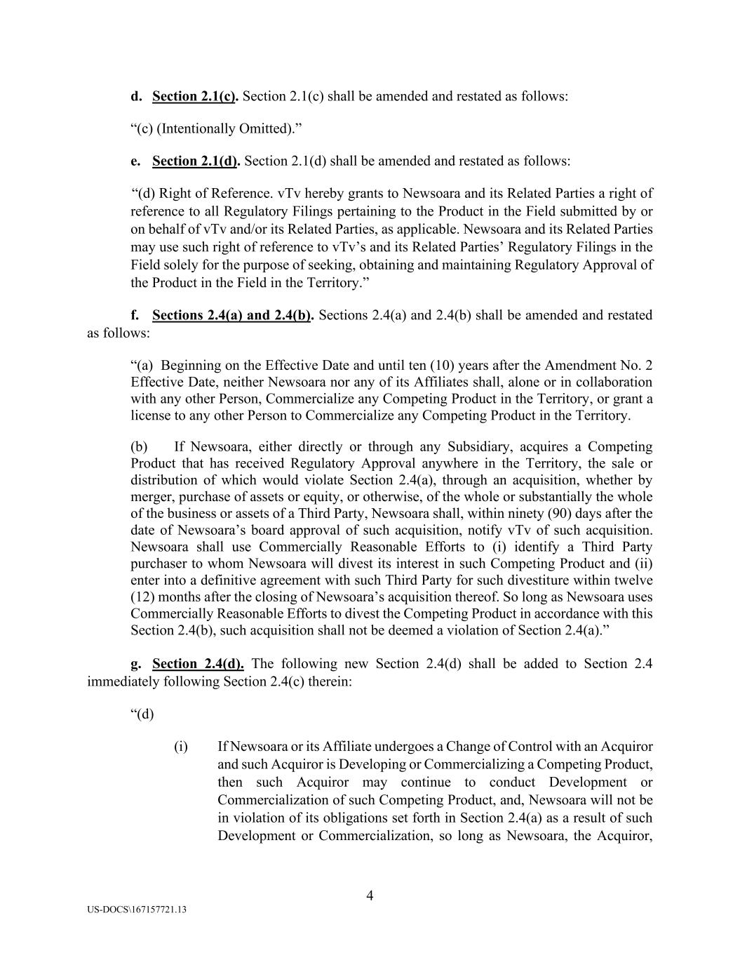 4 US-DOCS\167157721.13 d. Section 2.1(c). Section 2.1(c) shall be amended and restated as follows: “(c) (Intentionally Omitted).” e. Section 2.1(d). Section 2.1(d) shall be amended and restated as follows: “(d) Right of Reference. vTv hereby grants to Newsoara and its Related Parties a right of reference to all Regulatory Filings pertaining to the Product in the Field submitted by or on behalf of vTv and/or its Related Parties, as applicable. Newsoara and its Related Parties may use such right of reference to vTv’s and its Related Parties’ Regulatory Filings in the Field solely for the purpose of seeking, obtaining and maintaining Regulatory Approval of the Product in the Field in the Territory.” f. Sections 2.4(a) and 2.4(b). Sections 2.4(a) and 2.4(b) shall be amended and restated as follows: “(a) Beginning on the Effective Date and until ten (10) years after the Amendment No. 2 Effective Date, neither Newsoara nor any of its Affiliates shall, alone or in collaboration with any other Person, Commercialize any Competing Product in the Territory, or grant a license to any other Person to Commercialize any Competing Product in the Territory. (b) If Newsoara, either directly or through any Subsidiary, acquires a Competing Product that has received Regulatory Approval anywhere in the Territory, the sale or distribution of which would violate Section 2.4(a), through an acquisition, whether by merger, purchase of assets or equity, or otherwise, of the whole or substantially the whole of the business or assets of a Third Party, Newsoara shall, within ninety (90) days after the date of Newsoara’s board approval of such acquisition, notify vTv of such acquisition. Newsoara shall use Commercially Reasonable Efforts to (i) identify a Third Party purchaser to whom Newsoara will divest its interest in such Competing Product and (ii) enter into a definitive agreement with such Third Party for such divestiture within twelve (12) months after the closing of Newsoara’s acquisition thereof. So long as Newsoara uses Commercially Reasonable Efforts to divest the Competing Product in accordance with this Section 2.4(b), such acquisition shall not be deemed a violation of Section 2.4(a).” g. Section 2.4(d). The following new Section 2.4(d) shall be added to Section 2.4 immediately following Section 2.4(c) therein: “(d) (i) If Newsoara or its Affiliate undergoes a Change of Control with an Acquiror and such Acquiror is Developing or Commercializing a Competing Product, then such Acquiror may continue to conduct Development or Commercialization of such Competing Product, and, Newsoara will not be in violation of its obligations set forth in Section 2.4(a) as a result of such Development or Commercialization, so long as Newsoara, the Acquiror,