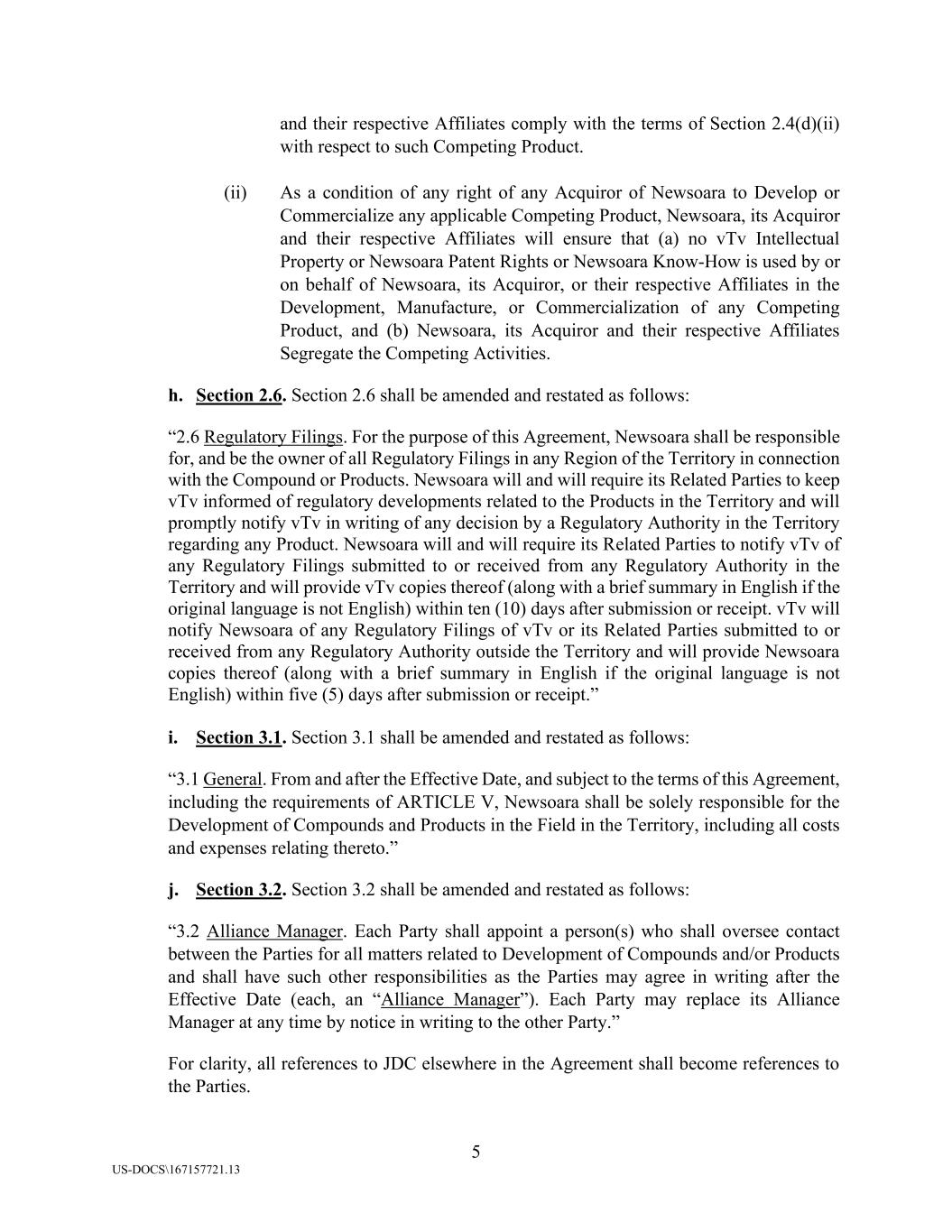 5 US-DOCS\167157721.13 and their respective Affiliates comply with the terms of Section 2.4(d)(ii) with respect to such Competing Product. (ii) As a condition of any right of any Acquiror of Newsoara to Develop or Commercialize any applicable Competing Product, Newsoara, its Acquiror and their respective Affiliates will ensure that (a) no vTv Intellectual Property or Newsoara Patent Rights or Newsoara Know-How is used by or on behalf of Newsoara, its Acquiror, or their respective Affiliates in the Development, Manufacture, or Commercialization of any Competing Product, and (b) Newsoara, its Acquiror and their respective Affiliates Segregate the Competing Activities. h. Section 2.6. Section 2.6 shall be amended and restated as follows: “2.6 Regulatory Filings. For the purpose of this Agreement, Newsoara shall be responsible for, and be the owner of all Regulatory Filings in any Region of the Territory in connection with the Compound or Products. Newsoara will and will require its Related Parties to keep vTv informed of regulatory developments related to the Products in the Territory and will promptly notify vTv in writing of any decision by a Regulatory Authority in the Territory regarding any Product. Newsoara will and will require its Related Parties to notify vTv of any Regulatory Filings submitted to or received from any Regulatory Authority in the Territory and will provide vTv copies thereof (along with a brief summary in English if the original language is not English) within ten (10) days after submission or receipt. vTv will notify Newsoara of any Regulatory Filings of vTv or its Related Parties submitted to or received from any Regulatory Authority outside the Territory and will provide Newsoara copies thereof (along with a brief summary in English if the original language is not English) within five (5) days after submission or receipt.” i. Section 3.1. Section 3.1 shall be amended and restated as follows: “3.1 General. From and after the Effective Date, and subject to the terms of this Agreement, including the requirements of ARTICLE V, Newsoara shall be solely responsible for the Development of Compounds and Products in the Field in the Territory, including all costs and expenses relating thereto.” j. Section 3.2. Section 3.2 shall be amended and restated as follows: “3.2 Alliance Manager. Each Party shall appoint a person(s) who shall oversee contact between the Parties for all matters related to Development of Compounds and/or Products and shall have such other responsibilities as the Parties may agree in writing after the Effective Date (each, an “Alliance Manager”). Each Party may replace its Alliance Manager at any time by notice in writing to the other Party.” For clarity, all references to JDC elsewhere in the Agreement shall become references to the Parties.