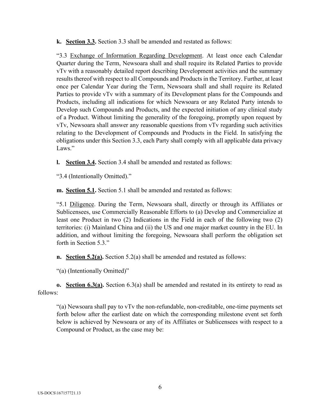 6 US-DOCS\167157721.13 k. Section 3.3. Section 3.3 shall be amended and restated as follows: “3.3 Exchange of Information Regarding Development. At least once each Calendar Quarter during the Term, Newsoara shall and shall require its Related Parties to provide vTv with a reasonably detailed report describing Development activities and the summary results thereof with respect to all Compounds and Products in the Territory. Further, at least once per Calendar Year during the Term, Newsoara shall and shall require its Related Parties to provide vTv with a summary of its Development plans for the Compounds and Products, including all indications for which Newsoara or any Related Party intends to Develop such Compounds and Products, and the expected initiation of any clinical study of a Product. Without limiting the generality of the foregoing, promptly upon request by vTv, Newsoara shall answer any reasonable questions from vTv regarding such activities relating to the Development of Compounds and Products in the Field. In satisfying the obligations under this Section 3.3, each Party shall comply with all applicable data privacy Laws.” l. Section 3.4. Section 3.4 shall be amended and restated as follows: “3.4 (Intentionally Omitted).” m. Section 5.1. Section 5.1 shall be amended and restated as follows: “5.1 Diligence. During the Term, Newsoara shall, directly or through its Affiliates or Sublicensees, use Commercially Reasonable Efforts to (a) Develop and Commercialize at least one Product in two (2) Indications in the Field in each of the following two (2) territories: (i) Mainland China and (ii) the US and one major market country in the EU. In addition, and without limiting the foregoing, Newsoara shall perform the obligation set forth in Section 5.3.” n. Section 5.2(a). Section 5.2(a) shall be amended and restated as follows: “(a) (Intentionally Omitted)” o. Section 6.3(a). Section 6.3(a) shall be amended and restated in its entirety to read as follows: “(a) Newsoara shall pay to vTv the non-refundable, non-creditable, one-time payments set forth below after the earliest date on which the corresponding milestone event set forth below is achieved by Newsoara or any of its Affiliates or Sublicensees with respect to a Compound or Product, as the case may be: