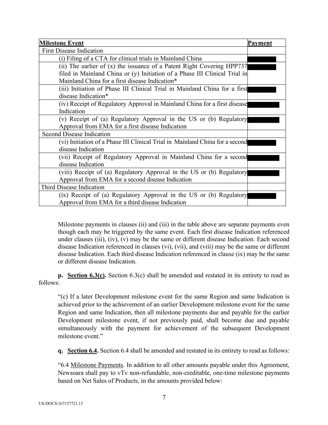 7 US-DOCS\167157721.13 Milestone Event Payment First Disease Indication (i) Filing of a CTA for clinical trials in Mainland China (ii) The earlier of (x) the issuance of a Patent Right Covering HPP737 filed in Mainland China or (y) Initiation of a Phase III Clinical Trial in Mainland China for a first disease Indication* (iii) Initiation of Phase III Clinical Trial in Mainland China for a first disease Indication* (iv) Receipt of Regulatory Approval in Mainland China for a first disease Indication (v) Receipt of (a) Regulatory Approval in the US or (b) Regulatory Approval from EMA for a first disease Indication Second Disease Indication (vi) Initiation of a Phase III Clinical Trial in Mainland China for a second disease Indication (vii) Receipt of Regulatory Approval in Mainland China for a second disease Indication (viii) Receipt of (a) Regulatory Approval in the US or (b) Regulatory Approval from EMA for a second disease Indication Third Disease Indication (ix) Receipt of (a) Regulatory Approval in the US or (b) Regulatory Approval from EMA for a third disease Indication Milestone payments in clauses (ii) and (iii) in the table above are separate payments even though each may be triggered by the same event. Each first disease Indication referenced under clauses (iii), (iv), (v) may be the same or different disease Indication. Each second disease Indication referenced in clauses (vi), (vii), and (viii) may be the same or different disease Indication. Each third disease Indication referenced in clause (ix) may be the same or different disease Indication. p. Section 6.3(c). Section 6.3(c) shall be amended and restated in its entirety to read as follows: “(c) If a later Development milestone event for the same Region and same Indication is achieved prior to the achievement of an earlier Development milestone event for the same Region and same Indication, then all milestone payments due and payable for the earlier Development milestone event, if not previously paid, shall become due and payable simultaneously with the payment for achievement of the subsequent Development milestone event.” q. Section 6.4. Section 6.4 shall be amended and restated in its entirety to read as follows: “6.4 Milestone Payments. In addition to all other amounts payable under this Agreement, Newsoara shall pay to vTv non-refundable, non-creditable, one-time milestone payments based on Net Sales of Products, in the amounts provided below: