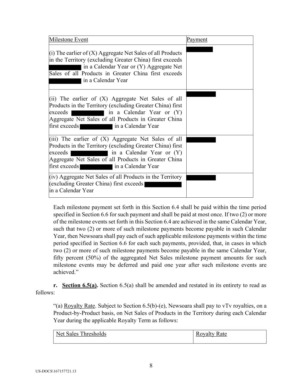 8 US-DOCS\167157721.13 Milestone Event Payment (i) The earlier of (X) Aggregate Net Sales of all Products in the Territory (excluding Greater China) first exceeds in a Calendar Year or (Y) Aggregate Net Sales of all Products in Greater China first exceeds in a Calendar Year (ii) The earlier of (X) Aggregate Net Sales of all Products in the Territory (excluding Greater China) first exceeds in a Calendar Year or (Y) Aggregate Net Sales of all Products in Greater China first exceeds in a Calendar Year (iii) The earlier of (X) Aggregate Net Sales of all Products in the Territory (excluding Greater China) first exceeds in a Calendar Year or (Y) Aggregate Net Sales of all Products in Greater China first exceeds in a Calendar Year (iv) Aggregate Net Sales of all Products in the Territory (excluding Greater China) first exceeds in a Calendar Year Each milestone payment set forth in this Section 6.4 shall be paid within the time period specified in Section 6.6 for such payment and shall be paid at most once. If two (2) or more of the milestone events set forth in this Section 6.4 are achieved in the same Calendar Year, such that two (2) or more of such milestone payments become payable in such Calendar Year, then Newsoara shall pay each of such applicable milestone payments within the time period specified in Section 6.6 for each such payments, provided, that, in cases in which two (2) or more of such milestone payments become payable in the same Calendar Year, fifty percent (50%) of the aggregated Net Sales milestone payment amounts for such milestone events may be deferred and paid one year after such milestone events are achieved.” r. Section 6.5(a). Section 6.5(a) shall be amended and restated in its entirety to read as follows: “(a) Royalty Rate. Subject to Section 6.5(b)-(e), Newsoara shall pay to vTv royalties, on a Product-by-Product basis, on Net Sales of Products in the Territory during each Calendar Year during the applicable Royalty Term as follows: Net Sales Thresholds Royalty Rate