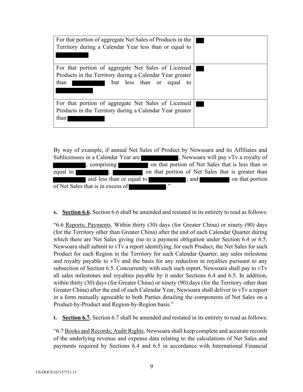 9 US-DOCS\167157721.13 For that portion of aggregate Net Sales of Products in the Territory during a Calendar Year less than or equal to For that portion of aggregate Net Sales of Licensed Products in the Territory during a Calendar Year greater than but less than or equal to For that portion of aggregate Net Sales of Licensed Products in the Territory during a Calendar Year greater than By way of example, if annual Net Sales of Product by Newsoara and its Affiliates and Sublicensees in a Calendar Year are , Newsoara will pay vTv a royalty of , comprising on that portion of Net Sales that is less than or equal to ; on that portion of Net Sales that is greater than and less than or equal to ; and on that portion of Net Sales that is in excess of .” s. Section 6.6. Section 6.6 shall be amended and restated in its entirety to read as follows: “6.6 Reports; Payments. Within thirty (30) days (for Greater China) or ninety (90) days (for the Territory other than Greater China) after the end of each Calendar Quarter during which there are Net Sales giving rise to a payment obligation under Section 6.4 or 6.5, Newsoara shall submit to vTv a report identifying, for each Product, the Net Sales for such Product for each Region in the Territory for such Calendar Quarter, any sales milestone and royalty payable to vTv and the basis for any reduction in royalties pursuant to any subsection of Section 6.5. Concurrently with each such report, Newsoara shall pay to vTv all sales milestones and royalties payable by it under Sections 6.4 and 6.5. In addition, within thirty (30) days (for Greater China) or ninety (90) days (for the Territory other than Greater China) after the end of each Calendar Year, Newsoara shall deliver to vTv a report in a form mutually agreeable to both Parties detailing the components of Net Sales on a Product-by-Product and Region-by-Region basis.” t. Section 6.7. Section 6.7 shall be amended and restated in its entirety to read as follows: “6.7 Books and Records; Audit Rights. Newsoara shall keep complete and accurate records of the underlying revenue and expense data relating to the calculations of Net Sales and payments required by Sections 6.4 and 6.5 in accordance with International Financial