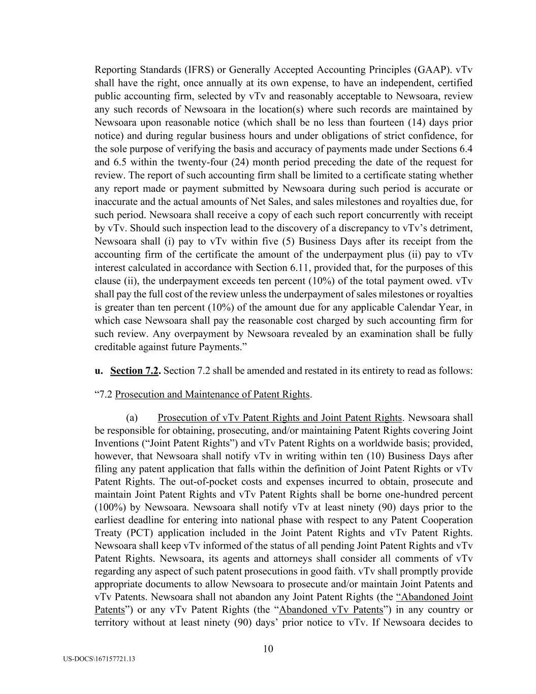 10 US-DOCS\167157721.13 Reporting Standards (IFRS) or Generally Accepted Accounting Principles (GAAP). vTv shall have the right, once annually at its own expense, to have an independent, certified public accounting firm, selected by vTv and reasonably acceptable to Newsoara, review any such records of Newsoara in the location(s) where such records are maintained by Newsoara upon reasonable notice (which shall be no less than fourteen (14) days prior notice) and during regular business hours and under obligations of strict confidence, for the sole purpose of verifying the basis and accuracy of payments made under Sections 6.4 and 6.5 within the twenty-four (24) month period preceding the date of the request for review. The report of such accounting firm shall be limited to a certificate stating whether any report made or payment submitted by Newsoara during such period is accurate or inaccurate and the actual amounts of Net Sales, and sales milestones and royalties due, for such period. Newsoara shall receive a copy of each such report concurrently with receipt by vTv. Should such inspection lead to the discovery of a discrepancy to vTv’s detriment, Newsoara shall (i) pay to vTv within five (5) Business Days after its receipt from the accounting firm of the certificate the amount of the underpayment plus (ii) pay to vTv interest calculated in accordance with Section 6.11, provided that, for the purposes of this clause (ii), the underpayment exceeds ten percent (10%) of the total payment owed. vTv shall pay the full cost of the review unless the underpayment of sales milestones or royalties is greater than ten percent (10%) of the amount due for any applicable Calendar Year, in which case Newsoara shall pay the reasonable cost charged by such accounting firm for such review. Any overpayment by Newsoara revealed by an examination shall be fully creditable against future Payments.” u. Section 7.2. Section 7.2 shall be amended and restated in its entirety to read as follows: “7.2 Prosecution and Maintenance of Patent Rights. (a) Prosecution of vTv Patent Rights and Joint Patent Rights. Newsoara shall be responsible for obtaining, prosecuting, and/or maintaining Patent Rights covering Joint Inventions (“Joint Patent Rights”) and vTv Patent Rights on a worldwide basis; provided, however, that Newsoara shall notify vTv in writing within ten (10) Business Days after filing any patent application that falls within the definition of Joint Patent Rights or vTv Patent Rights. The out-of-pocket costs and expenses incurred to obtain, prosecute and maintain Joint Patent Rights and vTv Patent Rights shall be borne one-hundred percent (100%) by Newsoara. Newsoara shall notify vTv at least ninety (90) days prior to the earliest deadline for entering into national phase with respect to any Patent Cooperation Treaty (PCT) application included in the Joint Patent Rights and vTv Patent Rights. Newsoara shall keep vTv informed of the status of all pending Joint Patent Rights and vTv Patent Rights. Newsoara, its agents and attorneys shall consider all comments of vTv regarding any aspect of such patent prosecutions in good faith. vTv shall promptly provide appropriate documents to allow Newsoara to prosecute and/or maintain Joint Patents and vTv Patents. Newsoara shall not abandon any Joint Patent Rights (the “Abandoned Joint Patents”) or any vTv Patent Rights (the “Abandoned vTv Patents”) in any country or territory without at least ninety (90) days’ prior notice to vTv. If Newsoara decides to
