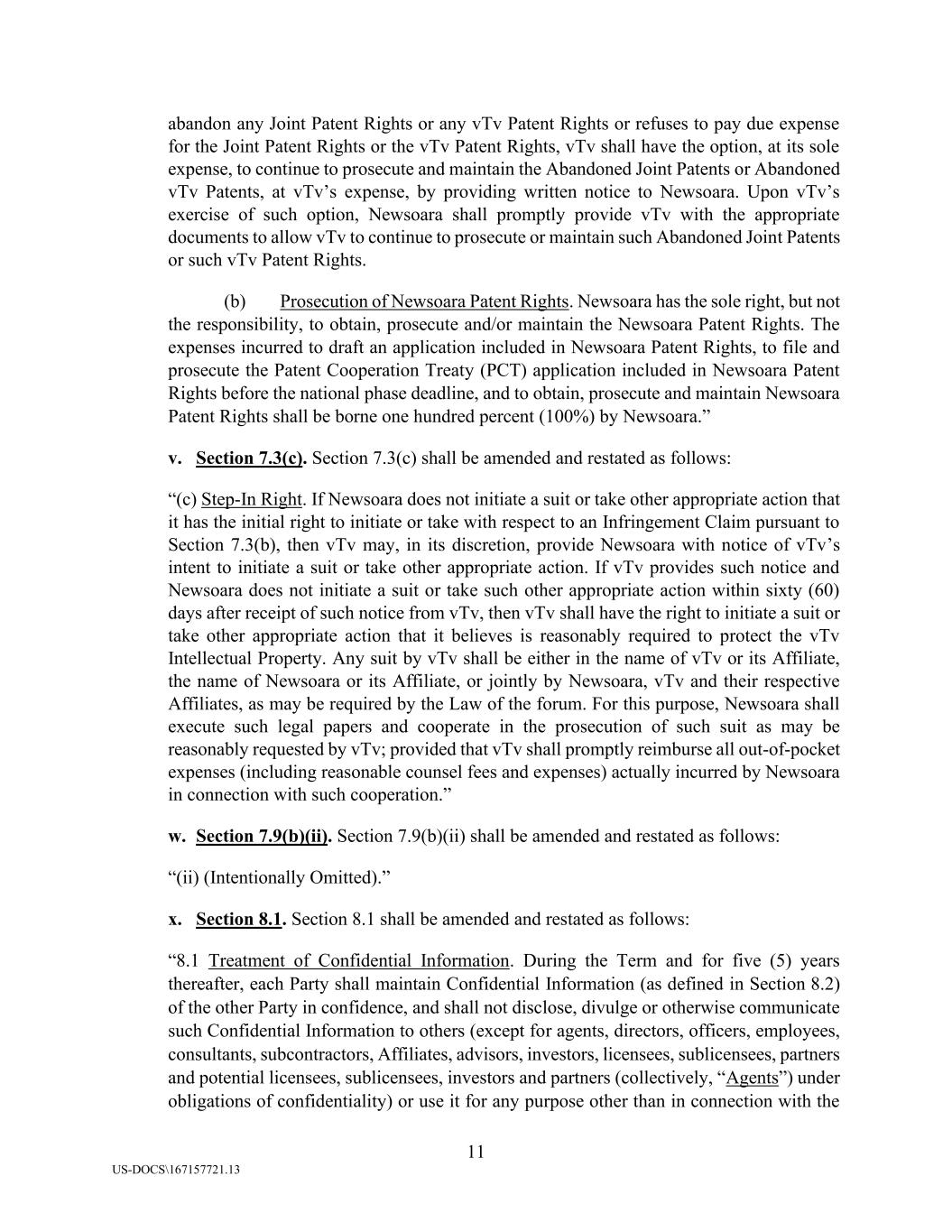 11 US-DOCS\167157721.13 abandon any Joint Patent Rights or any vTv Patent Rights or refuses to pay due expense for the Joint Patent Rights or the vTv Patent Rights, vTv shall have the option, at its sole expense, to continue to prosecute and maintain the Abandoned Joint Patents or Abandoned vTv Patents, at vTv’s expense, by providing written notice to Newsoara. Upon vTv’s exercise of such option, Newsoara shall promptly provide vTv with the appropriate documents to allow vTv to continue to prosecute or maintain such Abandoned Joint Patents or such vTv Patent Rights. (b) Prosecution of Newsoara Patent Rights. Newsoara has the sole right, but not the responsibility, to obtain, prosecute and/or maintain the Newsoara Patent Rights. The expenses incurred to draft an application included in Newsoara Patent Rights, to file and prosecute the Patent Cooperation Treaty (PCT) application included in Newsoara Patent Rights before the national phase deadline, and to obtain, prosecute and maintain Newsoara Patent Rights shall be borne one hundred percent (100%) by Newsoara.” v. Section 7.3(c). Section 7.3(c) shall be amended and restated as follows: “(c) Step-In Right. If Newsoara does not initiate a suit or take other appropriate action that it has the initial right to initiate or take with respect to an Infringement Claim pursuant to Section 7.3(b), then vTv may, in its discretion, provide Newsoara with notice of vTv’s intent to initiate a suit or take other appropriate action. If vTv provides such notice and Newsoara does not initiate a suit or take such other appropriate action within sixty (60) days after receipt of such notice from vTv, then vTv shall have the right to initiate a suit or take other appropriate action that it believes is reasonably required to protect the vTv Intellectual Property. Any suit by vTv shall be either in the name of vTv or its Affiliate, the name of Newsoara or its Affiliate, or jointly by Newsoara, vTv and their respective Affiliates, as may be required by the Law of the forum. For this purpose, Newsoara shall execute such legal papers and cooperate in the prosecution of such suit as may be reasonably requested by vTv; provided that vTv shall promptly reimburse all out-of-pocket expenses (including reasonable counsel fees and expenses) actually incurred by Newsoara in connection with such cooperation.” w. Section 7.9(b)(ii). Section 7.9(b)(ii) shall be amended and restated as follows: “(ii) (Intentionally Omitted).” x. Section 8.1. Section 8.1 shall be amended and restated as follows: “8.1 Treatment of Confidential Information. During the Term and for five (5) years thereafter, each Party shall maintain Confidential Information (as defined in Section 8.2) of the other Party in confidence, and shall not disclose, divulge or otherwise communicate such Confidential Information to others (except for agents, directors, officers, employees, consultants, subcontractors, Affiliates, advisors, investors, licensees, sublicensees, partners and potential licensees, sublicensees, investors and partners (collectively, “Agents”) under obligations of confidentiality) or use it for any purpose other than in connection with the
