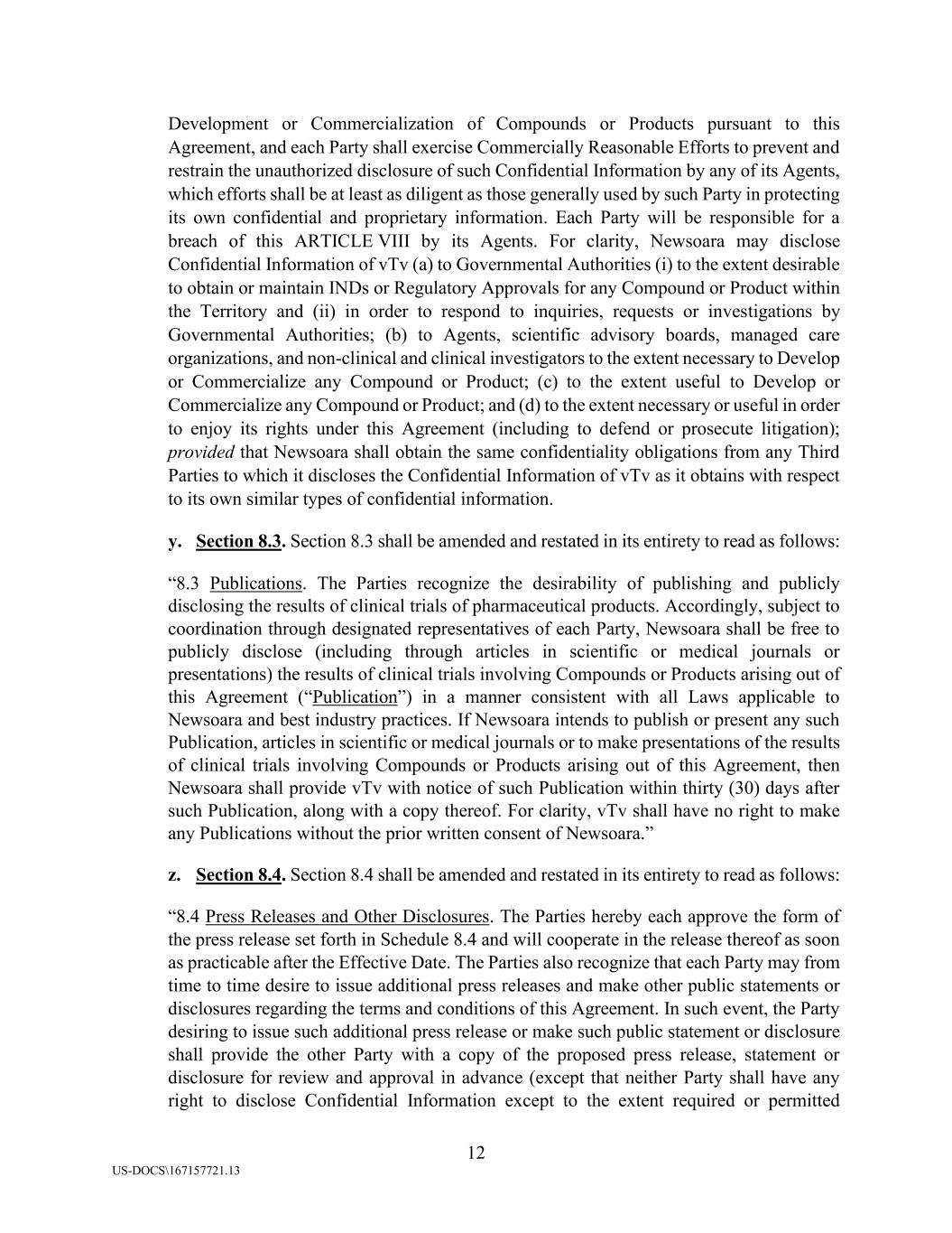 12 US-DOCS\167157721.13 Development or Commercialization of Compounds or Products pursuant to this Agreement, and each Party shall exercise Commercially Reasonable Efforts to prevent and restrain the unauthorized disclosure of such Confidential Information by any of its Agents, which efforts shall be at least as diligent as those generally used by such Party in protecting its own confidential and proprietary information. Each Party will be responsible for a breach of this ARTICLE VIII by its Agents. For clarity, Newsoara may disclose Confidential Information of vTv (a) to Governmental Authorities (i) to the extent desirable to obtain or maintain INDs or Regulatory Approvals for any Compound or Product within the Territory and (ii) in order to respond to inquiries, requests or investigations by Governmental Authorities; (b) to Agents, scientific advisory boards, managed care organizations, and non-clinical and clinical investigators to the extent necessary to Develop or Commercialize any Compound or Product; (c) to the extent useful to Develop or Commercialize any Compound or Product; and (d) to the extent necessary or useful in order to enjoy its rights under this Agreement (including to defend or prosecute litigation); provided that Newsoara shall obtain the same confidentiality obligations from any Third Parties to which it discloses the Confidential Information of vTv as it obtains with respect to its own similar types of confidential information. y. Section 8.3. Section 8.3 shall be amended and restated in its entirety to read as follows: “8.3 Publications. The Parties recognize the desirability of publishing and publicly disclosing the results of clinical trials of pharmaceutical products. Accordingly, subject to coordination through designated representatives of each Party, Newsoara shall be free to publicly disclose (including through articles in scientific or medical journals or presentations) the results of clinical trials involving Compounds or Products arising out of this Agreement (“Publication”) in a manner consistent with all Laws applicable to Newsoara and best industry practices. If Newsoara intends to publish or present any such Publication, articles in scientific or medical journals or to make presentations of the results of clinical trials involving Compounds or Products arising out of this Agreement, then Newsoara shall provide vTv with notice of such Publication within thirty (30) days after such Publication, along with a copy thereof. For clarity, vTv shall have no right to make any Publications without the prior written consent of Newsoara.” z. Section 8.4. Section 8.4 shall be amended and restated in its entirety to read as follows: “8.4 Press Releases and Other Disclosures. The Parties hereby each approve the form of the press release set forth in Schedule 8.4 and will cooperate in the release thereof as soon as practicable after the Effective Date. The Parties also recognize that each Party may from time to time desire to issue additional press releases and make other public statements or disclosures regarding the terms and conditions of this Agreement. In such event, the Party desiring to issue such additional press release or make such public statement or disclosure shall provide the other Party with a copy of the proposed press release, statement or disclosure for review and approval in advance (except that neither Party shall have any right to disclose Confidential Information except to the extent required or permitted