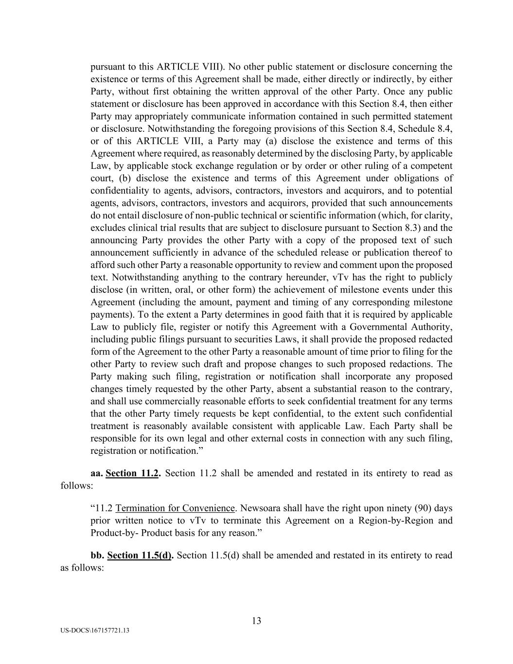 13 US-DOCS\167157721.13 pursuant to this ARTICLE VIII). No other public statement or disclosure concerning the existence or terms of this Agreement shall be made, either directly or indirectly, by either Party, without first obtaining the written approval of the other Party. Once any public statement or disclosure has been approved in accordance with this Section 8.4, then either Party may appropriately communicate information contained in such permitted statement or disclosure. Notwithstanding the foregoing provisions of this Section 8.4, Schedule 8.4, or of this ARTICLE VIII, a Party may (a) disclose the existence and terms of this Agreement where required, as reasonably determined by the disclosing Party, by applicable Law, by applicable stock exchange regulation or by order or other ruling of a competent court, (b) disclose the existence and terms of this Agreement under obligations of confidentiality to agents, advisors, contractors, investors and acquirors, and to potential agents, advisors, contractors, investors and acquirors, provided that such announcements do not entail disclosure of non-public technical or scientific information (which, for clarity, excludes clinical trial results that are subject to disclosure pursuant to Section 8.3) and the announcing Party provides the other Party with a copy of the proposed text of such announcement sufficiently in advance of the scheduled release or publication thereof to afford such other Party a reasonable opportunity to review and comment upon the proposed text. Notwithstanding anything to the contrary hereunder, vTv has the right to publicly disclose (in written, oral, or other form) the achievement of milestone events under this Agreement (including the amount, payment and timing of any corresponding milestone payments). To the extent a Party determines in good faith that it is required by applicable Law to publicly file, register or notify this Agreement with a Governmental Authority, including public filings pursuant to securities Laws, it shall provide the proposed redacted form of the Agreement to the other Party a reasonable amount of time prior to filing for the other Party to review such draft and propose changes to such proposed redactions. The Party making such filing, registration or notification shall incorporate any proposed changes timely requested by the other Party, absent a substantial reason to the contrary, and shall use commercially reasonable efforts to seek confidential treatment for any terms that the other Party timely requests be kept confidential, to the extent such confidential treatment is reasonably available consistent with applicable Law. Each Party shall be responsible for its own legal and other external costs in connection with any such filing, registration or notification.” aa. Section 11.2. Section 11.2 shall be amended and restated in its entirety to read as follows: “11.2 Termination for Convenience. Newsoara shall have the right upon ninety (90) days prior written notice to vTv to terminate this Agreement on a Region-by-Region and Product-by- Product basis for any reason.” bb. Section 11.5(d). Section 11.5(d) shall be amended and restated in its entirety to read as follows: