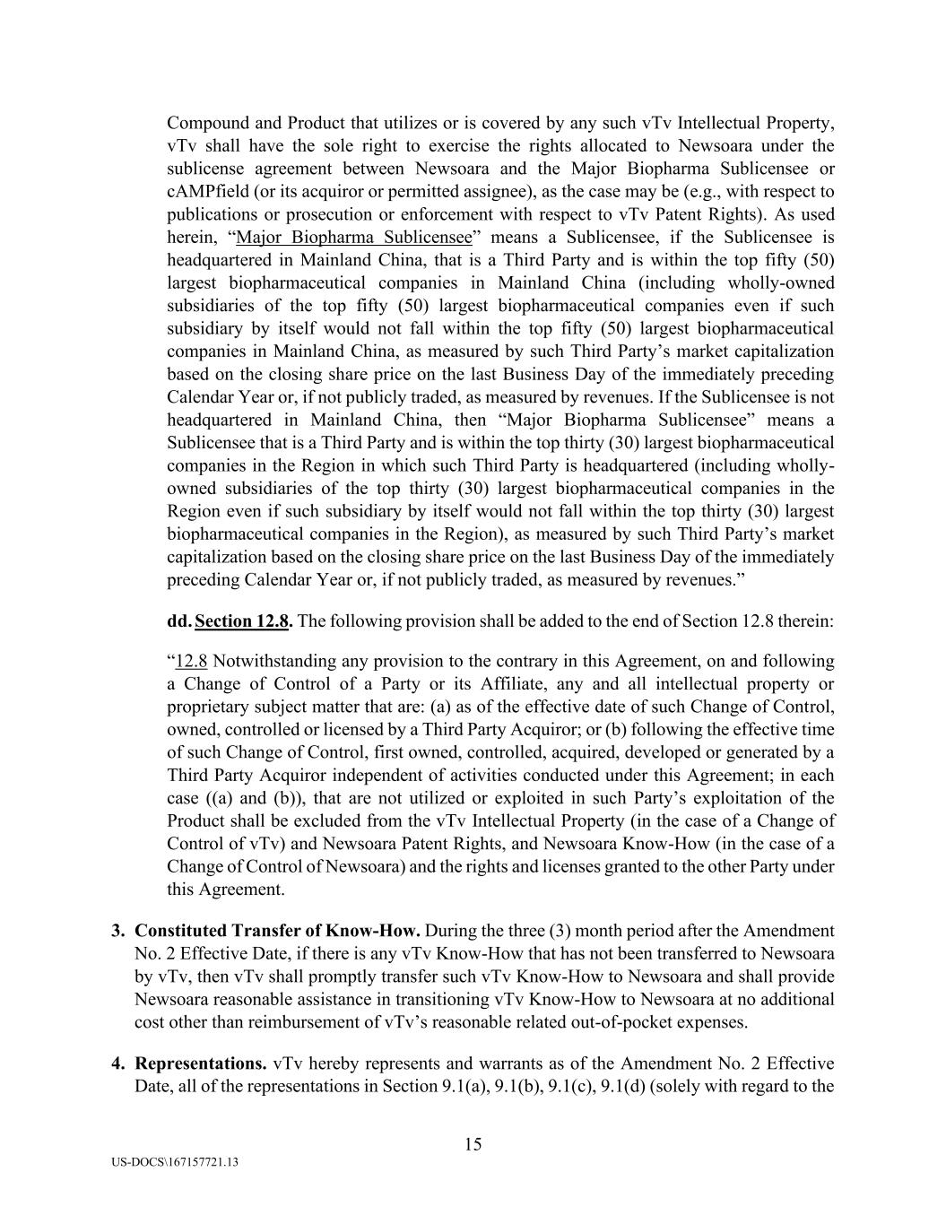 15 US-DOCS\167157721.13 Compound and Product that utilizes or is covered by any such vTv Intellectual Property, vTv shall have the sole right to exercise the rights allocated to Newsoara under the sublicense agreement between Newsoara and the Major Biopharma Sublicensee or cAMPfield (or its acquiror or permitted assignee), as the case may be (e.g., with respect to publications or prosecution or enforcement with respect to vTv Patent Rights). As used herein, “Major Biopharma Sublicensee” means a Sublicensee, if the Sublicensee is headquartered in Mainland China, that is a Third Party and is within the top fifty (50) largest biopharmaceutical companies in Mainland China (including wholly-owned subsidiaries of the top fifty (50) largest biopharmaceutical companies even if such subsidiary by itself would not fall within the top fifty (50) largest biopharmaceutical companies in Mainland China, as measured by such Third Party’s market capitalization based on the closing share price on the last Business Day of the immediately preceding Calendar Year or, if not publicly traded, as measured by revenues. If the Sublicensee is not headquartered in Mainland China, then “Major Biopharma Sublicensee” means a Sublicensee that is a Third Party and is within the top thirty (30) largest biopharmaceutical companies in the Region in which such Third Party is headquartered (including wholly- owned subsidiaries of the top thirty (30) largest biopharmaceutical companies in the Region even if such subsidiary by itself would not fall within the top thirty (30) largest biopharmaceutical companies in the Region), as measured by such Third Party’s market capitalization based on the closing share price on the last Business Day of the immediately preceding Calendar Year or, if not publicly traded, as measured by revenues.” dd. Section 12.8. The following provision shall be added to the end of Section 12.8 therein: “12.8 Notwithstanding any provision to the contrary in this Agreement, on and following a Change of Control of a Party or its Affiliate, any and all intellectual property or proprietary subject matter that are: (a) as of the effective date of such Change of Control, owned, controlled or licensed by a Third Party Acquiror; or (b) following the effective time of such Change of Control, first owned, controlled, acquired, developed or generated by a Third Party Acquiror independent of activities conducted under this Agreement; in each case ((a) and (b)), that are not utilized or exploited in such Party’s exploitation of the Product shall be excluded from the vTv Intellectual Property (in the case of a Change of Control of vTv) and Newsoara Patent Rights, and Newsoara Know-How (in the case of a Change of Control of Newsoara) and the rights and licenses granted to the other Party under this Agreement. 3. Constituted Transfer of Know-How. During the three (3) month period after the Amendment No. 2 Effective Date, if there is any vTv Know-How that has not been transferred to Newsoara by vTv, then vTv shall promptly transfer such vTv Know-How to Newsoara and shall provide Newsoara reasonable assistance in transitioning vTv Know-How to Newsoara at no additional cost other than reimbursement of vTv’s reasonable related out-of-pocket expenses. 4. Representations. vTv hereby represents and warrants as of the Amendment No. 2 Effective Date, all of the representations in Section 9.1(a), 9.1(b), 9.1(c), 9.1(d) (solely with regard to the