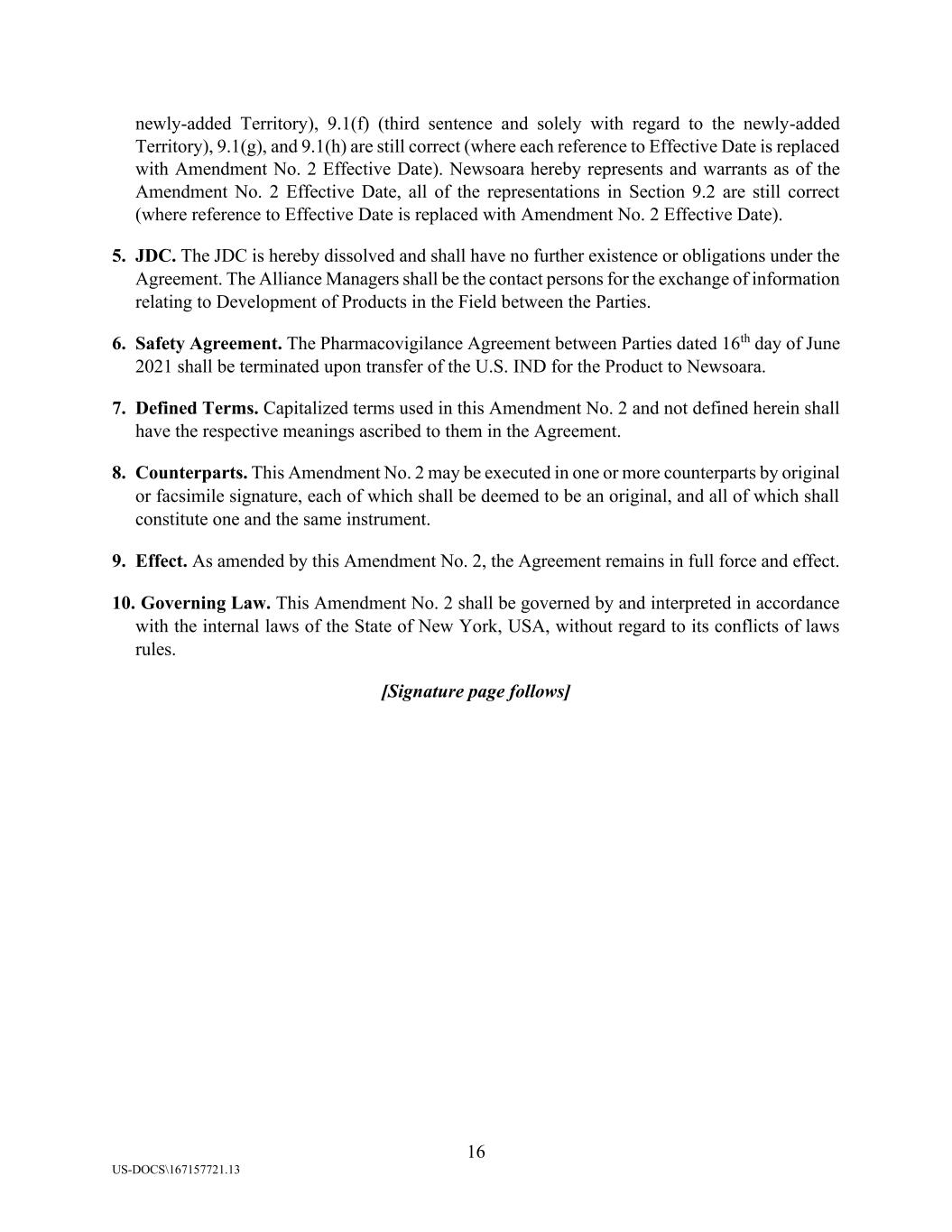 16 US-DOCS\167157721.13 newly-added Territory), 9.1(f) (third sentence and solely with regard to the newly-added Territory), 9.1(g), and 9.1(h) are still correct (where each reference to Effective Date is replaced with Amendment No. 2 Effective Date). Newsoara hereby represents and warrants as of the Amendment No. 2 Effective Date, all of the representations in Section 9.2 are still correct (where reference to Effective Date is replaced with Amendment No. 2 Effective Date). 5. JDC. The JDC is hereby dissolved and shall have no further existence or obligations under the Agreement. The Alliance Managers shall be the contact persons for the exchange of information relating to Development of Products in the Field between the Parties. 6. Safety Agreement. The Pharmacovigilance Agreement between Parties dated 16th day of June 2021 shall be terminated upon transfer of the U.S. IND for the Product to Newsoara. 7. Defined Terms. Capitalized terms used in this Amendment No. 2 and not defined herein shall have the respective meanings ascribed to them in the Agreement. 8. Counterparts. This Amendment No. 2 may be executed in one or more counterparts by original or facsimile signature, each of which shall be deemed to be an original, and all of which shall constitute one and the same instrument. 9. Effect. As amended by this Amendment No. 2, the Agreement remains in full force and effect. 10. Governing Law. This Amendment No. 2 shall be governed by and interpreted in accordance with the internal laws of the State of New York, USA, without regard to its conflicts of laws rules. [Signature page follows]