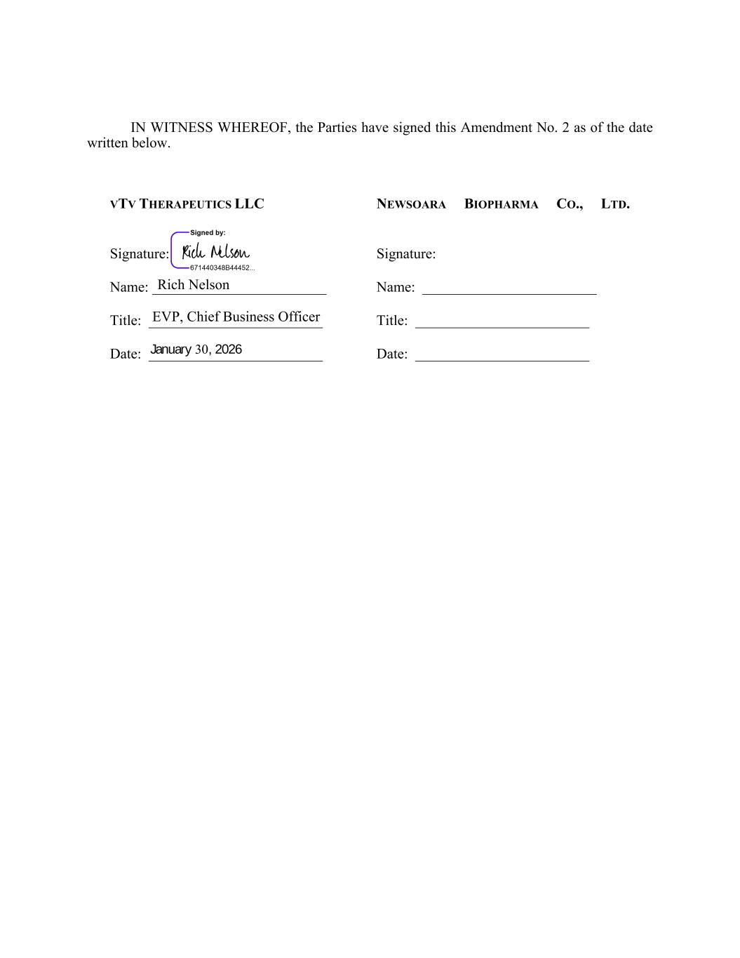 IN WITNESS WHEREOF, the Parties have signed this Amendment No. 2 as of the date written below. VTV THERAPEUTICS LLC Signature: Name: ________________________ Title: ________________________ Date: ________________________ NEWSOARA BIOPHARMA CO., LTD. Signature: Name: ________________________ Title: ________________________ Date: ________________________ Rich Nelson EVP, Chief Business Officer January 30, 2026