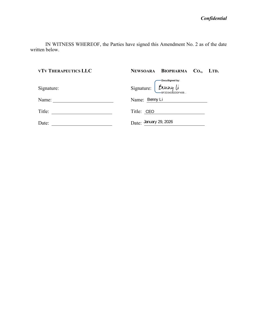 Confidential IN WITNESS WHEREOF, the Parties have signed this Amendment No. 2 as of the date written below. VTV THERAPEUTICS LLC Signature: Name: ________________________ Title: ________________________ Date: ________________________ NEWSOARA BIOPHARMA CO., LTD. Signature: Name: ________________________ Title: ________________________ Date: ________________________ Benny Li January 29, 2026 CEO