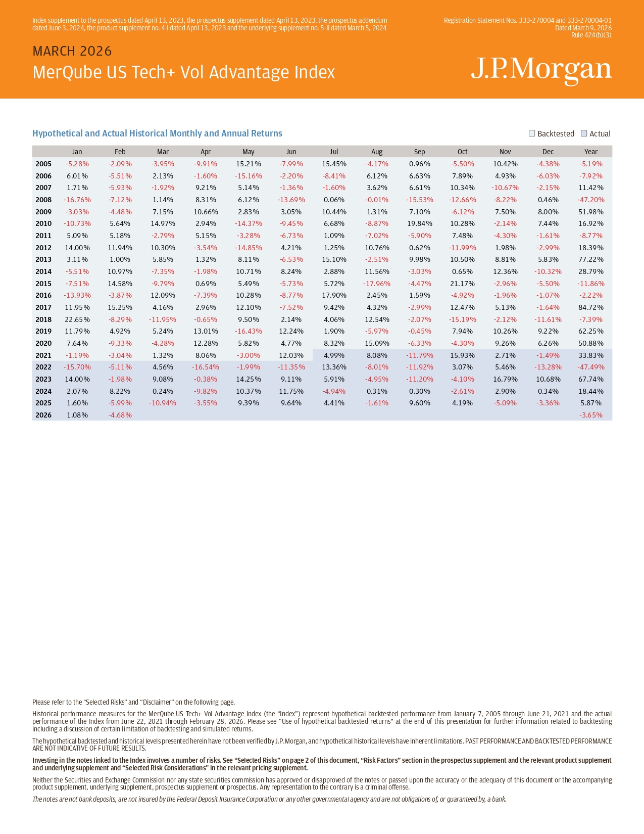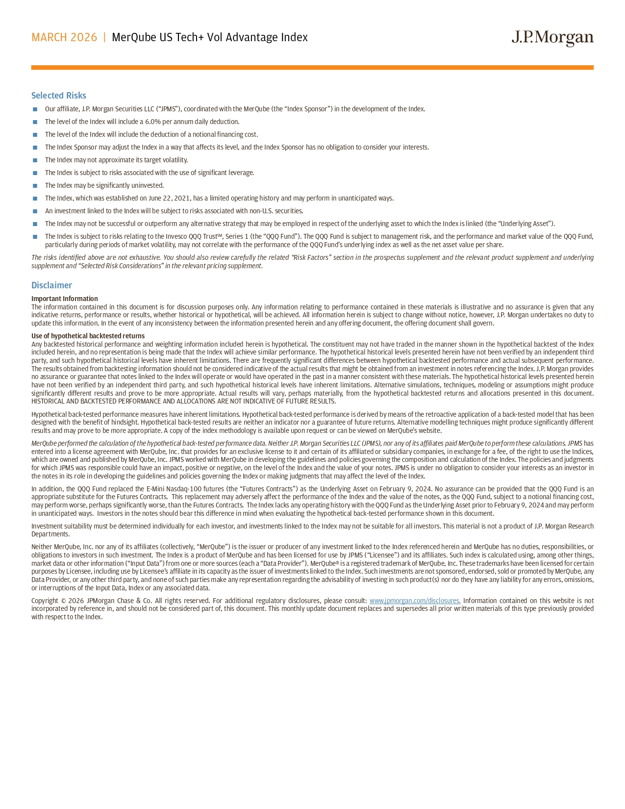 MARCH 2026 | MerQube US Tech+ Vol Advantage Index Selected Risks þÿ Our affiliate, J.P. Morgan Securities LLC (“JPMS”), coordinated with the MerQube (the “Index Sponsor”) in the development of the Index. þÿ The level of the Index will include a 6.0% per annum daily deduction. þÿ The level of the Index will include the deduction of a notional financing cost. þÿ The Index Sponsor may adjust the Index in a way that affects its level, and the Index Sponsor has no obligation to consider y our interests. þÿ The Index may not approximate its target volatility. þÿ The Index is subject to risks associated with the use of significant leverage. þÿ The Index may be significantly uninvested. þÿ The Index, which was established on June 22, 2021, has a limited operating history and may perform in unanticipated ways. þÿ An investment linked to the Index will be subject to risks associated with non - U.S. securities. þÿ The Index may not be successful or outperform any alternative strategy that may be employed in respect of the underlying asse t t o which the Index is linked (the “Underlying Asset”). þÿ The Index is subject to risks relating to the Invesco QQQ Trust SM , Series 1 (the “QQQ Fund”). The QQQ Fund is subject to management risk, and the performance and market value of the QQQ Fund , particularly during periods of market volatility, may not correlate with the performance of the QQQ Fund’s underlying index a s w ell as the net asset value per share. The risks identified above are not exhaustive. You should also review carefully the related “Risk Factors” section in the pro spe ctus supplement and the relevant product supplement and underlying supplement and “Selected Risk Considerations” in the relevant pricing supplement. Disclaimer Important Information The information contained in this document is for discussion purposes only. Any information relating to performance contained in these materials is illustrative and no assurance is given that any indicative returns, performance or results, whether historical or hypothetical, will be achieved. All information herein is s ubj ect to change without notice, however, J.P. Morgan undertakes no duty to update this information. In the event of any inconsistency between the information presented herein and any offering document , t he offering document shall govern. Use of hypothetical backtested returns Any backtested historical performance and weighting information included herein is hypothetical. The constituent may not have tr aded in the manner shown in the hypothetical backtest of the Index included herein, and no representation is being made that the Index will achieve similar performance. The hypothetical histor ica l levels presented herein have not been verified by an independent third party, and such hypothetical historical levels have inherent limitations. There are frequently significant differences betwee n h ypothetical backtested performance and actual subsequent performance. The results obtained from backtesting information should not be considered indicative of the actual results that might be obt ain ed from an investment in notes referencing the Index. J.P. Morgan provides no assurance or guarantee that notes linked to the Index will operate or would have operated in the past in a manner consiste nt with these materials. The hypothetical historical levels presented herein have not been verified by an independent third party, and such hypothetical historical levels have inherent limitations. Alte rna tive simulations, techniques, modeling or assumptions might produce significantly different results and prove to be more appropriate. Actual results will vary, perhaps materially, from the hypo the tical backtested returns and allocations presented in this document. HISTORICAL AND BACKTESTED PERFORMANCE AND ALLOCATIONS ARE NOT INDICATIVE OF FUTURE RESULTS. Hypothetical back - tested performance measures have inherent limitations. Hypothetical back - tested performance is derived by mean s of the retroactive application of a back - tested model that has been designed with the benefit of hindsight. Hypothetical back - tested results are neither an indicator nor a guarantee of future retu rns. Alternative modelling techniques might produce significantly different results and may prove to be more appropriate. A copy of the index methodology is available upon request or can be viewed on M erQ ube’s website. MerQube performed the calculation of the hypothetical back - tested performance data. Neither J.P. Morgan Securities LLC (JPMS), n or any of its affiliates paid MerQube to perform these calculations. JPMS has entered into a license agreement with MerQube, Inc. that provides for an exclusive license to it and certain of its affiliate d o r subsidiary companies, in exchange for a fee, of the right to use the Indices, which are owned and published by MerQube, Inc. JPMS worked with MerQube in developing the guidelines and policies governing t he composition and calculation of the Index. The policies and judgments for which JPMS was responsible could have an impact, positive or negative, on the level of the Index and the value of your no tes . JPMS is under no obligation to consider your interests as an investor in the notes in its role in developing the guidelines and policies governing the Index or making judgments that may affect the l eve l of the Index. In addition, the QQQ Fund replaced the E - Mini Nasdaq - 100 futures (the “Futures Contracts”) as the Underlying Asset on February 9 , 2024. No assurance can be provided that the QQQ Fund is an appropriate substitute for the Futures Contracts. This replacement may adversely affect the performance of the Index and the va lue of the notes, as the QQQ Fund, subject to a notional financing cost, may perform worse, perhaps significantly worse, than the Futures Contracts. The Index lacks any operating history with the Q QQ Fund as the Underlyi