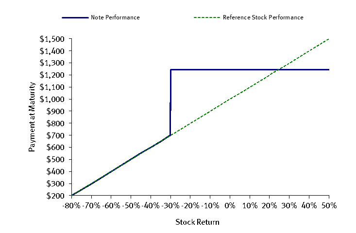 The following table and graph illustrate the hypothetical total return and payment at maturity on the notes linked to a hypothetical Reference Stock. The “total return” as used in this pricing supplement is the number, expressed as a percentage, that results from comparing the payment at maturity per $1,000 principal amount note to $1,000. The hypothetical total returns and payments set forth below assume the following: