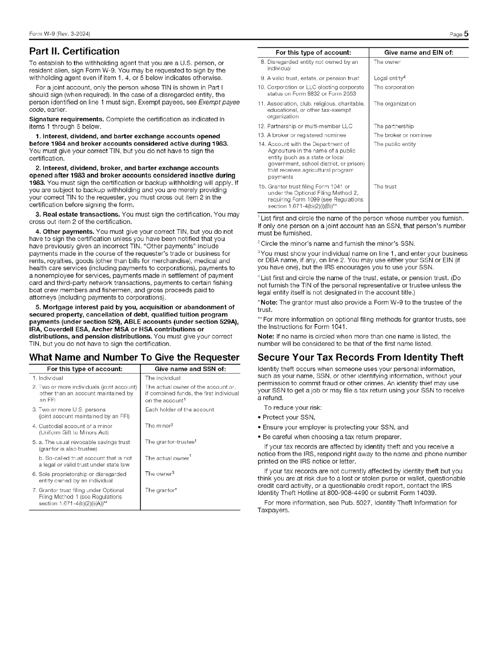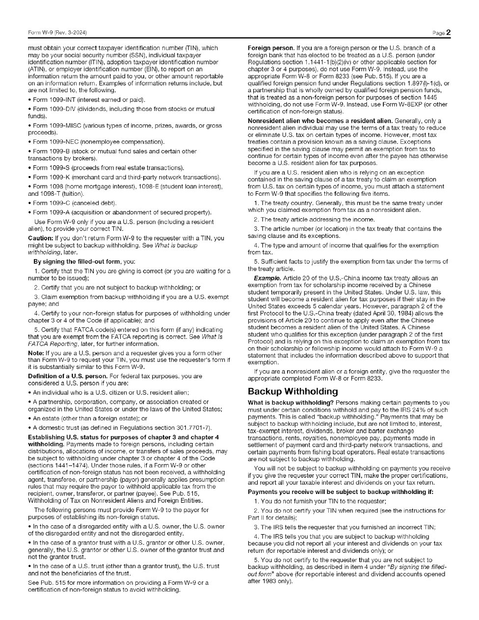 6. IRS Form W-9; IRS Form W-8: Under the federal income tax law, a non-exempt stockholder is required to provide the Exchange Agent with such stockholder's correct Taxpayer Identification Number (“TIN”) on the enclosed IRS Form W-9. If the certificate(s) are in more than one name or are not in the name of the actual owner, consult the instructions to the enclosed IRS Form W-9 for additional guidance on which number to report. Failure to provide the information on the form may subject the surrendering stockholder to 24% backup withholding on the payment of any cash and a penalty imposed by the IRS. If a stockholder has not been issued a TIN, such stockholder should consult the instructions to the IRS Form W-9. If a TIN has been applied for and the Exchange Agent is not provided with a TIN before payment is made, the Exchange Agent will withhold 24% on all payments to such surrendering stockholders of any cash consideration due for their former shares. Please review the instructions to the IRS Form W-9 for additional details on what Taxpayer Identification Number to give the Exchange Agent.