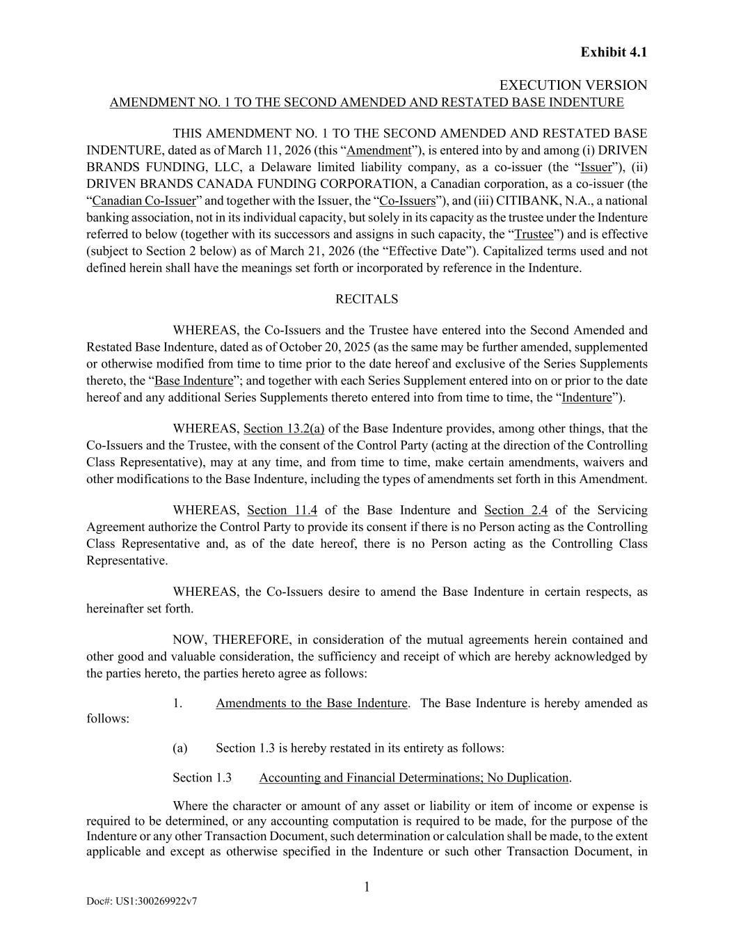 Exhibit 4.1 EXECUTION VERSION 1 Doc#: US1:300269922v7 AMENDMENT NO. 1 TO THE SECOND AMENDED AND RESTATED BASE INDENTURE THIS AMENDMENT NO. 1 TO THE SECOND AMENDED AND RESTATED BASE INDENTURE, dated as of March 11, 2026 (this “Amendment”), is entered into by and among (i) DRIVEN BRANDS FUNDING, LLC, a Delaware limited liability company, as a co-issuer (the “Issuer”), (ii) DRIVEN BRANDS CANADA FUNDING CORPORATION, a Canadian corporation, as a co-issuer (the “Canadian Co-Issuer” and together with the Issuer, the “Co-Issuers”), and (iii) CITIBANK, N.A., a national banking association, not in its individual capacity, but solely in its capacity as the trustee under the Indenture referred to below (together with its successors and assigns in such capacity, the “Trustee”) and is effective (subject to Section 2 below) as of March 21, 2026 (the “Effective Date”). Capitalized terms used and not defined herein shall have the meanings set forth or incorporated by reference in the Indenture. RECITALS WHEREAS, the Co-Issuers and the Trustee have entered into the Second Amended and Restated Base Indenture, dated as of October 20, 2025 (as the same may be further amended, supplemented or otherwise modified from time to time prior to the date hereof and exclusive of the Series Supplements thereto, the “Base Indenture”; and together with each Series Supplement entered into on or prior to the date hereof and any additional Series Supplements thereto entered into from time to time, the “Indenture”). WHEREAS, Section 13.2(a) of the Base Indenture provides, among other things, that the Co-Issuers and the Trustee, with the consent of the Control Party (acting at the direction of the Controlling Class Representative), may at any time, and from time to time, make certain amendments, waivers and other modifications to the Base Indenture, including the types of amendments set forth in this Amendment. WHEREAS, Section 11.4 of the Base Indenture and Section 2.4 of the Servicing Agreement authorize the Control Party to provide its consent if there is no Person acting as the Controlling Class Representative and, as of the date hereof, there is no Person acting as the Controlling Class Representative. WHEREAS, the Co-Issuers desire to amend the Base Indenture in certain respects, as hereinafter set forth. NOW, THEREFORE, in consideration of the mutual agreements herein contained and other good and valuable consideration, the sufficiency and receipt of which are hereby acknowledged by the parties hereto, the parties hereto agree as follows: 1. Amendments to the Base Indenture. The Base Indenture is hereby amended as follows: (a) Section 1.3 is hereby restated in its entirety as follows: Section 1.3 Accounting and Financial Determinations; No Duplication. Where the character or amount of any asset or liability or item of income or expense is required to be determined, or any accounting computation is required to be made, for the purpose of the Indenture or any other Transaction Document, such determination or calculation shall be made, to the extent applicable and except as otherwise specified in the Indenture or such other Transaction Document, in
