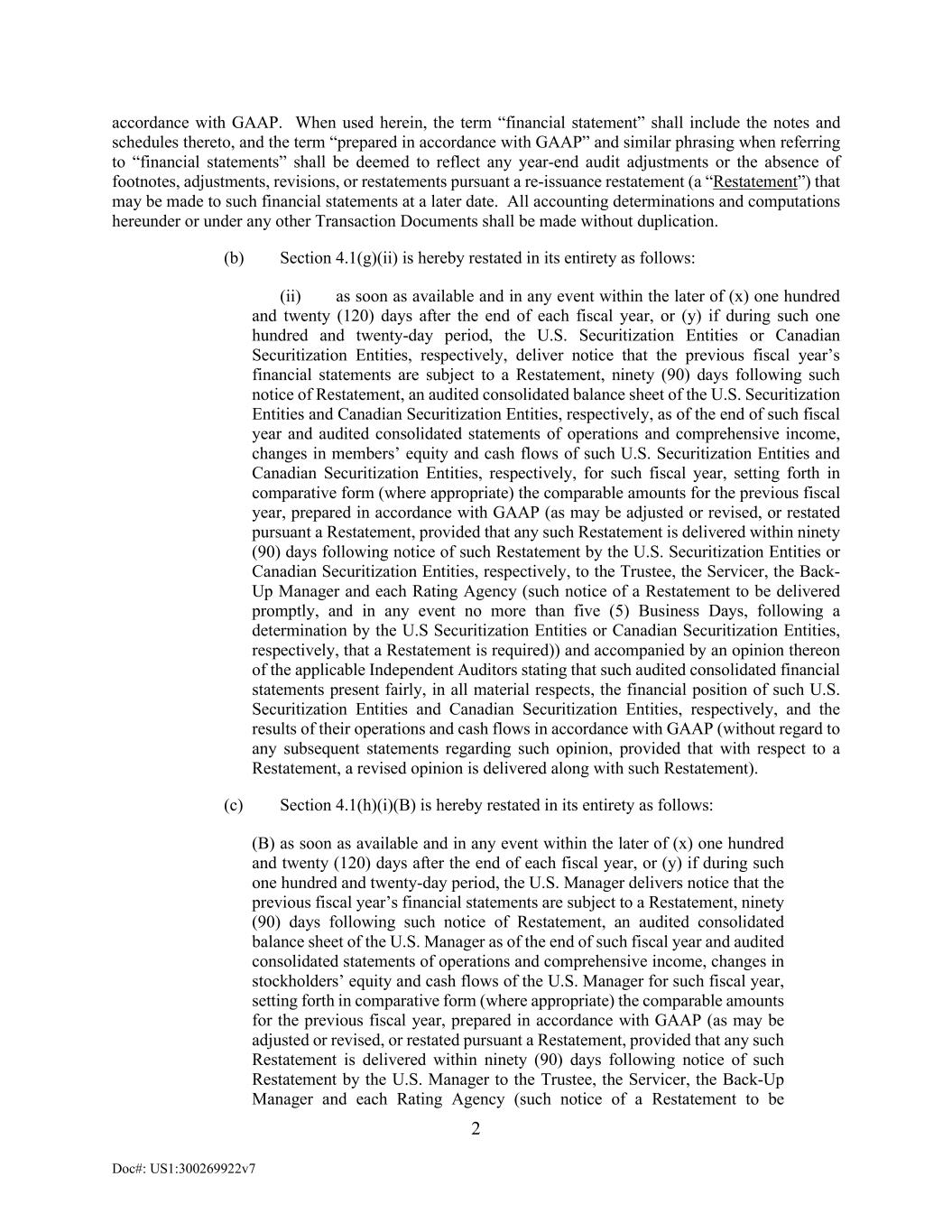 2 Doc#: US1:300269922v7 accordance with GAAP. When used herein, the term “financial statement” shall include the notes and schedules thereto, and the term “prepared in accordance with GAAP” and similar phrasing when referring to “financial statements” shall be deemed to reflect any year-end audit adjustments or the absence of footnotes, adjustments, revisions, or restatements pursuant a re-issuance restatement (a “Restatement”) that may be made to such financial statements at a later date. All accounting determinations and computations hereunder or under any other Transaction Documents shall be made without duplication. (b) Section 4.1(g)(ii) is hereby restated in its entirety as follows: (ii) as soon as available and in any event within the later of (x) one hundred and twenty (120) days after the end of each fiscal year, or (y) if during such one hundred and twenty-day period, the U.S. Securitization Entities or Canadian Securitization Entities, respectively, deliver notice that the previous fiscal year’s financial statements are subject to a Restatement, ninety (90) days following such notice of Restatement, an audited consolidated balance sheet of the U.S. Securitization Entities and Canadian Securitization Entities, respectively, as of the end of such fiscal year and audited consolidated statements of operations and comprehensive income, changes in members’ equity and cash flows of such U.S. Securitization Entities and Canadian Securitization Entities, respectively, for such fiscal year, setting forth in comparative form (where appropriate) the comparable amounts for the previous fiscal year, prepared in accordance with GAAP (as may be adjusted or revised, or restated pursuant a Restatement, provided that any such Restatement is delivered within ninety (90) days following notice of such Restatement by the U.S. Securitization Entities or Canadian Securitization Entities, respectively, to the Trustee, the Servicer, the Back- Up Manager and each Rating Agency (such notice of a Restatement to be delivered promptly, and in any event no more than five (5) Business Days, following a determination by the U.S Securitization Entities or Canadian Securitization Entities, respectively, that a Restatement is required)) and accompanied by an opinion thereon of the applicable Independent Auditors stating that such audited consolidated financial statements present fairly, in all material respects, the financial position of such U.S. Securitization Entities and Canadian Securitization Entities, respectively, and the results of their operations and cash flows in accordance with GAAP (without regard to any subsequent statements regarding such opinion, provided that with respect to a Restatement, a revised opinion is delivered along with such Restatement). (c) Section 4.1(h)(i)(B) is hereby restated in its entirety as follows: (B) as soon as available and in any event within the later of (x) one hundred and twenty (120) days after the end of each fiscal year, or (y) if during such one hundred and twenty-day period, the U.S. Manager delivers notice that the previous fiscal year’s financial statements are subject to a Restatement, ninety (90) days following such notice of Restatement, an audited consolidated balance sheet of the U.S. Manager as of the end of such fiscal year and audited consolidated statements of operations and comprehensive income, changes in stockholders’ equity and cash flows of the U.S. Manager for such fiscal year, setting forth in comparative form (where appropriate) the comparable amounts for the previous fiscal year, prepared in accordance with GAAP (as may be adjusted or revised, or restated pursuant a Restatement, provided that any such Restatement is delivered within ninety (90) days following notice of such Restatement by the U.S. Manager to the Trustee, the Servicer, the Back-Up Manager and each Rating Agency (such notice of a Restatement to be