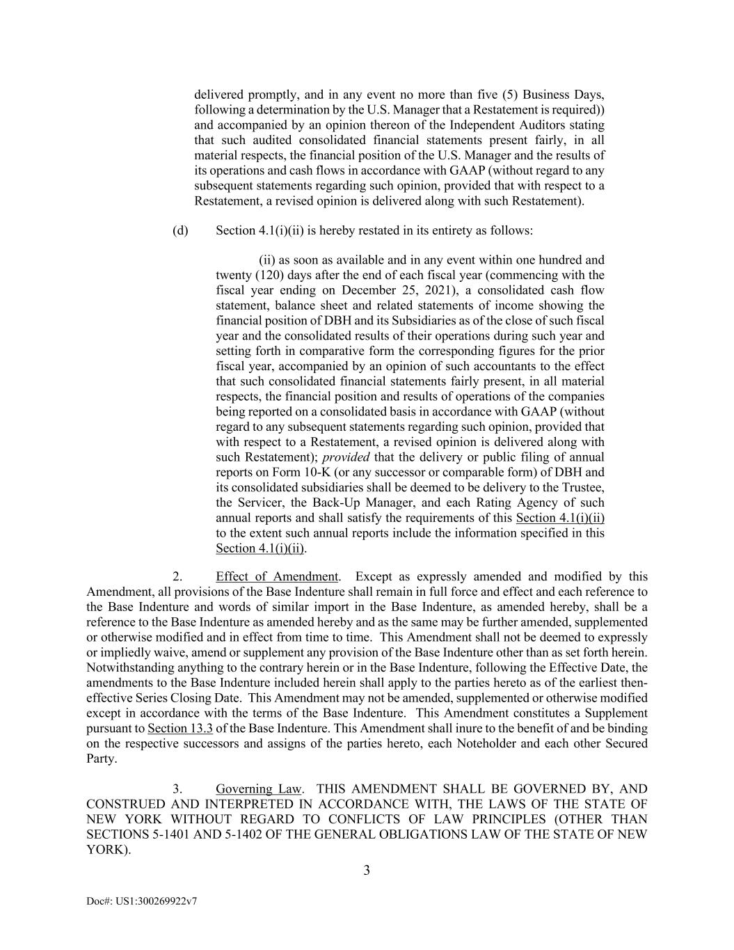 3 Doc#: US1:300269922v7 delivered promptly, and in any event no more than five (5) Business Days, following a determination by the U.S. Manager that a Restatement is required)) and accompanied by an opinion thereon of the Independent Auditors stating that such audited consolidated financial statements present fairly, in all material respects, the financial position of the U.S. Manager and the results of its operations and cash flows in accordance with GAAP (without regard to any subsequent statements regarding such opinion, provided that with respect to a Restatement, a revised opinion is delivered along with such Restatement). (d) Section 4.1(i)(ii) is hereby restated in its entirety as follows: (ii) as soon as available and in any event within one hundred and twenty (120) days after the end of each fiscal year (commencing with the fiscal year ending on December 25, 2021), a consolidated cash flow statement, balance sheet and related statements of income showing the financial position of DBH and its Subsidiaries as of the close of such fiscal year and the consolidated results of their operations during such year and setting forth in comparative form the corresponding figures for the prior fiscal year, accompanied by an opinion of such accountants to the effect that such consolidated financial statements fairly present, in all material respects, the financial position and results of operations of the companies being reported on a consolidated basis in accordance with GAAP (without regard to any subsequent statements regarding such opinion, provided that with respect to a Restatement, a revised opinion is delivered along with such Restatement); provided that the delivery or public filing of annual reports on Form 10-K (or any successor or comparable form) of DBH and its consolidated subsidiaries shall be deemed to be delivery to the Trustee, the Servicer, the Back-Up Manager, and each Rating Agency of such annual reports and shall satisfy the requirements of this Section 4.1(i)(ii) to the extent such annual reports include the information specified in this Section 4.1(i)(ii). 2. Effect of Amendment. Except as expressly amended and modified by this Amendment, all provisions of the Base Indenture shall remain in full force and effect and each reference to the Base Indenture and words of similar import in the Base Indenture, as amended hereby, shall be a reference to the Base Indenture as amended hereby and as the same may be further amended, supplemented or otherwise modified and in effect from time to time. This Amendment shall not be deemed to expressly or impliedly waive, amend or supplement any provision of the Base Indenture other than as set forth herein. Notwithstanding anything to the contrary herein or in the Base Indenture, following the Effective Date, the amendments to the Base Indenture included herein shall apply to the parties hereto as of the earliest then- effective Series Closing Date. This Amendment may not be amended, supplemented or otherwise modified except in accordance with the terms of the Base Indenture. This Amendment constitutes a Supplement pursuant to Section 13.3 of the Base Indenture. This Amendment shall inure to the benefit of and be binding on the respective successors and assigns of the parties hereto, each Noteholder and each other Secured Party. 3. Governing Law. THIS AMENDMENT SHALL BE GOVERNED BY, AND CONSTRUED AND INTERPRETED IN ACCORDANCE WITH, THE LAWS OF THE STATE OF NEW YORK WITHOUT REGARD TO CONFLICTS OF LAW PRINCIPLES (OTHER THAN SECTIONS 5-1401 AND 5-1402 OF THE GENERAL OBLIGATIONS LAW OF THE STATE OF NEW YORK).