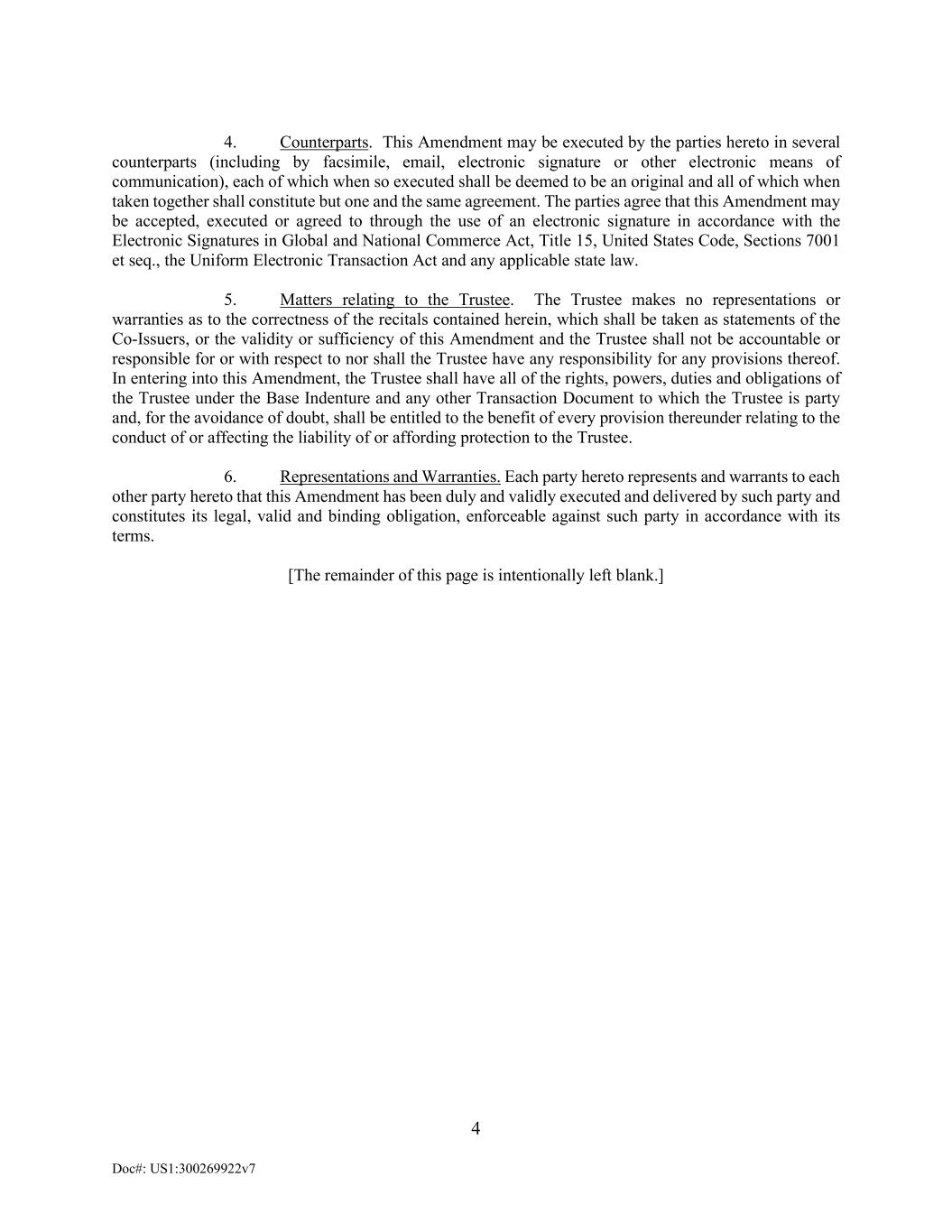 4 Doc#: US1:300269922v7 4. Counterparts. This Amendment may be executed by the parties hereto in several counterparts (including by facsimile, email, electronic signature or other electronic means of communication), each of which when so executed shall be deemed to be an original and all of which when taken together shall constitute but one and the same agreement. The parties agree that this Amendment may be accepted, executed or agreed to through the use of an electronic signature in accordance with the Electronic Signatures in Global and National Commerce Act, Title 15, United States Code, Sections 7001 et seq., the Uniform Electronic Transaction Act and any applicable state law. 5. Matters relating to the Trustee. The Trustee makes no representations or warranties as to the correctness of the recitals contained herein, which shall be taken as statements of the Co-Issuers, or the validity or sufficiency of this Amendment and the Trustee shall not be accountable or responsible for or with respect to nor shall the Trustee have any responsibility for any provisions thereof. In entering into this Amendment, the Trustee shall have all of the rights, powers, duties and obligations of the Trustee under the Base Indenture and any other Transaction Document to which the Trustee is party and, for the avoidance of doubt, shall be entitled to the benefit of every provision thereunder relating to the conduct of or affecting the liability of or affording protection to the Trustee. 6. Representations and Warranties. Each party hereto represents and warrants to each other party hereto that this Amendment has been duly and validly executed and delivered by such party and constitutes its legal, valid and binding obligation, enforceable against such party in accordance with its terms. [The remainder of this page is intentionally left blank.]