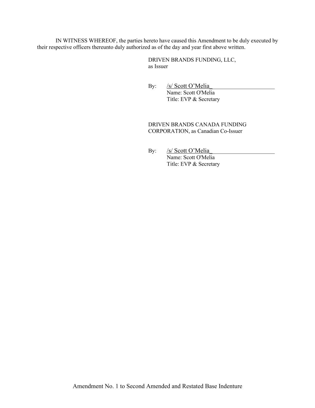 Amendment No. 1 to Second Amended and Restated Base Indenture IN WITNESS WHEREOF, the parties hereto have caused this Amendment to be duly executed by their respective officers thereunto duly authorized as of the day and year first above written. DRIVEN BRANDS FUNDING, LLC, as Issuer By: /s/ Scott O’Melia_______________________ Name: Scott O'Melia Title: EVP & Secretary DRIVEN BRANDS CANADA FUNDING CORPORATION, as Canadian Co-Issuer By: /s/ Scott O’Melia_______________________ Name: Scott O'Melia Title: EVP & Secretary