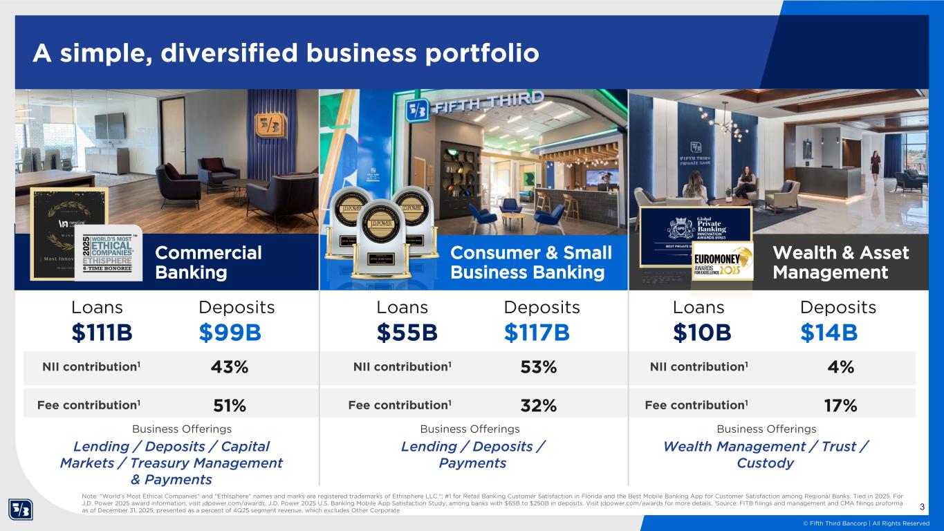 2 © Fifth Third Bancorp | All Rights Reserved Southwest footprint Top performing regional bank with local scale and national reach Assets $294 billion Ranked 9th in the U.S.1 Deposits $237 billion Ranked 9th in the U.S.1 U.S. branches 1,482 Ranked 7th in the U.S.1 Note: Assets, loans, deposits, and branches proforma as of 12/31/25; 1Rankings as of 12/31/25 and consist of US commercial banks and exclude foreign, trust, & traditional investment banks; 2Includes MSAs with $10BN+ in deposits on a capped basis (deposits per branch capped at $250MM per June 2025 FDIC data) Midwest footprint FITB markets2 with a top 5 deposit share Southwest MSAs with top 12 location share Southeast footprint Loans $173 billion Ranked 9th in the U.S.1 Fifth Third headquarters Cincinnati, Ohio Key MSAs of focus Toronto office London office
