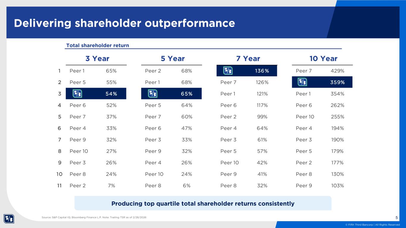 4 © Fifth Third Bancorp | All Rights Reserved Disciplined execution guided by core principles Stability Profitability Growth ✓ Resilient balance sheet ✓ Strong credit profile ✓ Branch-originated insured deposits and operational deposits tied to payments services ✓ NII growth and NIM expansion ✓ Diverse fee mix with high total revenue contribution ✓ Expense discipline ✓ Southeast and Texas demographics ✓ Modular, repeatable investments ✓ Tech-enabled product innovation #2 #3#1 Delivering on our commitment to be transparent and disciplined for our shareholders