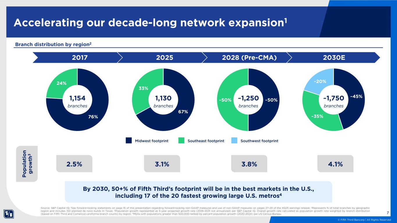6 © Fifth Third Bancorp | All Rights Reserved Middle Market banking powerhouse positioned to grow 283 353 626 2021 2025 Salesforce additions drive growth1 Middle market salesforce $18 $23 $37 2021 2025 Middle market loans ($B) Deep, relationship driven Middle Market platform serving diverse industries across the country Leading payments products in core treasury management and an industry leader in embedded payments Broad capital markets capabilities, including customer derivatives, syndications, debt and capital markets, and M&A Relationship focused with industry leading product capabilities 4Q25 Quarterly Weighted Average Loans x Trillionaire ~15x Total assets x Trillionaire ~2x Total middle market lending 6% CAGR 6% CAGR As of 4Q25 As of 4Q25 Relative asset size does not reflect middle market scale2 Source: company filings and management reporting as of December 31, 2025; 12021 Middle market salesforce and loans presented as standalone Fifth Third; 2Total assets and middle market lending presented as proforma Fifth Third and Comerica as of December 31, 2025 Fifth ThirdComerica