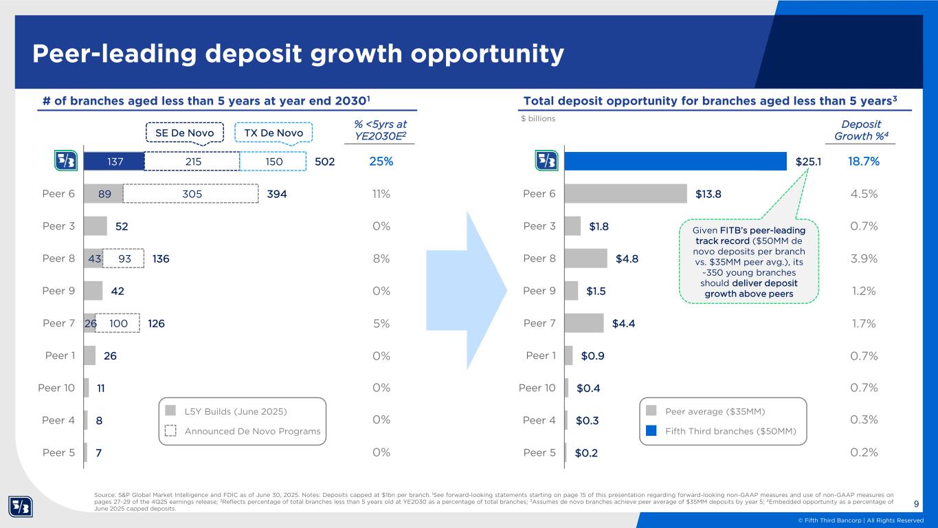 8 © Fifth Third Bancorp | All Rights Reserved Southeast de novo expansion leading to strong deposit growth and profitability The southeast’s share of total retail deposits continues to grow as the de novo network matures Percentage of total retail deposits Southeast investments driving strong granular retail deposit growth at attractive rates Disciplined deposit pricing 4Q25 southeast total cost of retail deposits 84% 82% 77% 16% 18% 23% $0 $20 $40 $60 $80 $100 2019 2022 2025 Midwest Southeast 1.98% 4.02% x Avg. FF Rate 48 296 149 Peer Median Trillionaire Median x National Among leaders in de novos built nationally and in footprint 10 96 149 Peer Median Trillionaire Median x Total retail footprint2 Source: S&P Capital IQ, internal management reporting; Note: Branch data as of September 22, 2025, Management reporting reflects data as of December 31, 2025; 12025 FDIC data capped at $250MM and filtered for de novos opened since 2018. Not all de novos have been open for 5 years; 2Retail footprint includes MSAs and counties that Fifth Third has active branches in as of September 22, 2025 De novos built since 2018 Rank 4th Rank 2nd $0 $10 $20 $30 $40 $50 Year 1 Year 2 Year 3 Year 4 Year 5 Fifth Third Peer Avg Average de novo deposits per branch by year1 $ in millions Outsized retail growth across our footprint relative to competitors 5-Year deposit CAGR1 0.5% 1.8% 5.5% Other competitors Trillionaires x Total Retail Footprint2 1.0% 2.1% 12.1% Other competitors Trillionaires x Southeast Retail Footprint2