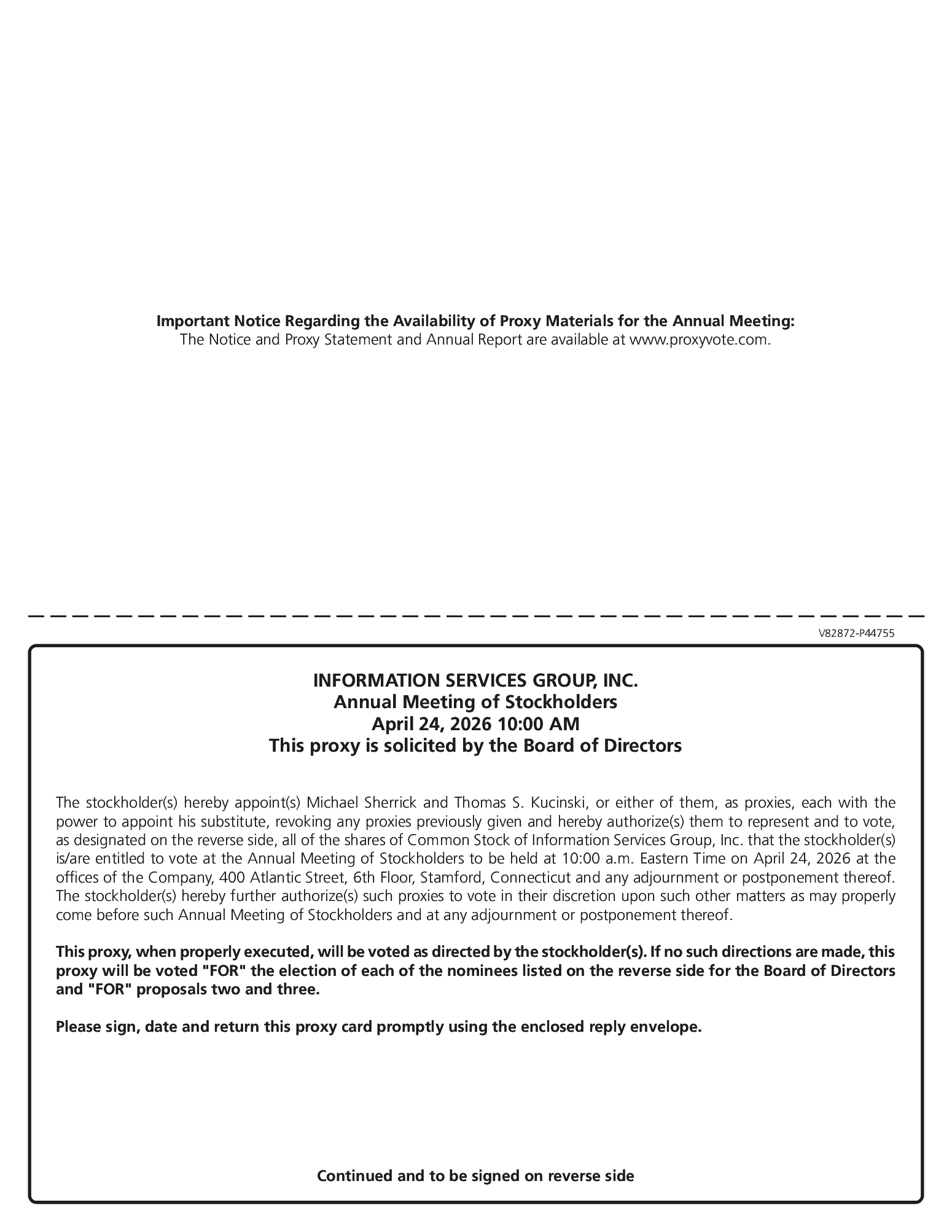 In 2025 ISG reported revenue of $244.7 million, net income of $9.3 million, operating income of $17.8 million, adjusted EBITDA of $32.2 million, GAAP net income per diluted share of $0.19 and adjusted net income per diluted share of $0.33. Contributing to these results were robust utilization and expense management discipline. These results reflected significant year over year growth rates as revenues were up 7% (excluding the divestiture of our automation business), adjusted EBITDA was up 28%, adjusted EBITDA margin was up 300 basis points, adjusted net income was up 65% and operating cash flow was up 46%. Based on the Company’s 2025 performance and individual performance, the Compensation Committee approved annual incentive award payouts, as follows: (i) for Mr. Connors, paid $1,650,000 with $1,250,000 paid in cash on December 31, 2025 and a grant of restricted stock units to be issued on March 13, 2026 with a value equal to $400,000; (ii) for Mr. Lavieri, paid $625,000 with $400,000 paid in cash on December 31, 2025 and a grant of restricted stock units to be issued on March 13, 2026 with a value of $225,000 and (iii) for Mr. Sherrick, paid $345,000 with $165,000 paid in cash on December 31, 2025 and a grant of restricted stock units to be issued on March 13, 2026 with a value equal to $180,000.