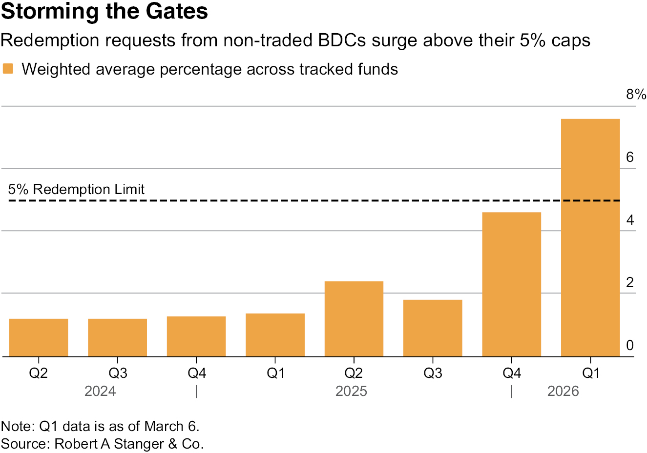 The industry’s jitters were amplified this year when two of the biggest players in publicly traded BDCs, BlackRock Inc. and Apollo Global Management Inc., cut their dividends and wrote down weaker assets in some funds, worsening their already dismal stock performance. Managers at Blackstone Inc. pitched in some $150 million of their own money to help finance a record redemption request from retail investors for its flagship private credit fund, and BlackRock jolted the industry by curbing withdrawals from another one of its private credit funds when client requests for redemptions spiked.