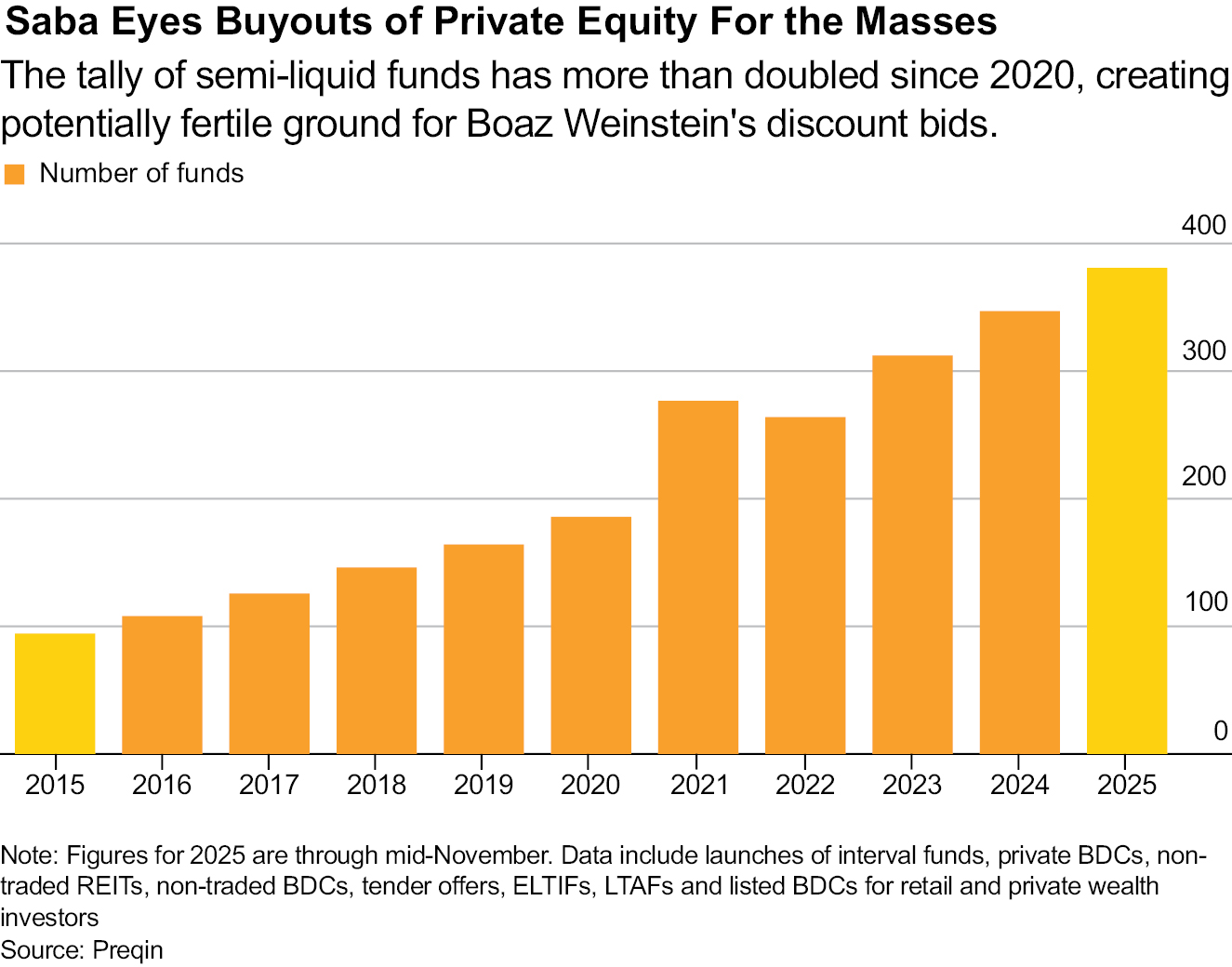 Like with closed-end funds, Weinstein is striking at a moment when the private assets industry is vulnerable. Concerns about liquidity, inflated valuations, defaults and outright borrower fraud in the $1.8 trillion private credit market have spurred doubt about whether the industry’s equity stakes and private loans are really worth what they claim. Unsold holdings have been piling up with fund managers for years because buyers refuse to pay the asking price, making it hard for the funds to generate profits for restive backers. Weinstein says he’s here to help everyday investors whose money is stranded with sponsors that have curtailed redemptions.