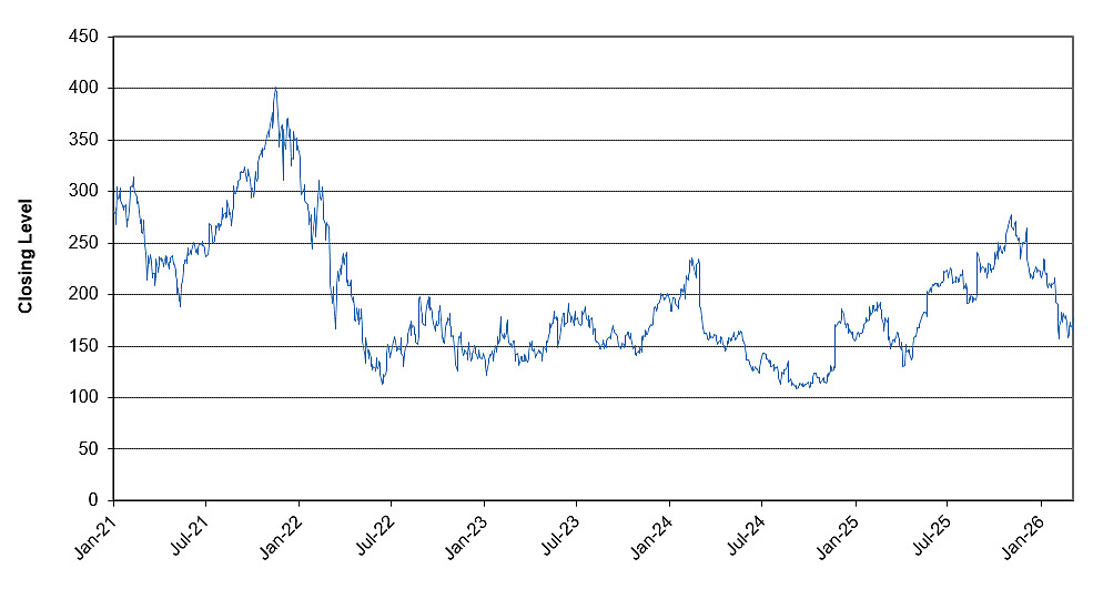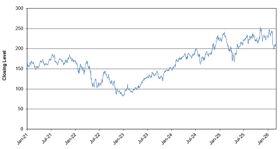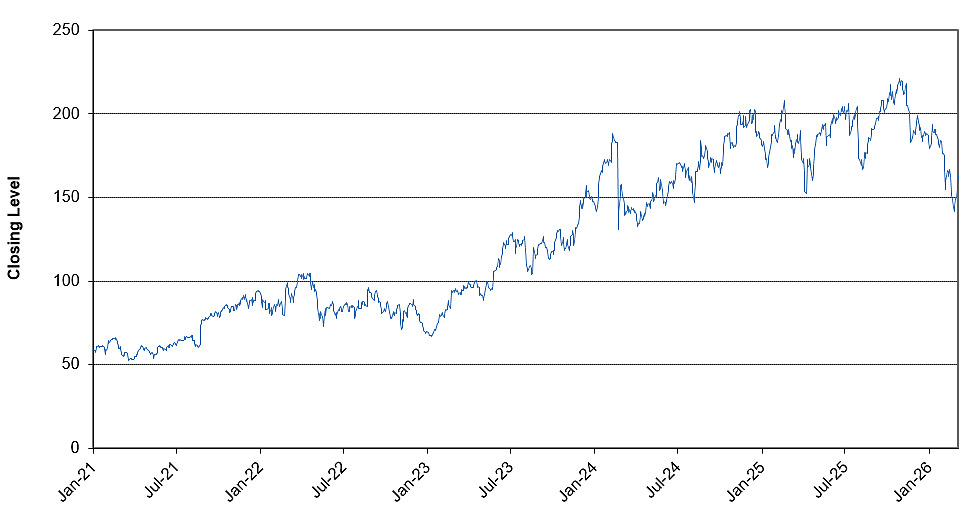 The graph below sets forth the historical performance of the SNOW Underlier based on the daily Closing Values from January 4, 2021 through March 5, 2026. We obtained the Closing Values shown in the graph below from Bloomberg. We have not independently verified the accuracy or completeness of the information obtained from Bloomberg. The Closing Values below may reflect adjustments in response to certain corporate actions, such as stock splits, public offerings, mergers and acquisitions, spin-offs, extraordinary dividends, delistings and bankruptcy.