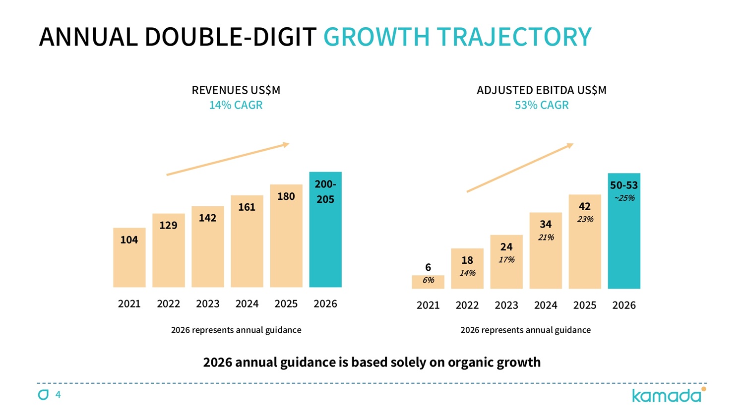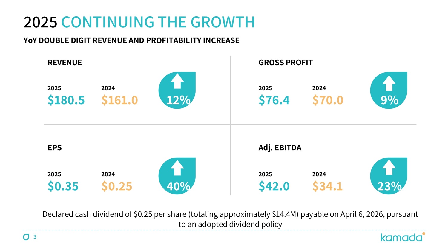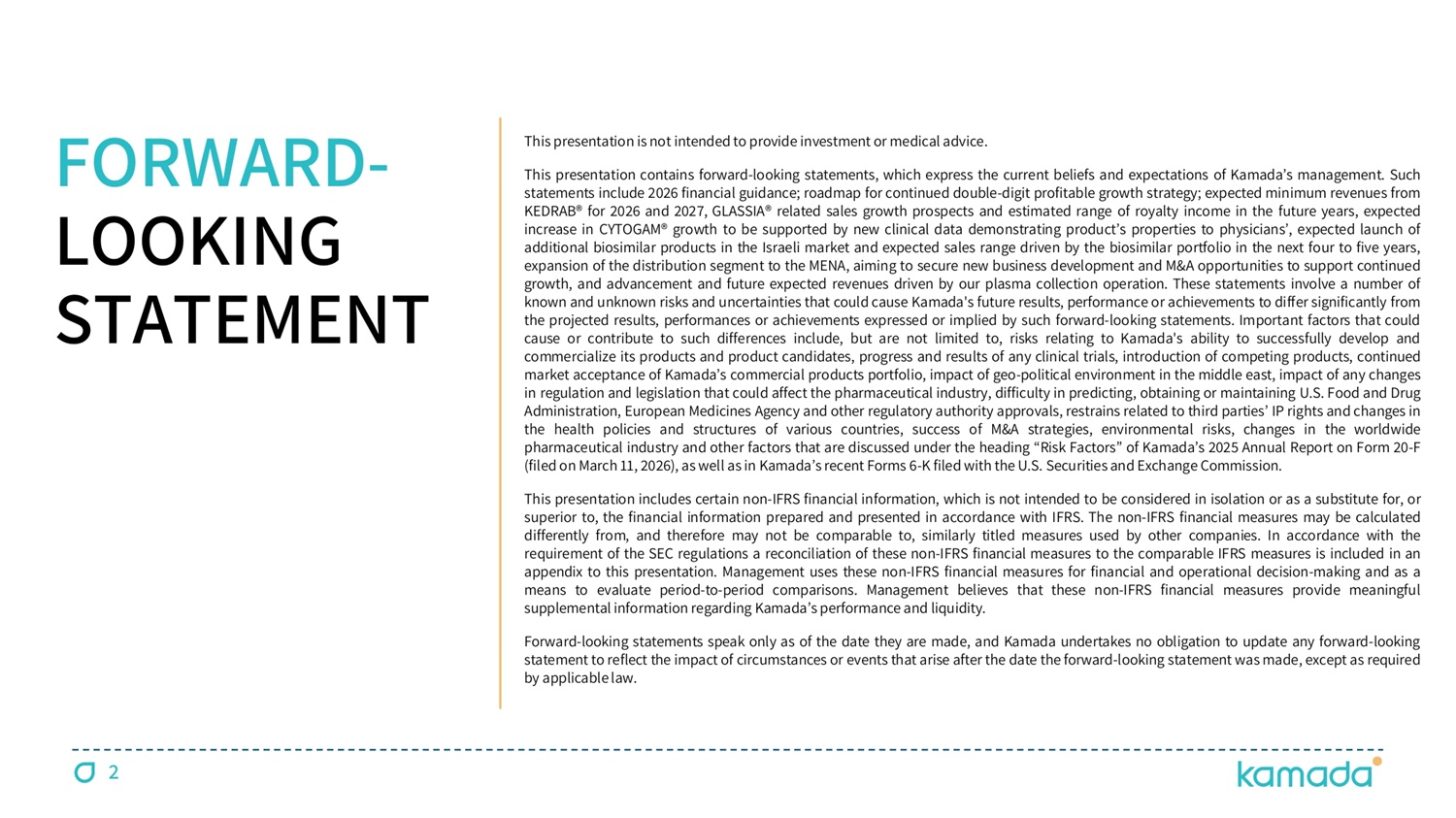 2 FORWARD - LOOKING STATEMENT This presentation is not intended to provide investment or medical advice . This presentation contains forward - looking statements, which express the current beliefs and expectations of Kamada’s management . Such statements include 2026 financial guidance ; roadmap for continued double - digit profitable growth strategy ; expected minimum revenues from KEDRAB® for 2026 and 2027 , GLASSIA® related sales growth prospects and estimated range of royalty income in the future years, expected increase in CYTOGAM® growth to be supported by new clinical data demonstrating product’s properties to physicians’, expected launch of additional biosimilar products in the Israeli market and expected sales range driven by the biosimilar portfolio in the next four to five years, expansion of the distribution segment to the MENA, aiming to secure new business development and M&A opportunities to support continued growth, and advancement and future expected revenues driven by our plasma collection operation . These statements involve a number of known and unknown risks and uncertainties that could cause Kamada's future results, performance or achievements to differ significantly from the projected results, performances or achievements expressed or implied by such forward - looking statements . Important factors that could cause or contribute to such differences include, but are not limited to, risks relating to Kamada's ability to successfully develop and commercialize its products and product candidates, progress and results of any clinical trials, introduction of competing products, continued market acceptance of Kamada’s commercial products portfolio, impact of geo - political environment in the middle east, impact of any changes in regulation and legislation that could affect the pharmaceutical industry, difficulty in predicting, obtaining or maintaining U . S . Food and Drug Administration, European Medicines Agency and other regulatory authority approvals, restrains related to third parties’ IP rights and changes in the health policies and structures of various countries, success of M&A strategies, environmental risks, changes in the worldwide pharmaceutical industry and other factors that are discussed under the heading “Risk Factors” of Kamada’s 2025 Annual Report on Form 20 - F (filed on March 11 , 2026 ), as well as in Kamada’s recent Forms 6 - K filed with the U . S . Securities and Exchange Commission . This presentation includes certain non - IFRS financial information, which is not intended to be considered in isolation or as a substitute for, or superior to, the financial information prepared and presented in accordance with IFRS . The non - IFRS financial measures may be calculated differently from, and therefore may not be comparable to, similarly titled measures used by other companies . In accordance with the requirement of the SEC regulations a reconciliation of these non - IFRS financial measures to the comparable IFRS measures is included in an appendix to this presentation . Management uses these non - IFRS financial measures for financial and operational decision - making and as a means to evaluate period - to - period comparisons . Management believes that these non - IFRS financial measures provide meaningful supplemental information regarding Kamada’s performance and liquidity . Forward - looking statements speak only as of the date they are made, and Kamada undertakes no obligation to update any forward - looking statement to reflect the impact of circumstances or events that arise after the date the forward - looking statement was made, except as required by applicable law .