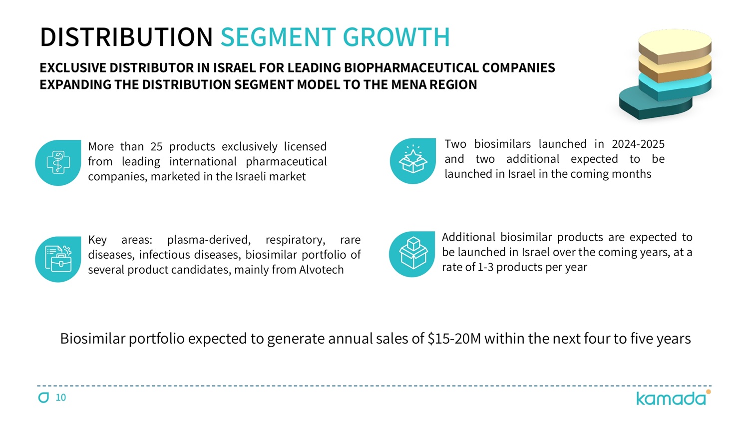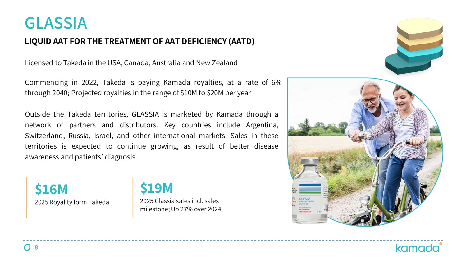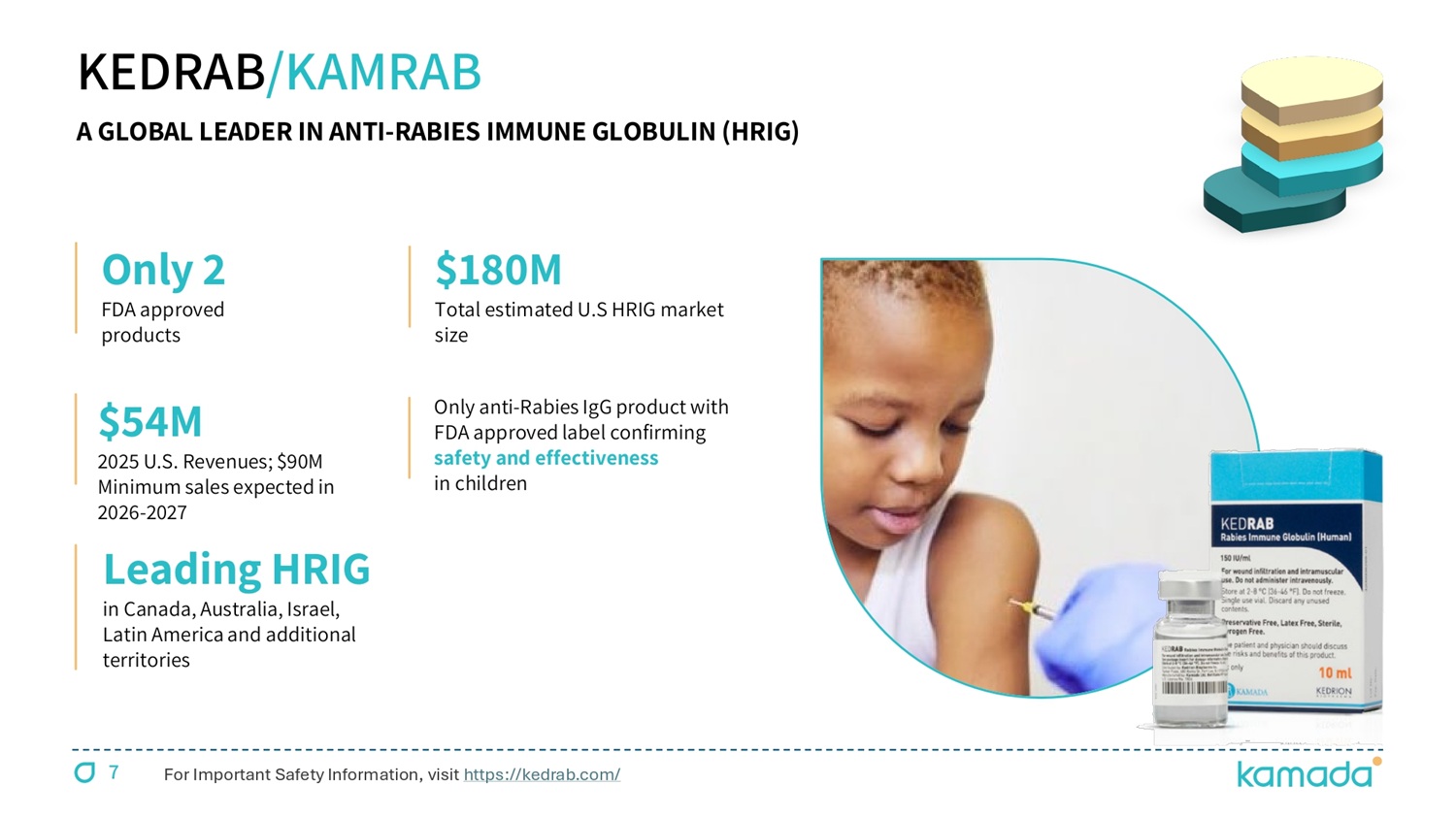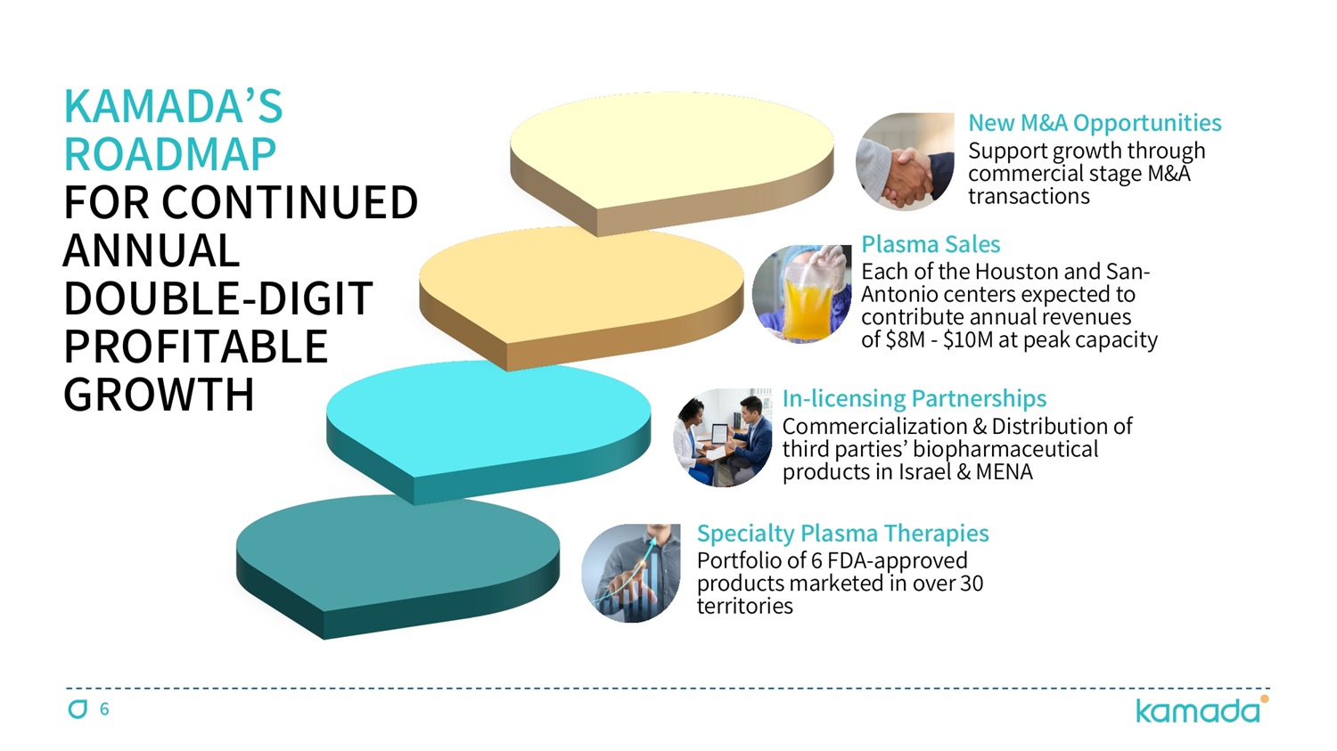 2 FORWARD - LOOKING STATEMENT This presentation is not intended to provide investment or medical advice . This presentation contains forward - looking statements, which express the current beliefs and expectations of Kamada’s management . Such statements include 2026 financial guidance ; roadmap for continued double - digit profitable growth strategy ; expected minimum revenues from KEDRAB® for 2026 and 2027 , GLASSIA® related sales growth prospects and estimated range of royalty income in the future years, expected increase in CYTOGAM® growth to be supported by new clinical data demonstrating product’s properties to physicians’, expected launch of additional biosimilar products in the Israeli market and expected sales range driven by the biosimilar portfolio in the next four to five years, expansion of the distribution segment to the MENA, aiming to secure new business development and M&A opportunities to support continued growth, and advancement and future expected revenues driven by our plasma collection operation . These statements involve a number of known and unknown risks and uncertainties that could cause Kamada's future results, performance or achievements to differ significantly from the projected results, performances or achievements expressed or implied by such forward - looking statements . Important factors that could cause or contribute to such differences include, but are not limited to, risks relating to Kamada's ability to successfully develop and commercialize its products and product candidates, progress and results of any clinical trials, introduction of competing products, continued market acceptance of Kamada’s commercial products portfolio, impact of geo - political environment in the middle east, impact of any changes in regulation and legislation that could affect the pharmaceutical industry, difficulty in predicting, obtaining or maintaining U . S . Food and Drug Administration, European Medicines Agency and other regulatory authority approvals, restrains related to third parties’ IP rights and changes in the health policies and structures of various countries, success of M&A strategies, environmental risks, changes in the worldwide pharmaceutical industry and other factors that are discussed under the heading “Risk Factors” of Kamada’s 2025 Annual Report on Form 20 - F (filed on March 11 , 2026 ), as well as in Kamada’s recent Forms 6 - K filed with the U . S . Securities and Exchange Commission . This presentation includes certain non - IFRS financial information, which is not intended to be considered in isolation or as a substitute for, or superior to, the financial information prepared and presented in accordance with IFRS . The non - IFRS financial measures may be calculated differently from, and therefore may not be comparable to, similarly titled measures used by other companies . In accordance with the requirement of the SEC regulations a reconciliation of these non - IFRS financial measures to the comparable IFRS measures is included in an appendix to this presentation . Management uses these non - IFRS financial measures for financial and operational decision - making and as a means to evaluate period - to - period comparisons . Management believes that these non - IFRS financial measures provide meaningful supplemental information regarding Kamada’s performance and liquidity . Forward - looking statements speak only as of the date they are made, and Kamada undertakes no obligation to update any forward - looking statement to reflect the impact of circumstances or events that arise after the date the forward - looking statement was made, except as required by applicable law .