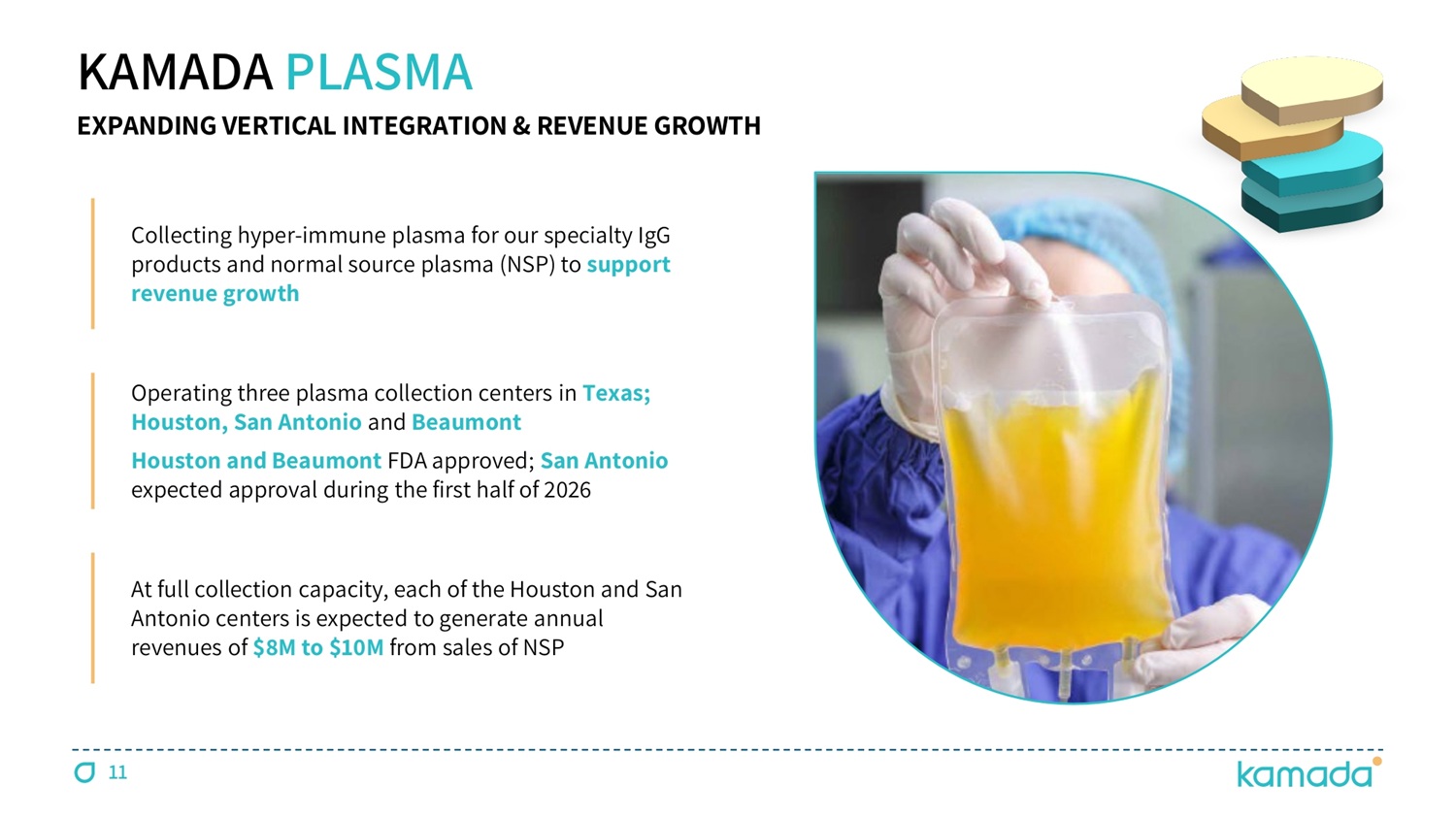11 KAMADA PLASMA EXPANDING VERTICAL INTEGRATION & REVENUE GROWTH Collecting hyper - immune plasma for our specialty IgG products and normal source plasma (NSP) to support revenue growth Operating three plasma collection centers in Texas; Houston, San Antonio and Beaumont Houston and Beaumont FDA approved; San Antonio expected approval during the first half of 2026 At full collection capacity, each of the Houston and San Antonio centers is expected to generate annual revenues of $ 8 M to $ 10 M from sales of NSP