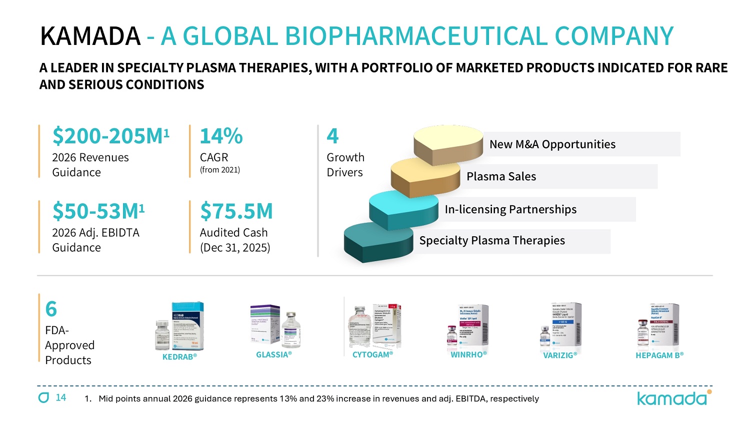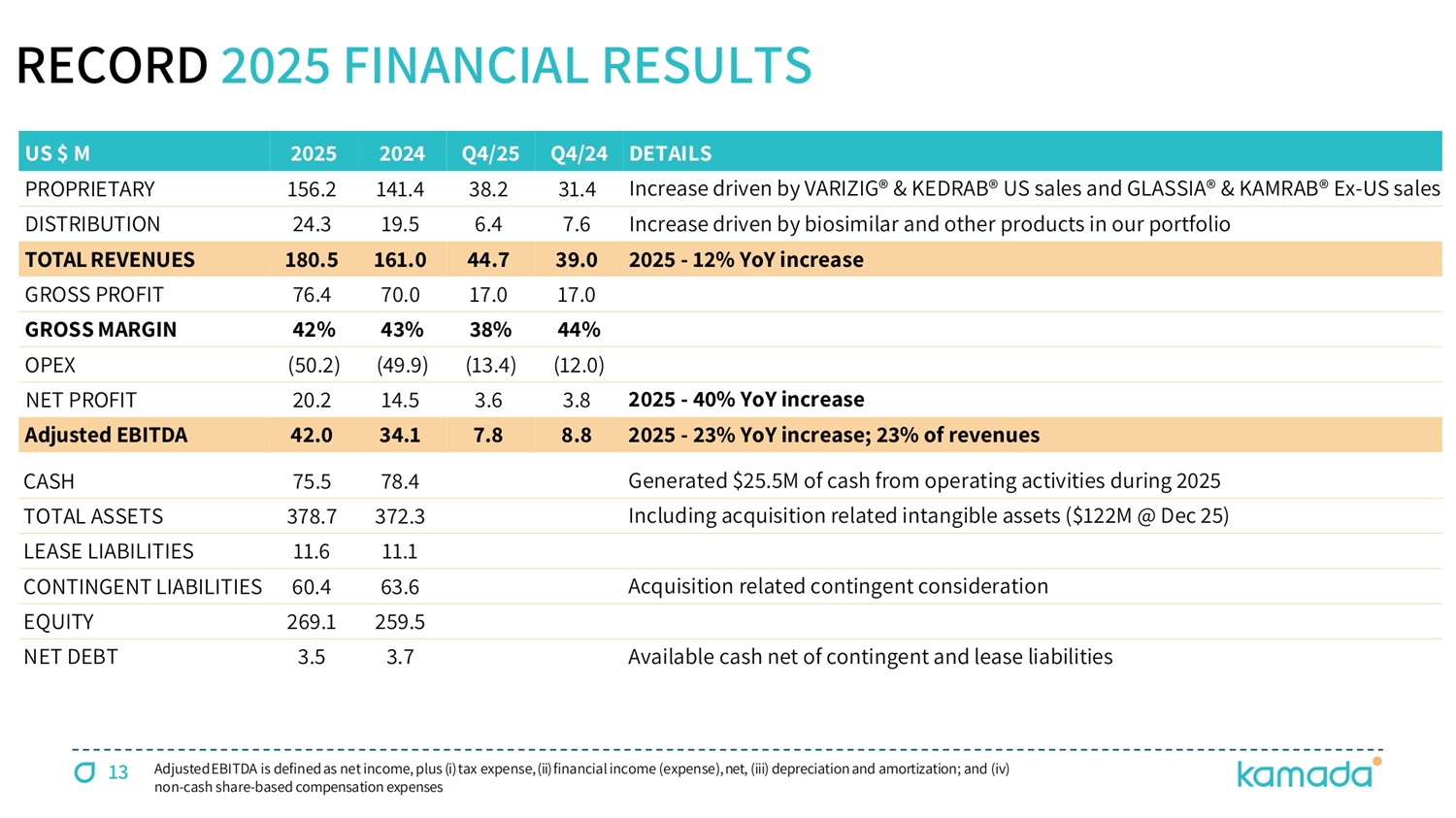 13 Adjusted EBITDA is defined as net income, plus ( i ) tax expense, (ii) financial income (expense), net, (iii) depreciation and amortization ; and (iv) non - cash share - based compensation expenses RECORD 2025 FINANCIAL RESULTS DETAILS Q 4 / 24 Q4/25 2024 2025 US $ M Increase driven by VARIZIG® & KEDRAB® US sales and GLASSIA® & KAMRAB® Ex - US sales 31.4 38.2 141.4 156.2 PROPRIETARY Increase driven by biosimilar and other products in our portfolio 7.6 6.4 19.5 24.3 DISTRIBUTION 2025 - 12% YoY increase 39.0 44.7 161.0 180.5 TOTAL REVENUES 17.0 17.0 70.0 76.4 GROSS PROFIT 44 % 38 % 43 % 42 % GROSS MARGIN ( 12.0 ) ( 13.4 ) ( 49.9 ) ( 50.2 ) OPEX 2025 - 40% YoY increase 3.8 3.6 14.5 20.2 NET PROFIT 2025 - 23% YoY increase; 23% of revenues 8.8 7.8 34.1 42.0 Adjusted EBITDA Generated $25.5M of cash from operating activities during 2025 78.4 75.5 CASH Including acquisition related intangible assets ($ 122 M @ Dec 25 ) 372.3 378.7 TOTAL ASSETS 11.1 11.6 LEASE LIABILITIES Acquisition related contingent consideration 63.6 60.4 CONTINGENT LIABILITIES 259.5 269.1 EQUITY Available cash net of contingent and lease liabilities 3.7 3.5 NET DEBT