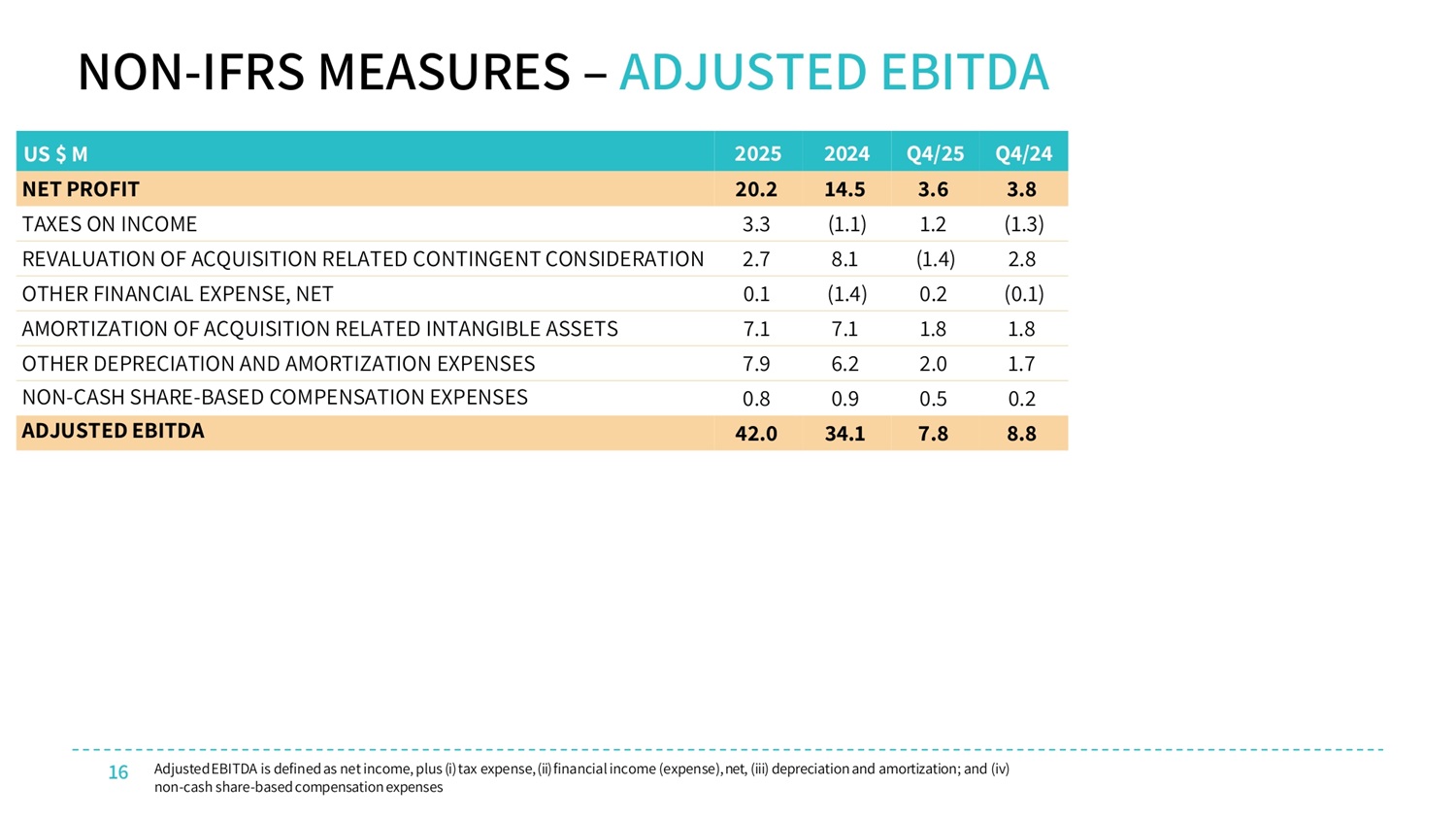 16 NON - IFRS MEASURES – ADJUSTED EBITDA Adjusted EBITDA is defined as net income, plus ( i ) tax expense, (ii) financial income (expense), net, (iii) depreciation and amortization ; and ( iv ) non - cash share - based compensation expenses Q4/24 Q4/25 2024 2025 US $ M 3.8 3.6 14.5 20.2 NET PROFIT ( 1.3 ) 1.2 ( 1.1 ) 3.3 TAXES ON INCOME 2.8 ( 1.4 ) 8.1 2.7 REVALUATION OF ACQUISITION RELATED CONTINGENT CONSIDERATION ( 0.1 ) 0.2 ( 1.4 ) 0.1 OTHER FINANCIAL EXPENSE, NET 1.8 1.8 7.1 7.1 AMORTIZATION OF ACQUISITION RELATED INTANGIBLE ASSETS 1.7 2.0 6.2 7.9 OTHER DEPRECIATION AND AMORTIZATION EXPENSES 0.2 0.5 0.9 0.8 NON - CASH SHARE - BASED COMPENSATION EXPENSES 8.8 7.8 34.1 42.0 ADJUSTED EBITDA