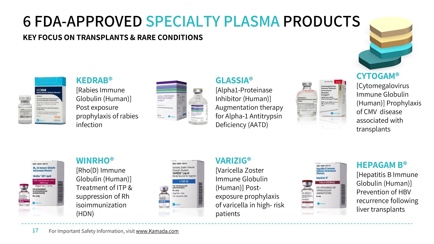 17 6 FDA - APPROVED SPECIALTY PLASMA PRODUCTS KEY FOCUS ON TRANSPLANTS & RARE CONDITIONS For Important Safety Information, visit www.Kamada.com CYTOGAM® [Cytomegalovirus Immune Globulin (Human)] Prophylaxis of CMV disease associated with transplants GLASSIA® [Alpha 1 - Proteinase Inhibitor (Human)] Augmentation therapy for Alpha - 1 Antitrypsin Deficiency (AATD) KEDRAB® [Rabies Immune Globulin (Human)] Post exposure prophylaxis of rabies infection HEPGAM B® [Hepatitis B Immune Globulin (Human)] Prevention of HBV recurrence following liver transplants VARIZIG® [Varicella Zoster Immune Globulin (Human)] Post - exposure prophylaxis of varicella in high - risk patients WINRHO® [Rho(D) Immune Globulin (Human)] Treatment of ITP & suppression of Rh isoimmunization (HDN)