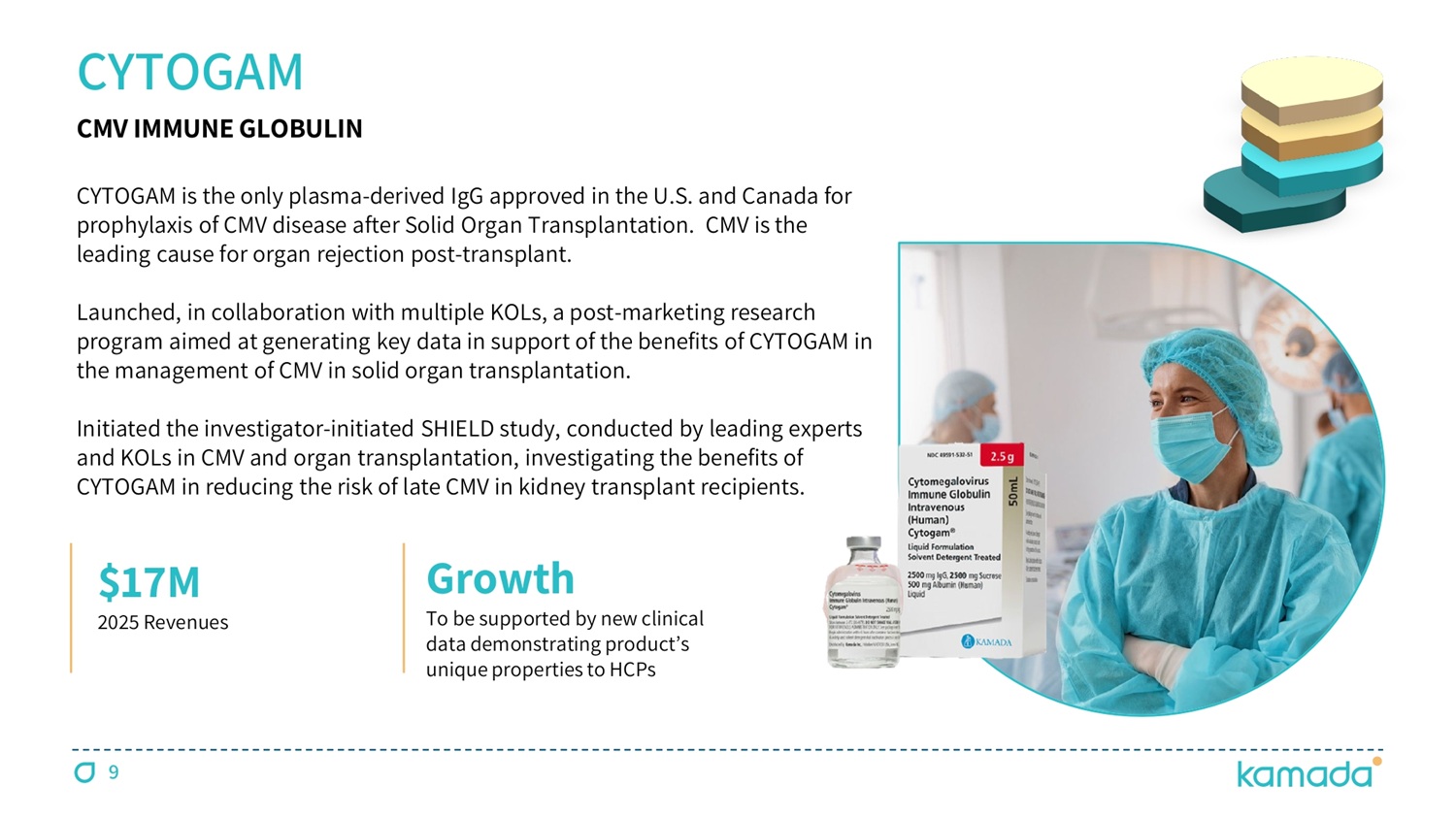 8 Licensed to Takeda in the USA, Canada, Australia and New Zealand Commencing in 2022 , Takeda is paying Kamada royalties, at a rate of 6 % through 2040 ; Projected royalties in the range of $ 10 M to $ 20 M per year Outside the Takeda territories, GLASSIA is marketed by Kamada through a network of partners and distributors . Key countries include Argentina, Switzerland, Russia, Israel, and other international markets . Sales in these territories is expected to continue growing, as result of better disease awareness and patients’ diagnosis . GLASSIA $ 16 M 2025 Royality form Takeda LIQUID AAT FOR THE TREATMENT OF AAT DEFICIENCY (AATD) $ 19 M 2025 Glassia sales incl. sales milestone; Up 27 % over 2024