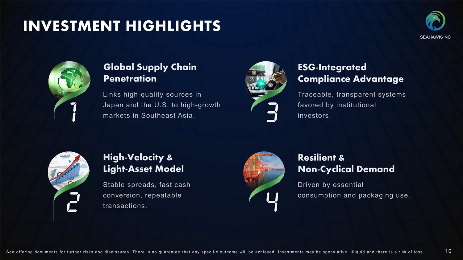 COMPETITIVE STRENGTHS 01 Optimal supply - demand matching Enhance transaction Efficiency Increase decision speed & profitability Integrate real - time data Reliable access to resources & demand Stable operations and recurring transactions Own broad & long - term supplier & customer base 02 Promote recycling & low - carbon practice Align with global sustainability goals Strong & stable demand f rom industry ‘ s counter - cyclical nature 03 Operate across East & Southeast Asia Focus on waste paper & scrap metal Diversify revenue sources Mitigate regional & market r isks 04 Decade of industry experience Ensure compliance & efficient operations Strong familiarity with Japanese regulation f ramework 05 Effective Proprietary Transaction Matching System Extensive & Stable Supply - Demand Network Alignment with Global Green & Sustainable Trends Product Diversification & Global Strategic Layout Experienced Team with Deep Industry Expertise SEAHAWK - INC 9 S ee of f ering doc um ent s f or f urt her r i s k s and dis c los ures . There i s no guarant ee t hat any s pec i f i c out c om e will be ac hieved. Inves t m ent s m ay be s pec ulat i ve, i l l iquid and t here i s a r i s k of los s .