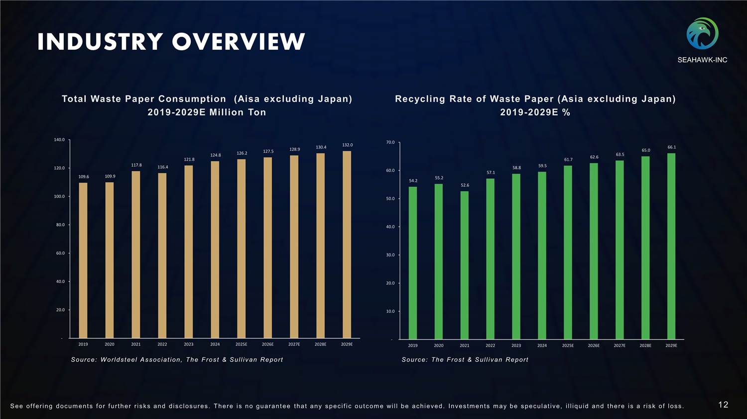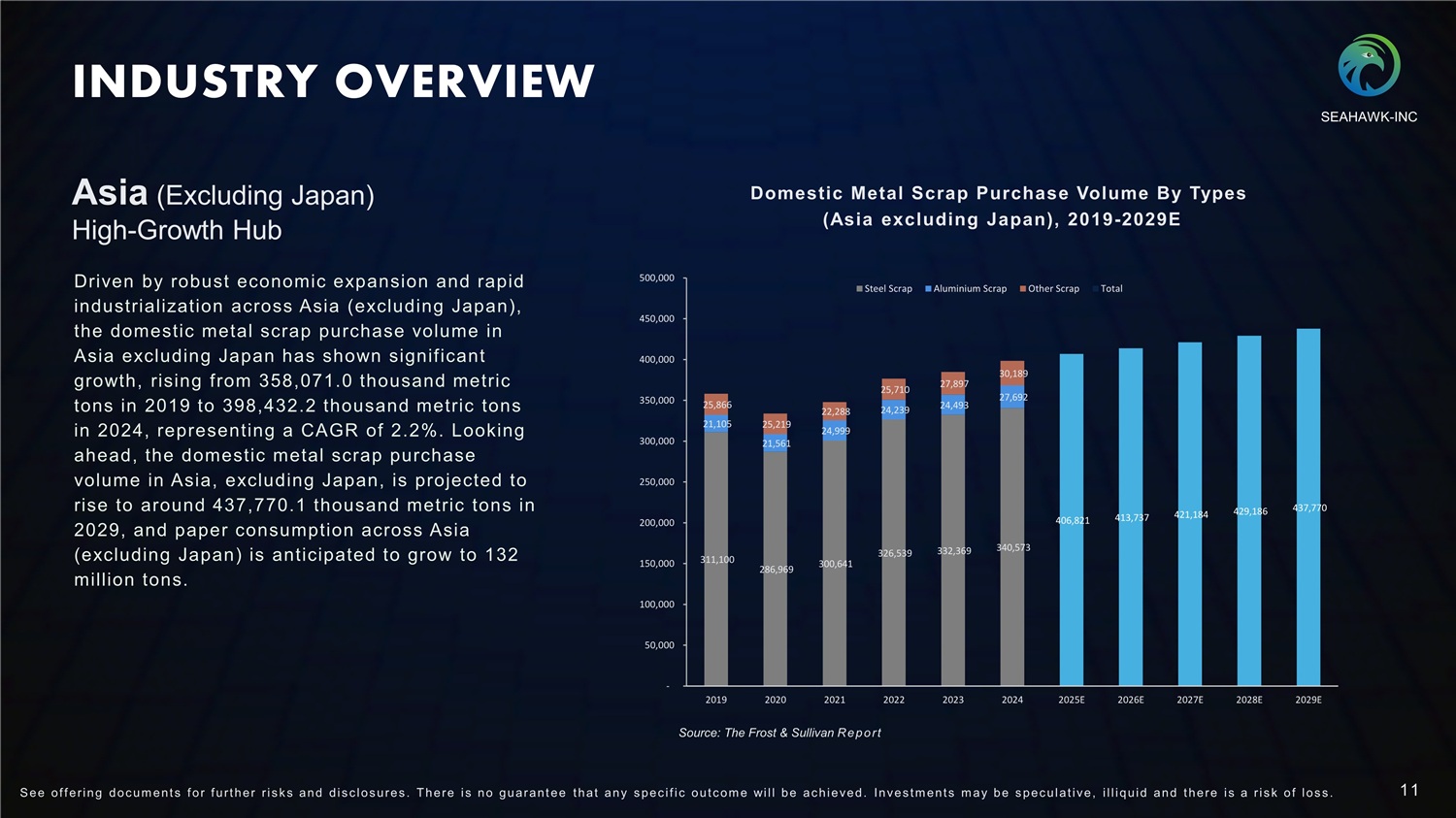 INDUSTRY OVERVIEW 311,100 286,969 300,641 326,539 332,369 340,573 21,105 21,561 24,999 24,239 24,493 27,692 25,866 25,219 22,288 25,710 27,897 30,189 406,821 413,737 421,184 429,186 437,770 100,000 50,000 - 150,000 200,000 250,000 300,000 350,000 400,000 450,000 500,000 2022 2023 2024 2025E 2026E 2027E 2028E 2029E Steel Scrap Aluminium Scrap Other Scrap Total Domestic Metal Scrap Purchase Volume By Types (Asia excluding Japan), 2019 - 2029E Driven by robust economic expansion and rapid industrialization across Asia (excluding Japan), the domestic metal scrap purchase volume in Asia excluding Japan has shown significant growth, rising from 358 , 071 . 0 thousand metric tons in 2019 to 398 , 432 . 2 thousand metric tons in 2024 , representing a CAGR of 2 . 2 % . Looking ahead, the domestic metal scrap purchase volume in Asia, excluding Japan, is projected to rise to around 437,770.1 thousand metric tons in 2029, and paper consumption across Asia (excluding Japan) is anticipated to grow to 132 million tons. Asia (Excluding Japan) High - Growth Hub 2019 2020 2021 Source: The Frost & Sullivan Report SEAHAWK - INC 11 S ee of f ering doc um ent s f or f urt her r i s k s and dis c los ures . There i s no guarant ee t hat any s pec i f i c out c om e will be ac hieved. Inves t m ent s m ay be s pec ulat i ve, i l l iquid and t here i s a r i s k of los s .
