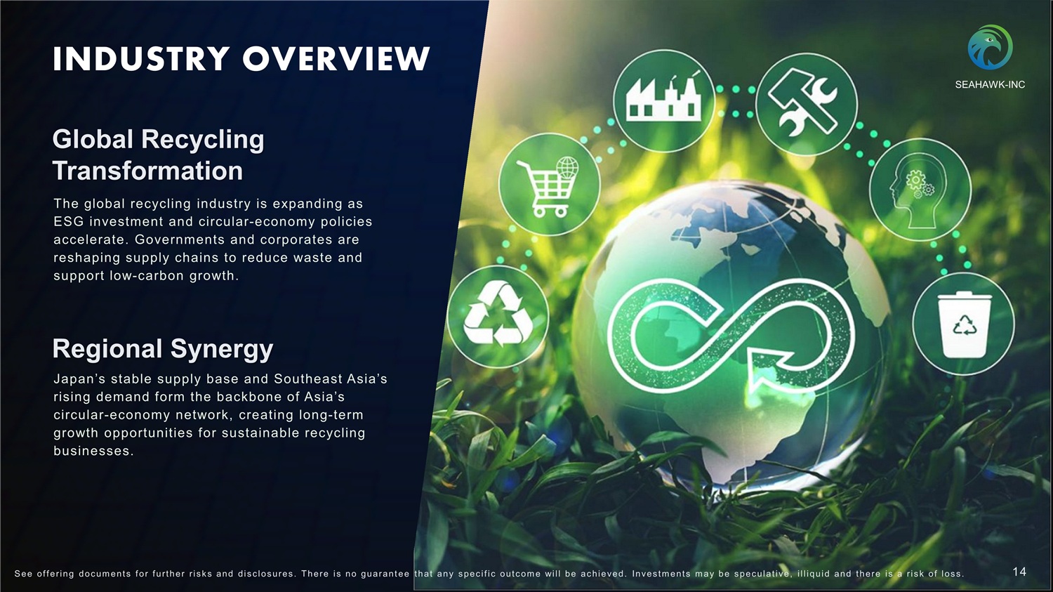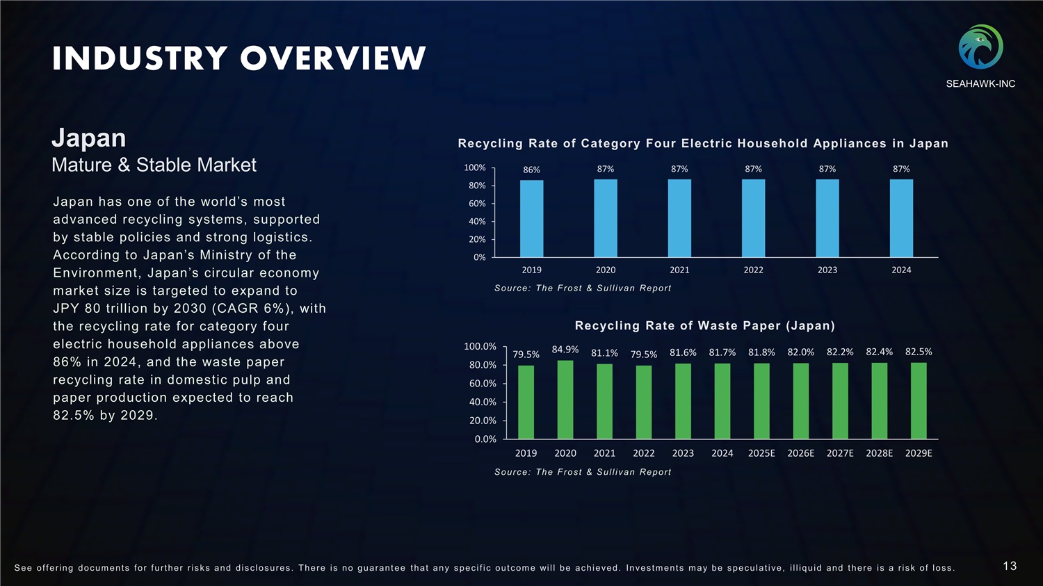 INDUSTRY OVERVIEW Japan has one of the world’s most advanced recycling systems, supported by stable policies and strong logistics. According to Japan’s Ministry of the Environment, Japan’s circular economy market size is targeted to expand to JPY 80 trillion by 2030 (CAGR 6%), with the recycling rate for category four electric household appliances above 86% in 2024, and the waste paper recycling rate in domestic pulp and paper production expected to reach 82 . 5 % by 2029 . Japan Mature & Stable Market 86% 87% 87% 87% 87% 87% 13 S ee of f ering doc um ent s f or f urt her r i s k s and dis c los ures . There i s no guarant ee t hat any s pec i f i c out c om e will be ac hieved. Inves t m ent s m ay be s pec ulat i ve, i l l iquid and t here i s a r i s k of los s . 100% 80% 60% 40% 20% 0% 2022 2023 2024 79.5% 84.9% 79.5% 81.1% 81.6% 81.7% 81.8% 82.0% 82.2% 82.4% 82.5% 100.0% 80.0% 60.0% 40.0% 20.0% 0.0% 2019 2020 2021 2022 2023 2024 2025E 2026E 2027E 2028E 2029E Source: The Frost & Sullivan Report 2019 2020 2021 Source: The Frost & Sullivan Report Recycling Rate of Category Four Electric Household Appliances in Japan Recycling Rate of Waste Paper ( Japan) SEAHAWK - INC