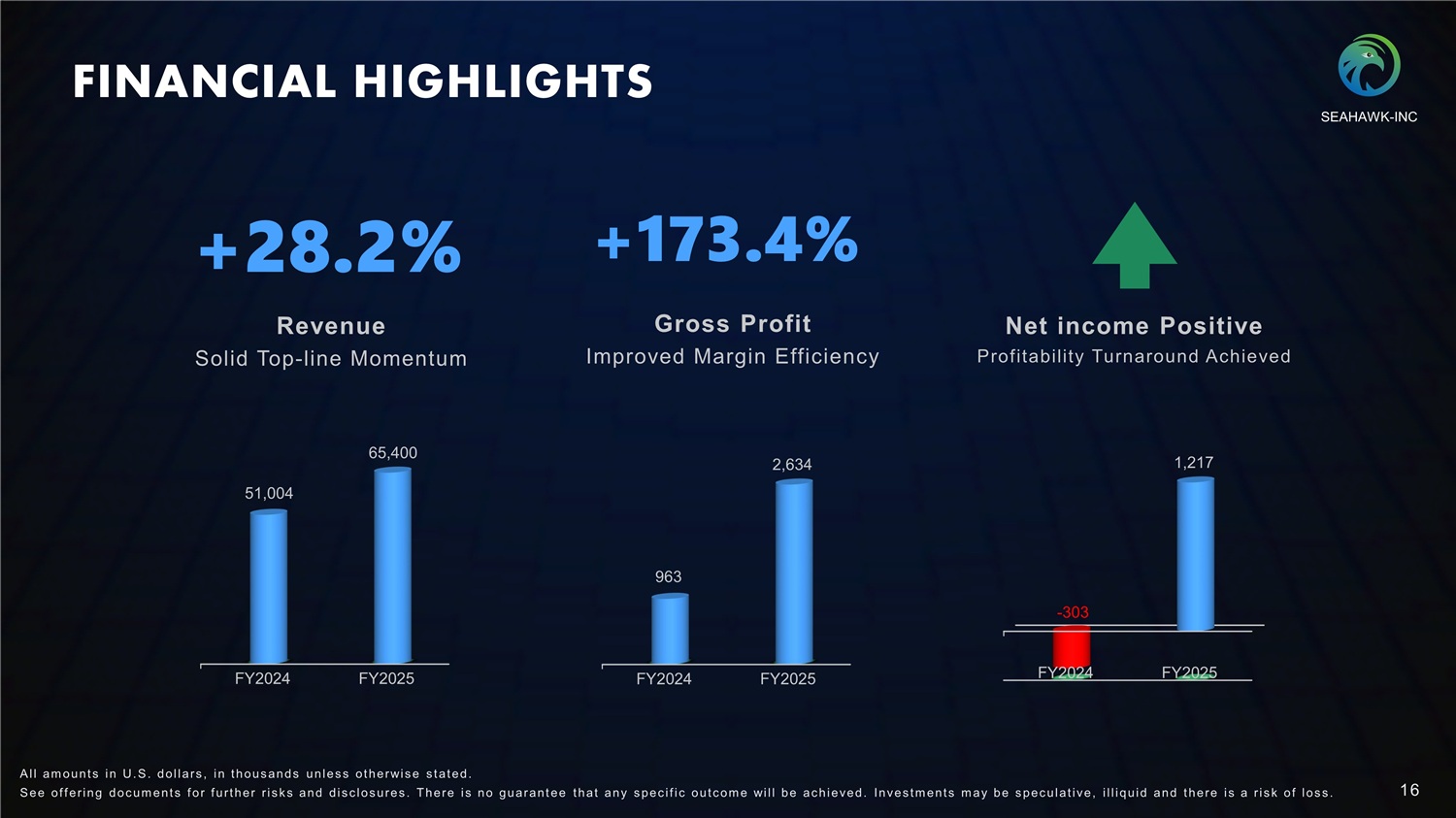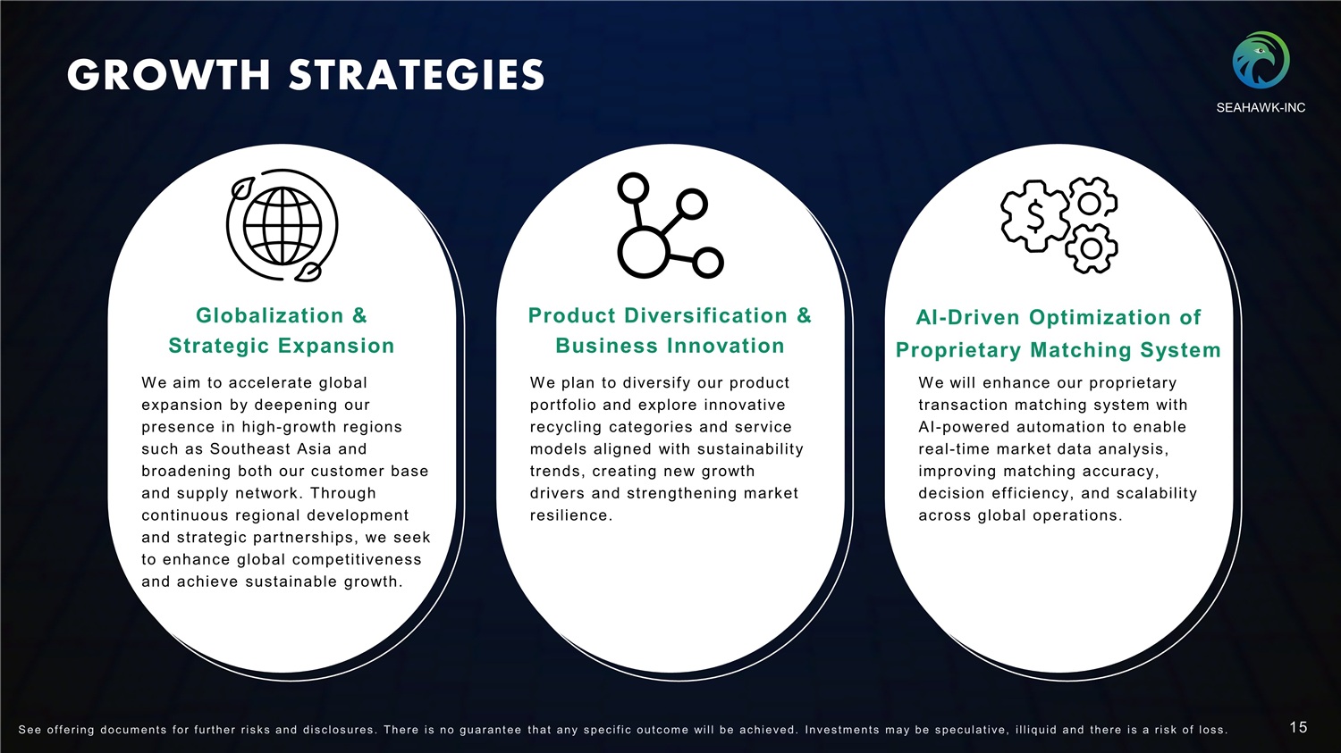 GROWTH STRATEGIES Globalization & Strategic Expansion We aim to accelerate global expansion by deepening our presence in high - growth regions such as Southeast Asia and broadening both our customer base and supply network. Through continuous regional development and strategic partnerships, we seek to enhance global competitiveness and achieve sustainable growth. Product Diversification & Business Innovation We plan to diversify our product portfolio and explore innovative recycling categories and service models aligned with sustainability trends, creating new growth drivers and strengthening market resilience . AI - Driven Optimization of Proprietary Matching System We will enhance our proprietary transaction matching system with AI - powered automation to enable real - t ime market data analysis, improving matching accuracy, decision efficiency, and scalability across global operations . SEAHAWK - INC 15 S ee of f ering doc um ent s f or f urt her r i s k s and dis c los ures . There i s no guarant ee t hat any s pec i f i c out c om e will be ac hieved. Inves t m ent s m ay be s pec ulat i ve, i l l iquid and t here i s a r i s k of los s .