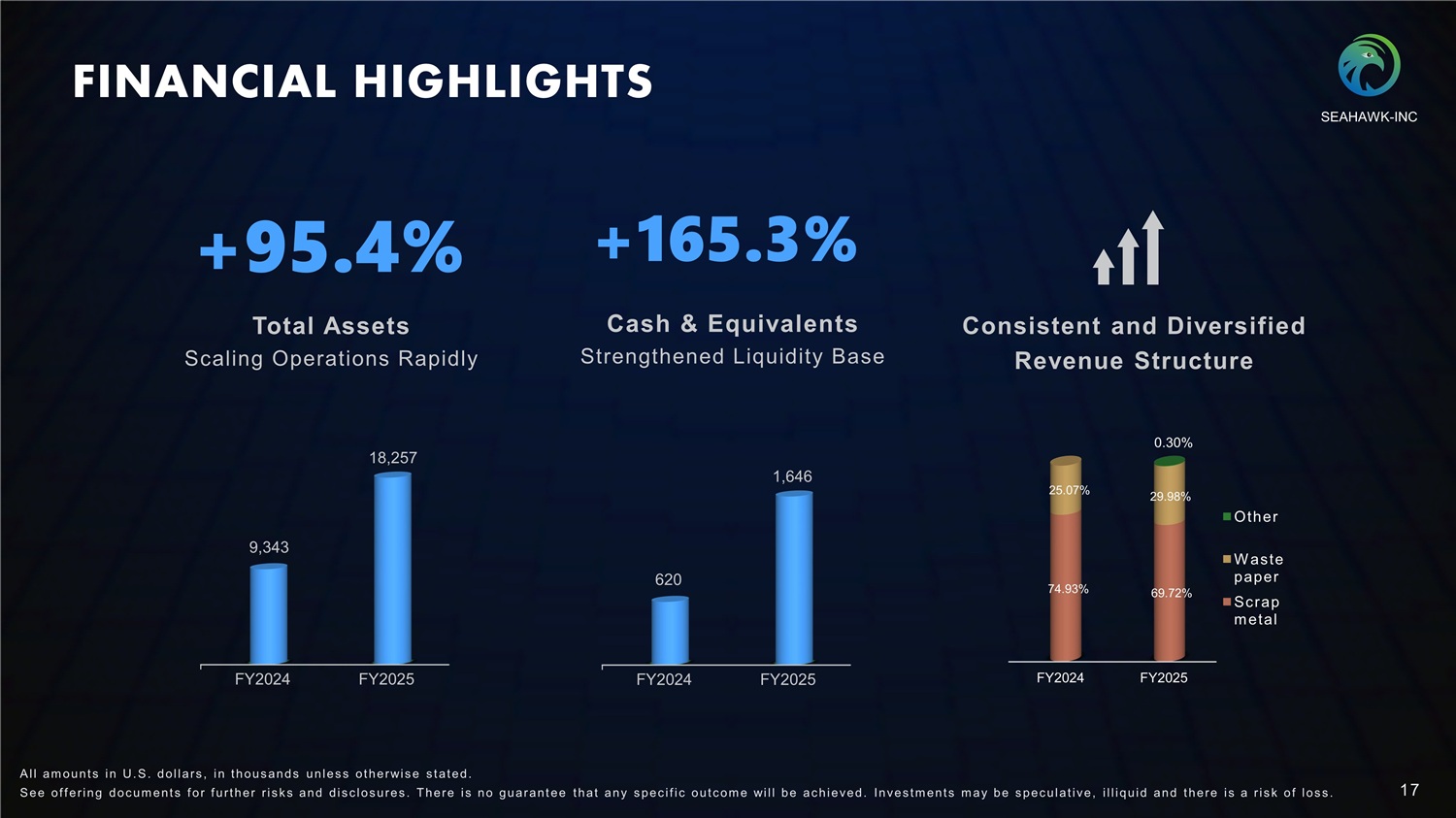 FINANCIAL HIGHLIGHTS +28.2% Revenue Solid Top - line Momentum FY2024 FY2025 51,004 65,400 +173.4% Gross Profit Improved Margin Efficiency FY2024 FY2025 963 2,634 Net income Positive Profitability Turnaround Achieved FY2024 FY2025 - 303 1,217 SEAHAWK - INC A l l am ount s in U. S . dollars , in t hous ands unles s ot herwis e s t at ed. S ee of f ering doc um ent s f or f urt her r i s k s and dis c los ures . There i s no guarant ee t hat any s pec i f i c out c om e will be ac hieved. Inves t m ent s m ay be s pec ulat i ve, i l l iquid and t here i s a r i s k of los s . 16