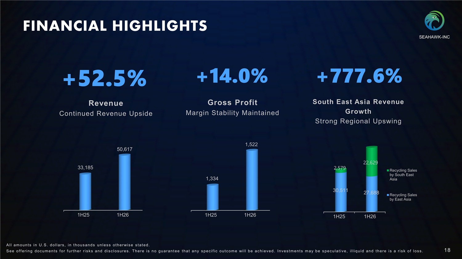 FINANCIAL HIGHLIGHTS +95.4% Total Assets Scaling Operations Rapidly +165.3% Cash & Equivalents Strengthened Liquidity Base Consistent and Diversified Revenue Structure FY2024 FY2025 9,343 18,257 FY2024 FY2025 620 1,646 FY2024 FY2025 74.93% 69.72% 25.07% 29.98% 0.30% Other W aste paper Scrap metal SEAHAWK - INC A l l am ount s in U. S . dollars , in t hous ands unles s ot herwis e s t at ed. S ee of f ering doc um ent s f or f urt her r i s k s and dis c los ures . There i s no guarant ee t hat any s pec i f i c out c om e will be ac hieved. Inves t m ent s m ay be s pec ulat i ve, i l l iquid and t here i s a r i s k of los s . 17
