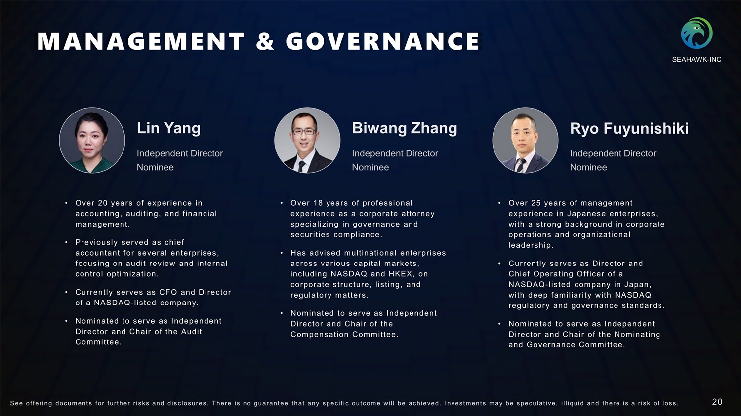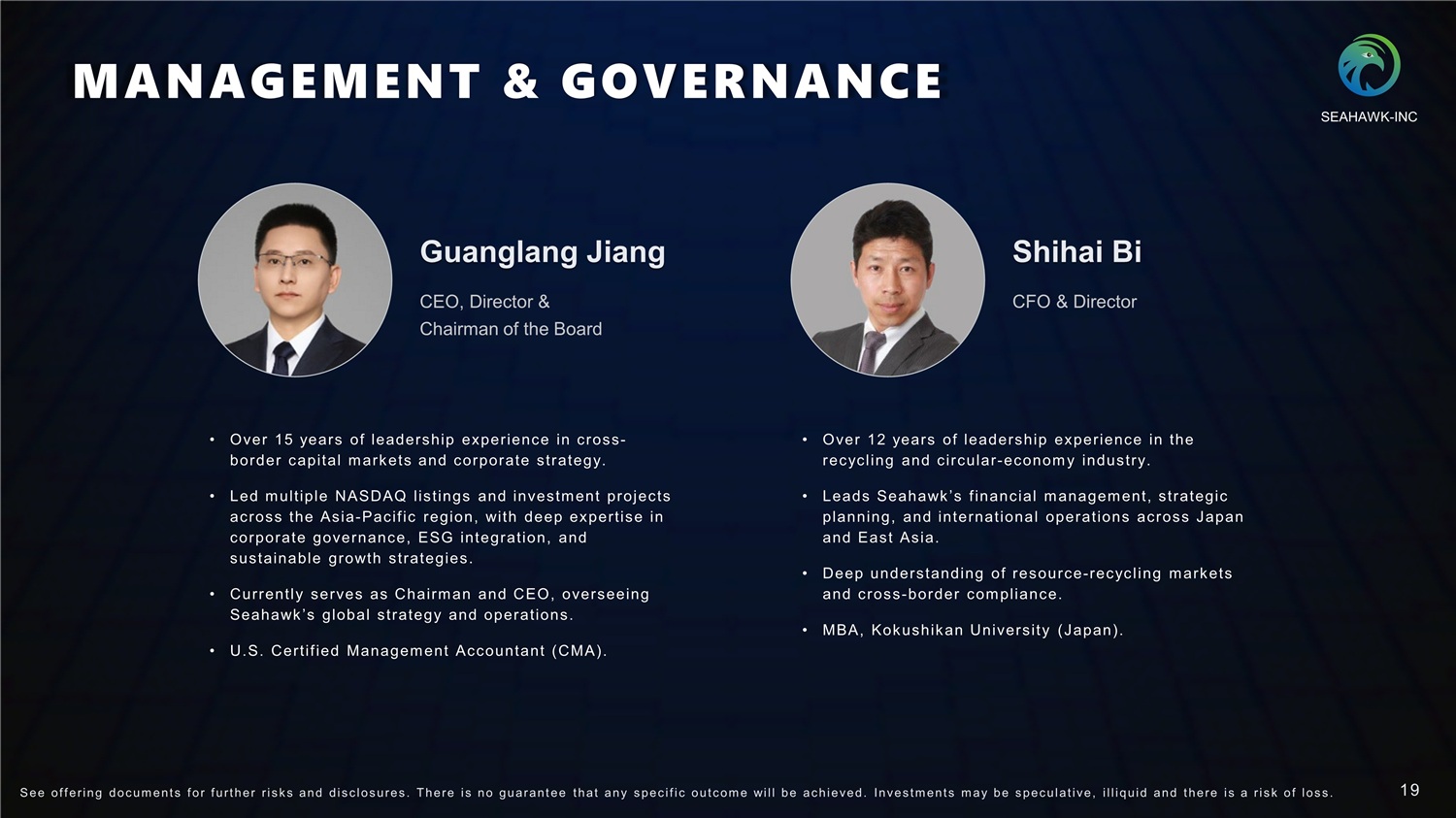 MANAGEMENT & GOVERNANCE Guanglang Jiang CEO, Director & Chairman of the Board • Over 15 years of leadership experience in cross - border capital markets and corporate strategy. • Led multiple NASDAQ l istings and investment projects across the Asia - Pacific region, with deep expertise in corporate governance, ESG integration, and sustainable growth strategies. • Currently serves as Chairman and CEO, overseeing Seahawk’ s global strategy and operations. • U.S. Certified Management Accountant ( CMA). Shihai Bi CFO & Director • Over 12 years of leadership experience in the recycling and circular - econom y industry. • Leads Seahawk’ s f inancial management, strategic planning, and international operations across Japan and East Asia. • Deep understanding of resource - recycling markets and cross - border compliance. • MBA, Kokushikan University ( Japan). SEAHAWK - INC 19 S ee of f ering doc um ent s f or f urt her r i s k s and dis c los ures . There i s no guarant ee t hat any s pec i f i c out c om e will be ac hieved. Inves t m ent s m ay be s pec ulat i ve, i l l iquid and t here i s a r i s k of los s .