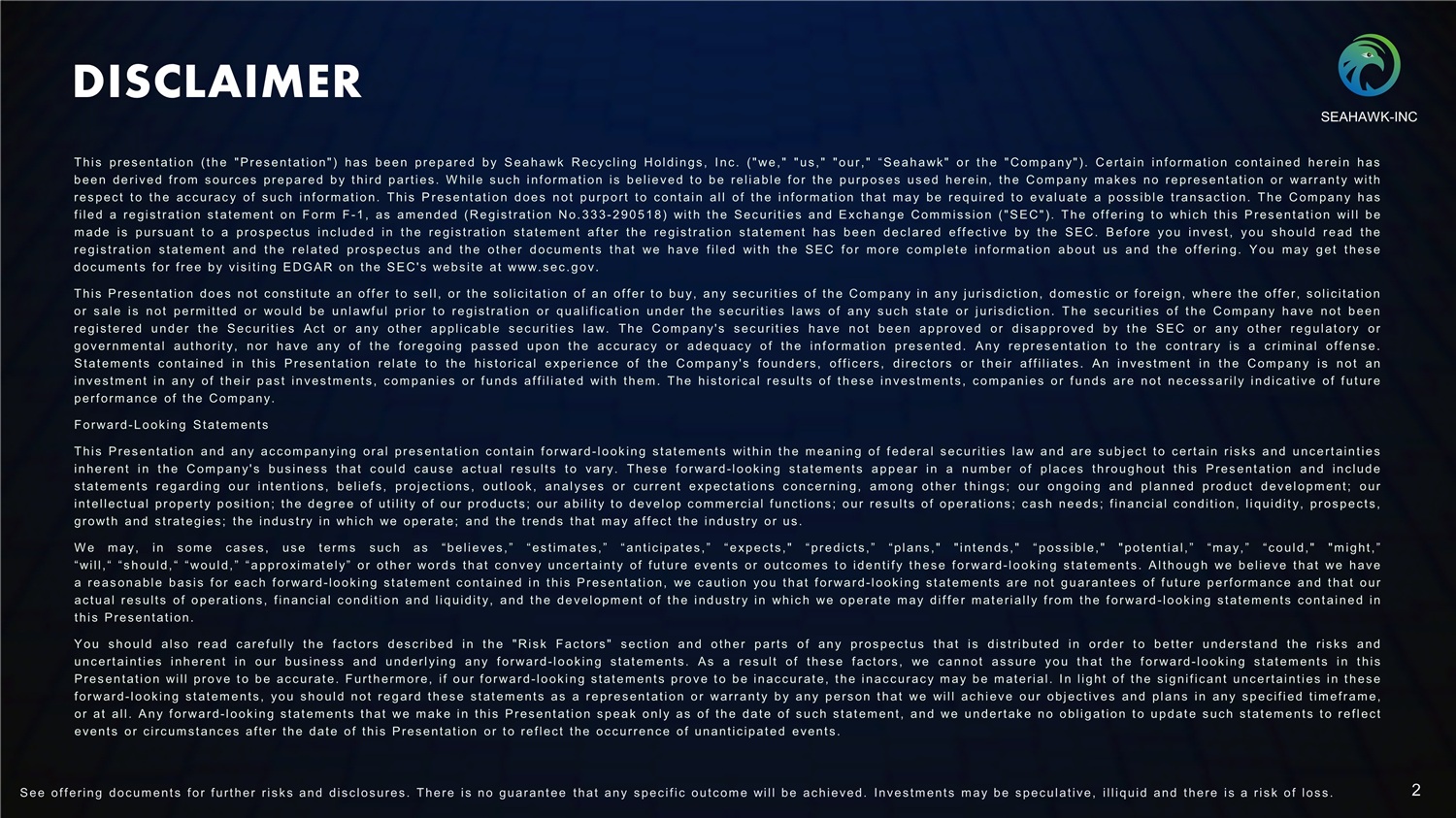 DISCLAIMER SEAHAWK - INC This p r es e nt at i o n ( t h e " P r es e nt at i o n") has b ee n pre p ared by S ea ha w k R ecycli n g H o l d i n gs , I nc . ( " w e , " " us , " " o ur, " “ S e ah a w k " o r t h e " Co m p a ny" ) . C e r t ai n in f orm at io n c o nt a i ne d he rei n h as b ee n de r i v e d f r o m s o ur c es pre pared b y t hir d p art i es . W hile such i nf orm at i on i s b el iev e d to b e reli a b l e f o r th e p u r p os es us ed h e r ein, th e C o m pa ny m ak es no repres ent at i o n o r warr a nt y wit h res pec t to th e ac c u rac y of such i nf orm at io n . This P r es e nt at i o n d oes n ot p urpo r t to c o nt a i n all of t h e i nf o rm at ion t h at m a y be req uired to ev a l u at e a p os s ibl e t ra ns ac t i o n . T he C o m pa n y h as f il e d a regis t rat i on s t at eme nt o n F orm F - 1 , as a m en d ed ( R e g i s t r at i on No . 3 33 - 2 90 51 8 ) wit h t h e S ec urit i e s a nd E x c ha ng e Comm issio n ( " SEC" ) . T he of f eri n g to whic h t h i s P res e nt at i on will b e m ade i s p urs u ant to a p r o s pec t us inc lud e d i n t h e regis t rat io n s t a t e m e nt af t e r th e regis t rat i on s t at e m ent has b ee n d ec l a r ed ef f ec t i ve b y th e SEC . B ef o r e yo u in vest , y ou s ho u l d r e ad t he regis t rat io n s t at e m e nt a nd th e r e l at ed p r os p ec t us a nd t h e ot h e r d oc u m ent s t h at w e h av e f il e d wit h th e SE C fo r m o r e c o m plet e i nf orm at io n a bo ut us a nd t h e of f eri n g . Yo u m ay g et t h es e doc u m ent s f o r f ree by v i s i t ing E DG A R on t he SEC' s webs i t e at www . s ec . g ov . This P res e nt a t io n do es n ot c ons t i t ut e a n of f e r to s ell, o r th e s olic i t at i o n of a n of f e r to b uy, a ny s ec urit i es o f th e Co m p an y i n a ny juris dic t i o n, d o m es t i c o r f o r eig n, wh ere th e of f er, s olic i t a t i o n o r s ale i s n ot pe rm i t t ed o r w o ul d be u n l a wf u l pri o r to regis t rat ion o r q u alif i c at i o n un d e r t h e s ec urit i es l a w s of a ny s uc h s tate o r j u ris dic t i o n . T he s ec urit i es of t h e C o m pa n y ha v e n ot b ee n regis t ere d u nd er t h e S ec urit i es A c t o r a ny ot h e r a pplic a bl e s ec urit i es l a w . Th e C o m pa ny' s s ec urit i es h av e n ot be e n a pprov e d o r dis ap pro ve d b y t he S E C o r a ny o t h er reg ul at o r y o r g ov e r n m ent a l a ut ho r i t y, n o r ha v e an y of t he f o r e g o i ng p asse d u po n t h e ac c u r ac y o r a de q uac y o f th e inf orm at i o n p r es e nt e d . An y re p r es e nt at io n to t he c ont r a r y i s a c r im inal of f e ns e . S t at e m ent s c o nt a i ne d i n t h i s P res e nt at io n r e l at e to t he h i s t o r i c a l e xp eri enc e of th e C o m pa n y ' s f o und e rs , of f i c er s , dir ec t or s o r t h eir af f i l i at es . An i n ves t m e nt i n t h e Co m p an y i s n ot an inv es t m ent i n a ny of t h eir p as t in v es t m ent s , c o m p ani es o r f u nds af f i l i at e d wit h t h e m . The h i s t oric a l r es ult s of t h es e i n v es t m ent s , c o m pani es o r f u nds a r e n ot n ecessa r i l y i n d i c at i v e of f ut u r e perf orm anc e of t he Co m pany . Forward - L ook in g S t at em ent s This P res e nt a t io n a nd a ny ac c o m pa nyi n g o r a l p r es en t at i o n c o nt ain f o r wa r d - l o ok ing s t at e m ent s w i t hin t h e m eani n g of f e deral s ec u r i t ies l a w a nd a r e s u b j ec t to c ert ain r isks a nd u nc ert ain t ie s inhere nt i n t he C o m p an y ' s bus i nes s t h at c oul d ca u se ac t u a l res ult s to va ry . Thes e f o r wa r d - l o ok in g s t at e m ent s a pp e ar i n a nu m ber of plac es t h ro ug h ou t t h i s P res e nt at io n a nd i n c lud e s t at e m e nt s reg ardi n g o u r int en t io ns , b elief s , p r o j ec t io ns , o ut l o ok , an a l y s es o r c urr e nt e xp ec t at io ns c on c e r nin g, a m on g ot h e r t h i n gs ; ou r on g oi n g an d pl an ned p ro duc t d ev e l o p m ent ; o u r int ellec t u a l p r op e r t y p os i t i o n ; t h e d egre e of ut ilit y of o u r p r o duc t s ; o u r a bility to d ev e l o p c omm er c ial f u nc t io ns ; o u r res ult s o f o perat i ons ; cash n ee ds ; f in a nc i a l c on dit i o n, l i qui dit y, pr osp e c t s , growt h and s t rat egies ; t he indus t ry i n whic h w e operat e ; and t he t rends t hat m ay af f ec t t he indus t ry o r us . W e m ay, i n s o m e case s , us e t erm s such as “ b eli ev es , ” “ es t im at es , ” “ a nt i c ip at es , ” “expec t s , " “ p r e dic t s , ” “ p l a ns , " " i nt en ds , " “ p os s ible, " " po te nti a l , ” “ m ay, ” “ c o u l d, " " m ight , ” “ will,“ “ s h o uld, “ “ woul d, ” “ a ppro xim at ely” o r ot h e r wo r ds t h at c on ve y unc ert a i nt y of f ut u r e ev e nt s o r o ut c o m es to ide nt i f y t h es e f o r wa r d - l o ok in g s t at e m ent s . A l t h o ugh w e b el i e ve t h at w e ha v e a reas on abl e b as i s f o r e ac h f orwa rd - lo ok i ng s t at e m ent c o nt ain ed i n t h i s P r es e nt at i on, w e c a ut i on yo u t h at f orwa rd - l ook i n g s t at e m ent s a r e n ot g uara nt e es of f ut u r e p erf orm anc e a nd t h at o u r ac t u a l r es ult s of o perat i on s , f ina nc ial c on dit i o n an d l i q uidit y, a nd t h e de v e l op m e nt of t h e i nd us t r y i n whic h w e o perat e m ay dif f e r mat eri ally f r o m t he f orwa rd - l o ok i n g s t at e m en t s c ont a i n e d i n t h i s P res ent at ion . Yo u s ho uld a l s o rea d c a r ef ully t h e f ac t or s d es c r ibe d i n t h e " Ris k Fac t or s " sect io n a nd o t h er p art s o f an y p r os p ec t us t h at i s d i s t r ib ut e d i n o r d e r to b e tter u nd ers t a nd th e r isks a nd u nc ert a i nt i es i nh e r e nt i n o u r b us in es s an d u 