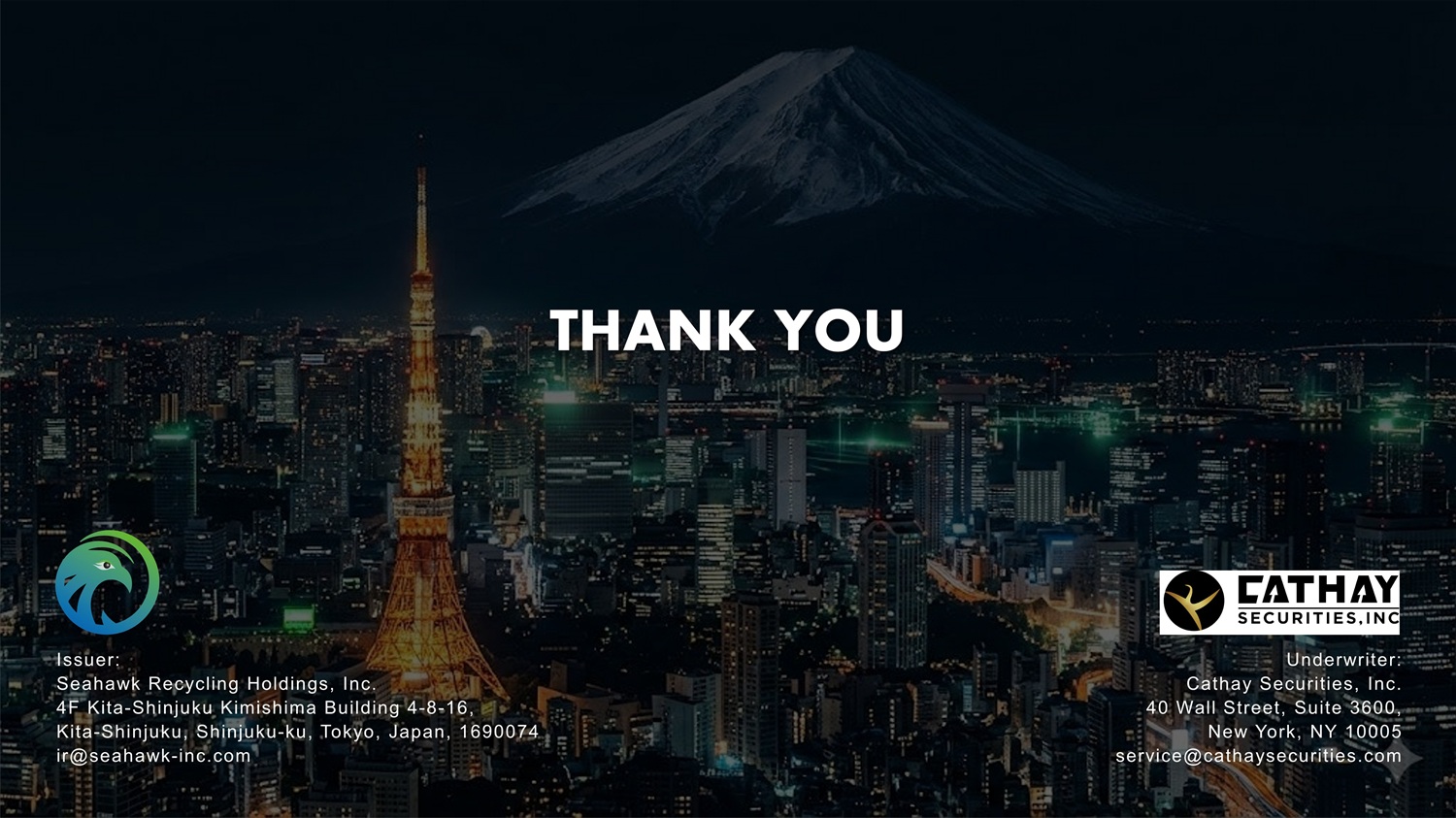 THANK YOU Underwriter: Cathay Securities, Inc. 40 Wall Street, Suite 3600, New York, NY 10005 service@cathaysecurities.com Issuer: Seahawk Recycling Holdings, Inc. 4F Kita - Shinjuku Kimishima Building 4 - 8 - 16, Kita - Shinjuku, Shinjuku - ku, Tokyo, Japan, 1690074 ir@seahawk - inc.com