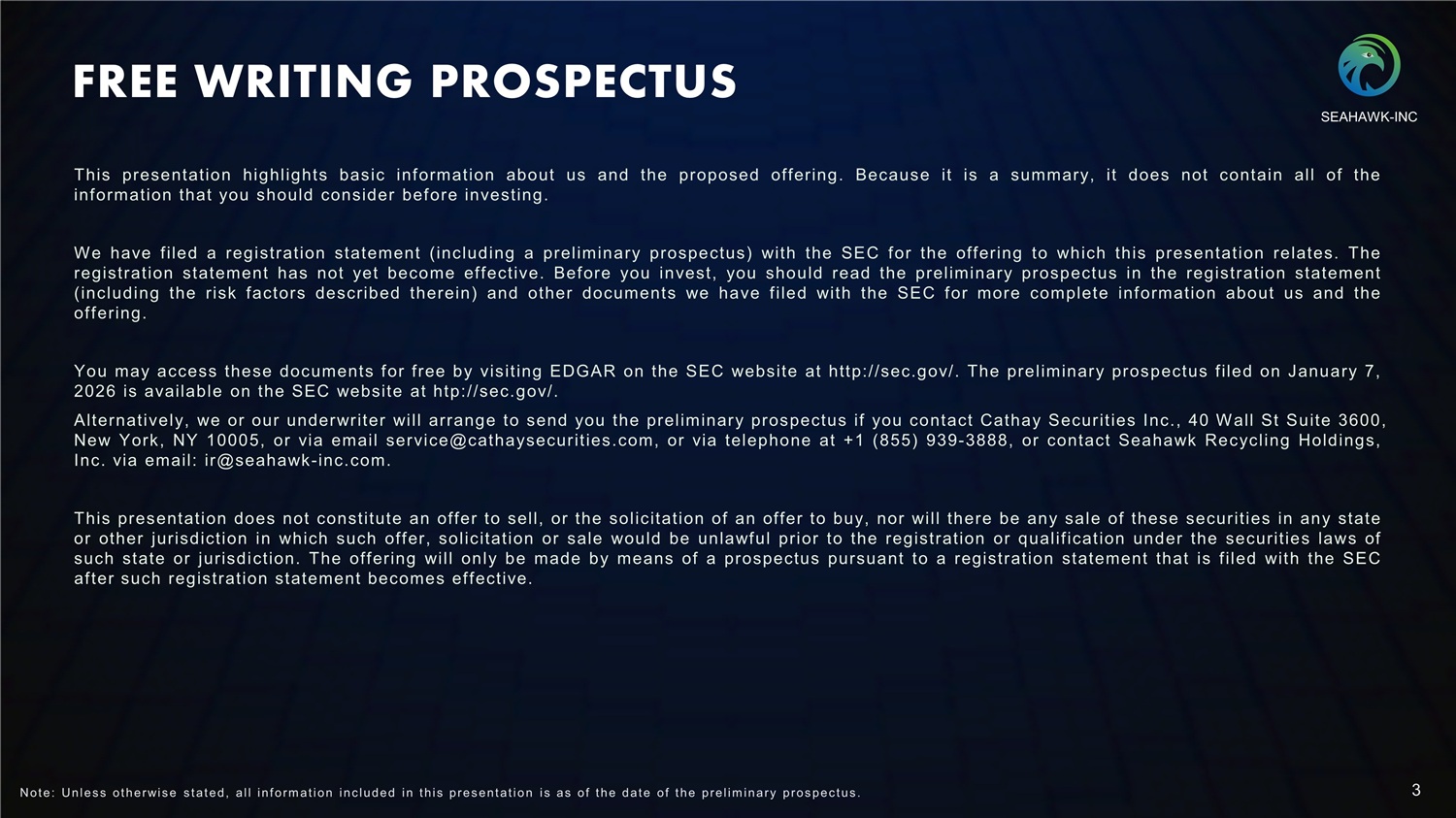 FREE WRITING PROSPECTUS SEAHAWK - INC This presentation highlights basic information about us and the proposed offering . Because it is a summary, it does not contain all of the information that you should consider before investing . W e ha v e filed a registration statement ( including a preliminary prospectus) with the SEC for the offering t o which this presentation relates . The registration statement ha s no t yet be c o m e effective . Before y o u invest, y o u should read the preliminary prospectus in t h e registration statement ( including the risk factors described therein) an d o t he r do c u m en t s we h a v e f iled with the SEC for m o r e complete information ab o u t u s an d the offering . You may access these documents for free by visiting EDGAR on the SEC website at http://sec.g ov/. The preliminary prospectus filed on January 7, 2026 is available on the SEC website at htp:// sec. gov/. Alternatively, we or our underwriter will arrange to send you the preliminary prospectus if you contact Cathay Securities Inc., 40 Wall St Suite 3600 , New York, NY 10005, or via email service@cathaysecurities. com, or via telephone at + 1 ( 855) 939 - 3888, or contact Seahawk Recycling Holdings, Inc. via email: ir@seahawk - inc. com. This presentation d o e s no t constitute a n offer t o sell, o r the solicitation o f a n offer t o buy, no r will there b e a n y sale o f these securities in a n y state o r other jurisdiction in which s u c h offer, solicitation o r sale would b e unlawful prior t o the registration o r qualification u nd e r the securities laws of s u c h state o r jurisdiction . The offering will only b e m ad e b y m ean s o f a prospectus pu r s u a n t t o a registration statement that is f iled with the SEC after s u c h registration statement be c o m e s effective . 3 Not e: Unles s ot herwis e s t at ed, all inf orm at ion inc luded in t his pres ent at io n i s as of t he dat e of t he prelim inary pros pec t us .
