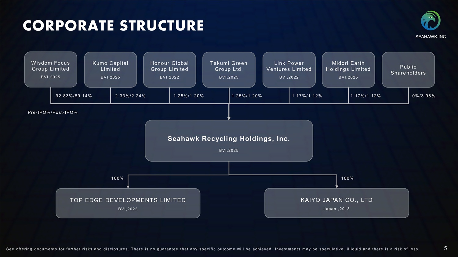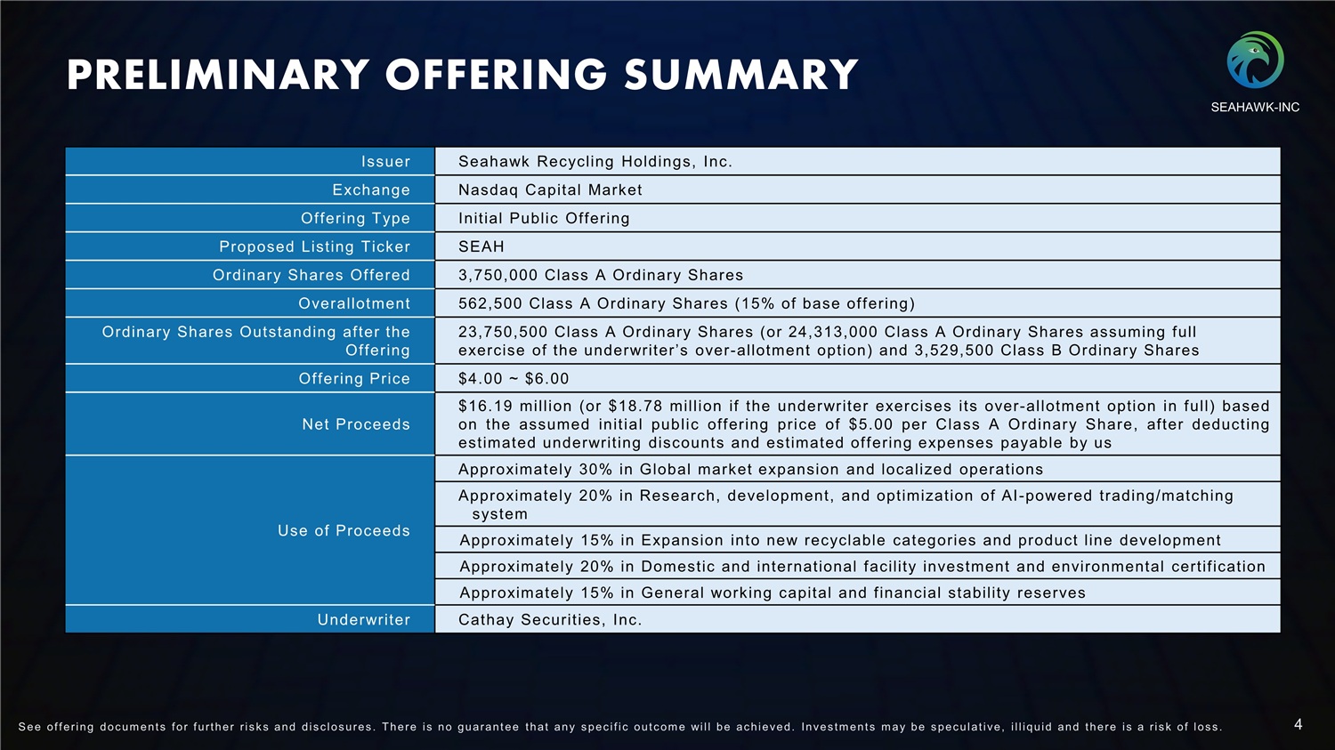 PRELIMINARY OFFERING SUMMARY Seahawk Recycling Holdings, Inc. Issuer Nasdaq Capital Market Exchange Initial Public Offering Offering Type SEAH Proposed Listing Ticker 3, 750, 000 Class A Ordinary Shares Ordinary Shares Offered 562, 500 Class A Ordinary Shares ( 15% of base offering) Overallotment 23, 750, 500 Class A Ordinary Shares ( or 24, 313, 000 Class A Ordinary Shares assuming full exercise of the underwriter’s over - allotment option) and 3, 529, 500 Class B Ordinary Shares Ordinary Shares Outstanding after the Offering $4. 00 ~ $6. 00 Offering Price $ 16 . 1 9 million ( o r $ 18 . 7 8 million i f the underwriter exercises its over - allotment option in full) ba s e d o n the a ss u m e d initial public offering price o f $ 5 . 0 0 pe r Class A Ordinary Share, after deducting estimated underwriting discounts an d estimated offering e x pen s e s payable b y us Net Proceeds Approximately 30% in Global market expansion and localized operations Use of Proceeds Approximately 20% in Research, development, and optimization of AI - powered trading/ matching system Approximately 15% in Expansion into new recyclable categories and product line development Approximately 20% in Domestic and international facility investment and environmental certification Approximately 15% in General working capital and f inancial stability reserves Cathay Securities, Inc. Underwriter SEAHAWK - INC 4 S ee of f ering doc um ent s f or f urt her r i s k s and dis c los ures . There i s no guarant ee t hat any s pec i f i c out c om e will be ac hieved. Inves t m ent s m ay be s pec ulat i ve, i l l iquid and t here i s a r i s k of los s .